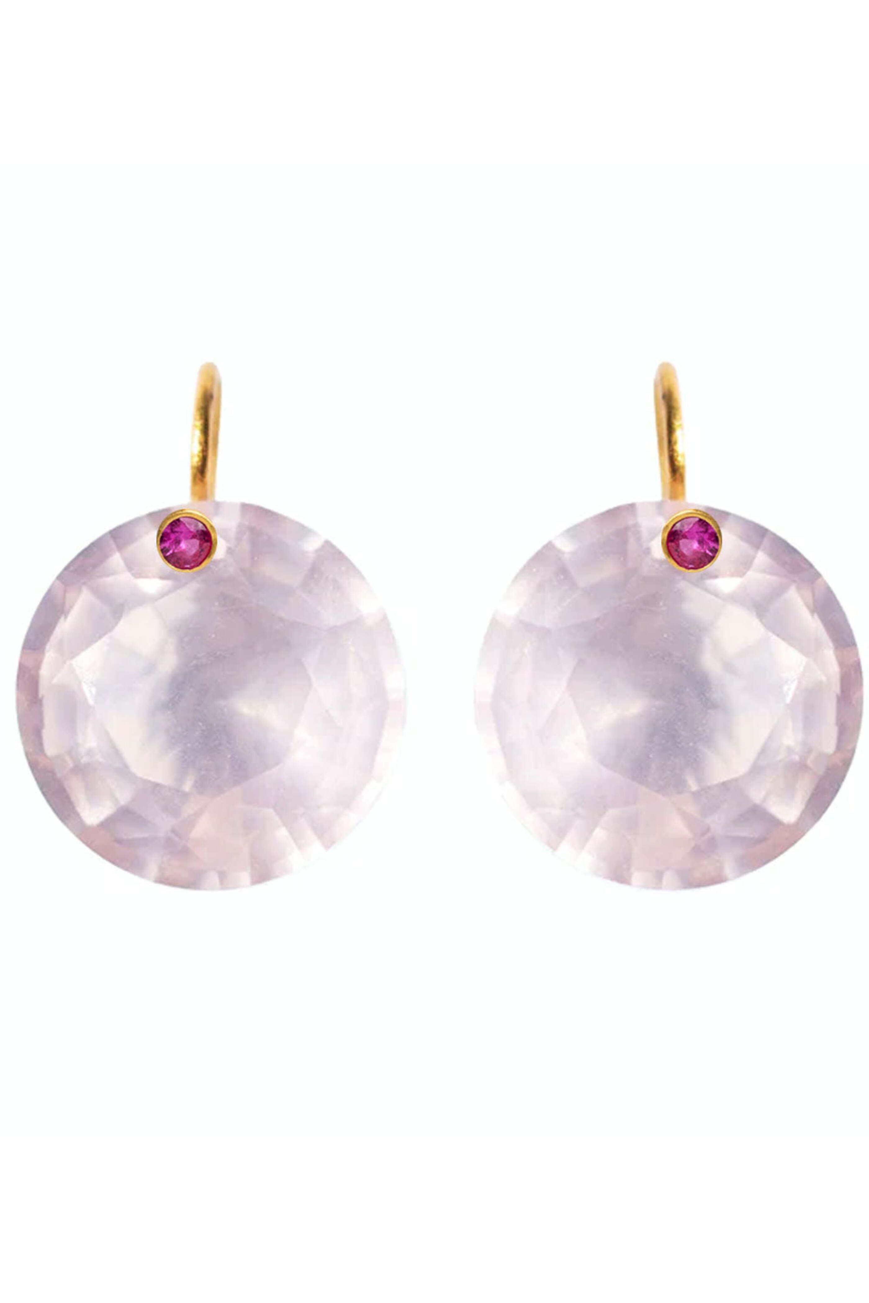 22k yellow gold. Pink quartz. Pink sapphire. Single stone drop. Bezel set sapphire at the top. Wire back. 18mm D. 1.02 L.