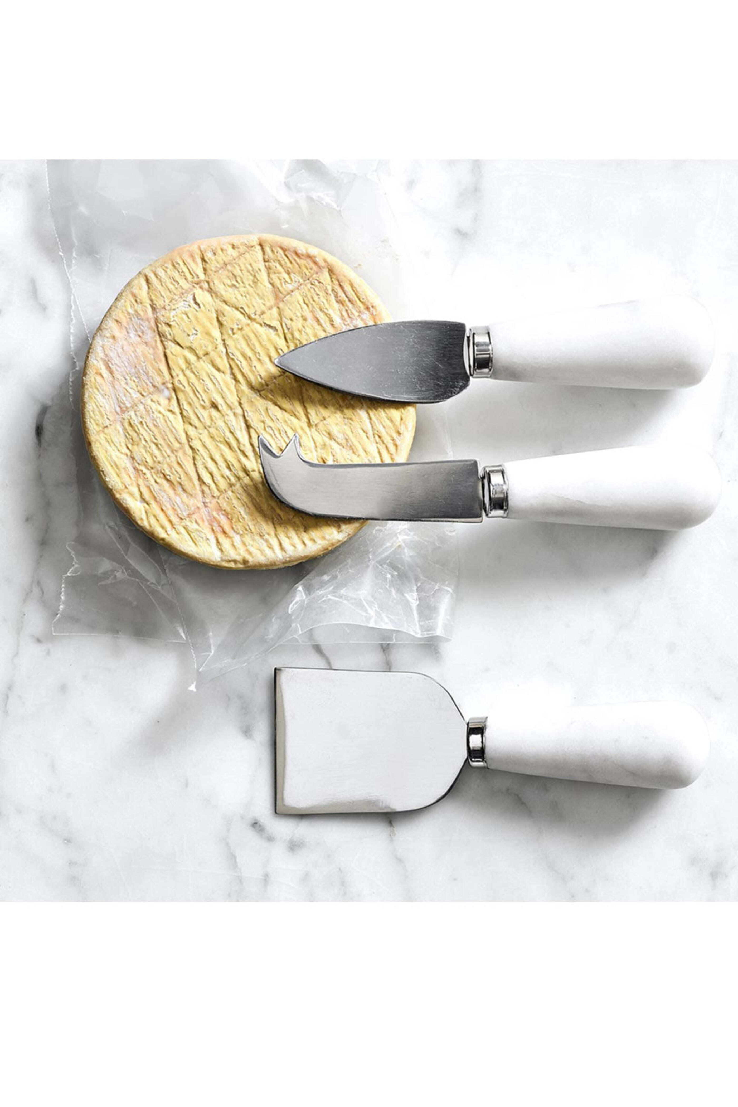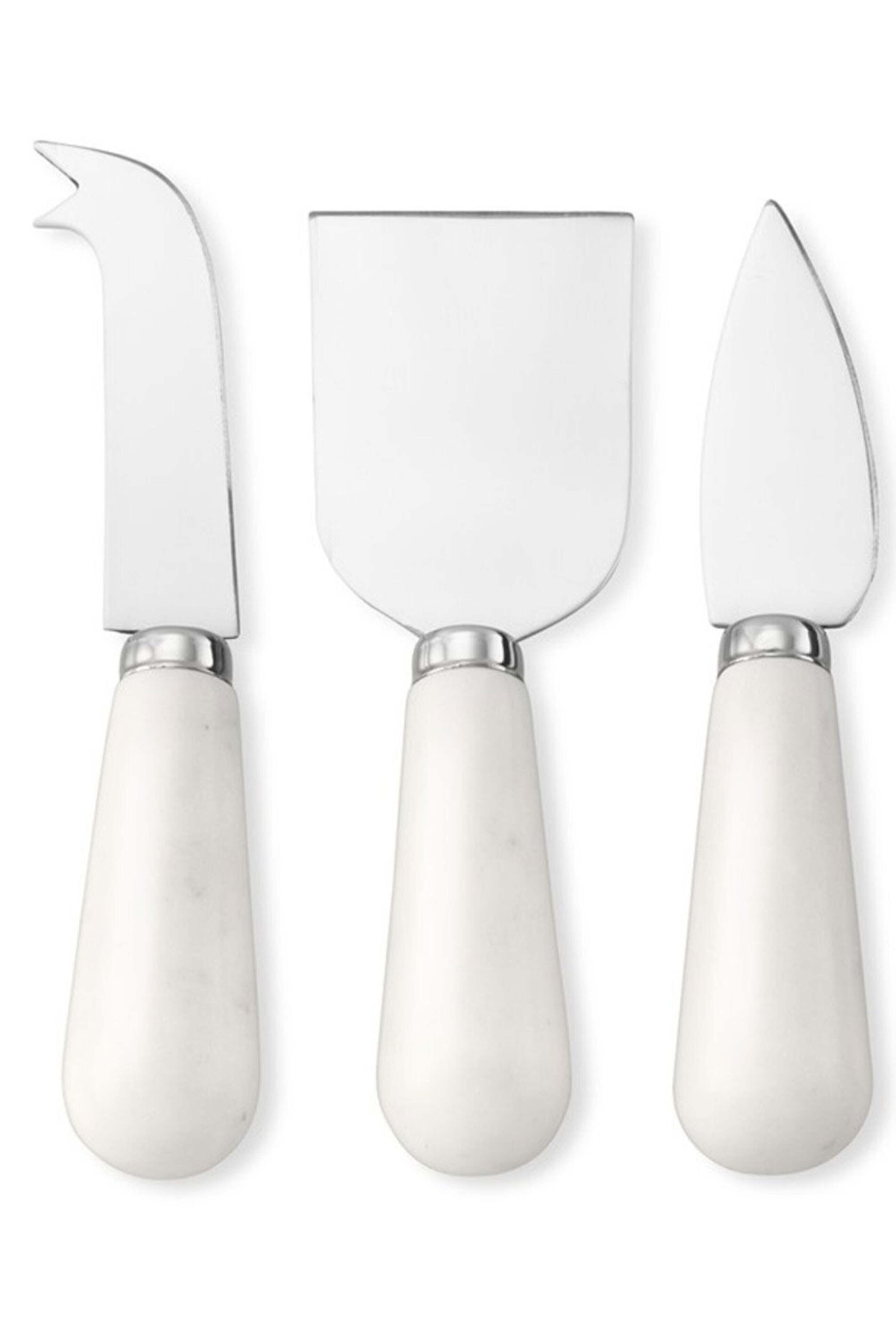 Zodax Marble Cheese Knives Set. Set of three includes a pronged knife for spearing and serving cheese, a flat cheese knife for serving and breaking up hard cheese, and a pointed, tear-shaped knife for crumbling and spreading cheese. Handcrafted by skilled artisans. Variations in the color and veining of each piece of marble. Durable, polished stainless-steel blades. 13 to 14 cm long. Hand-wash.