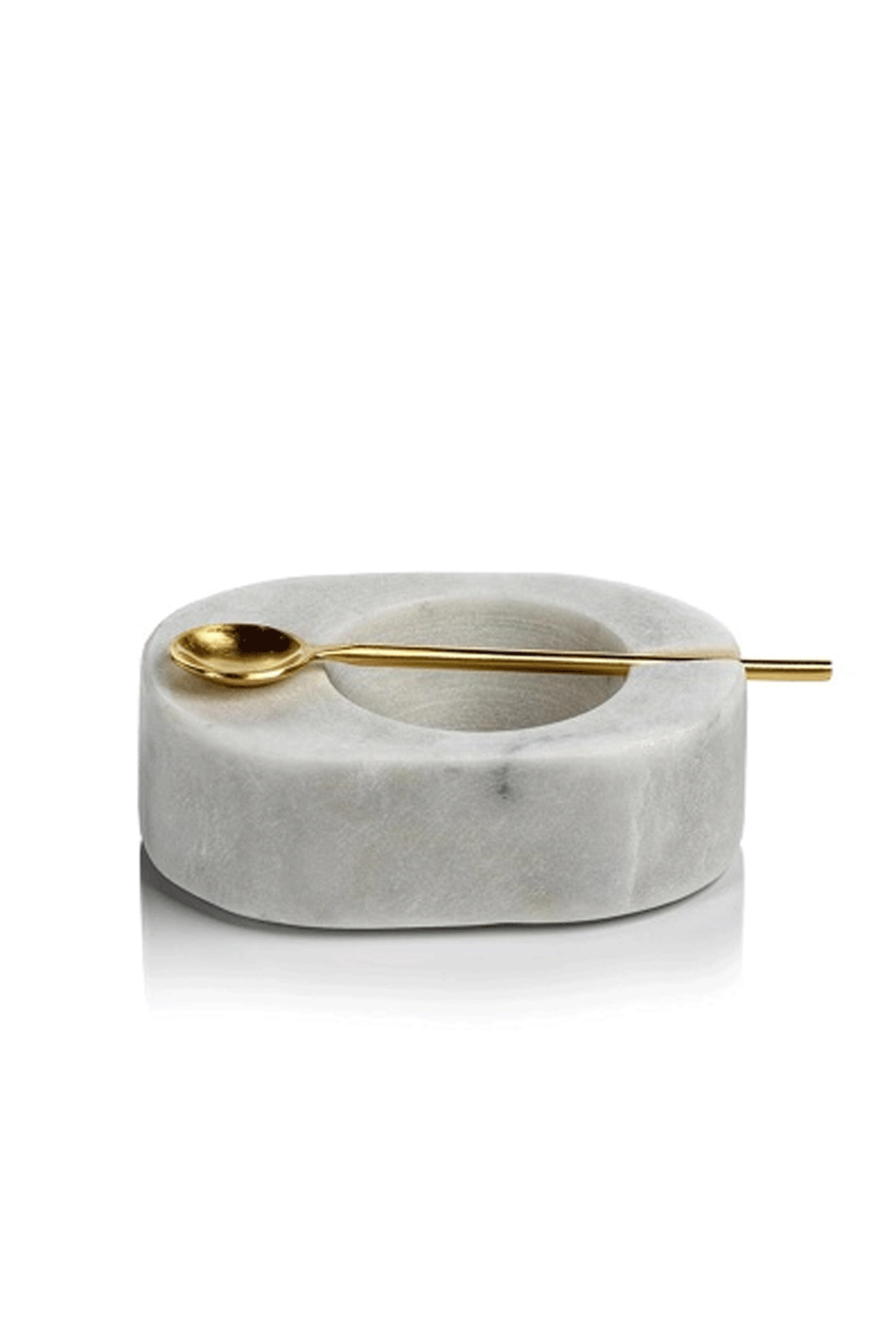 Introducing the Tuscan Marble Salt & Pepper Bowl with Gold Spoon, a stunning addition to your table setting. Available in grey and white marble, this handcrafted set brings a touch of sophistication to your dining experience. Each handcrafted bowl showcases unique patterns, while the accompanying gold spoon adds a touch of luxury. Elevate your dining experience with this stylish and functional ensemble.. White and Grey sold separately - choose from options above. Dimensions: 4" x 1.75" x 1.25".