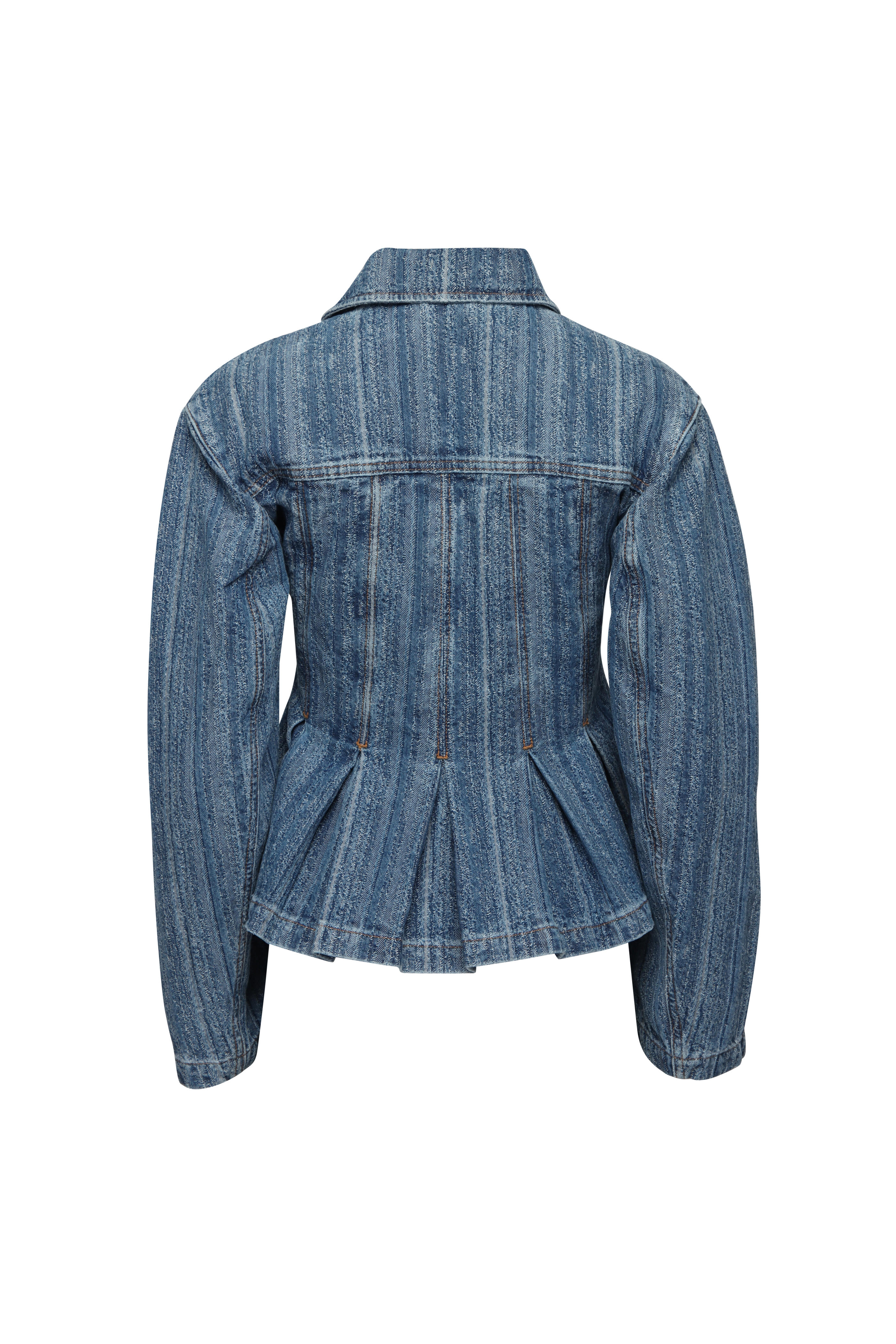 Collar. Long sleeves; tapered cuffs. Button up front closure. Chest flap pockets; button closure. Pleated peplum silhouette. Denim fabrication. Imported. 100% organic cotton. Machine washable.