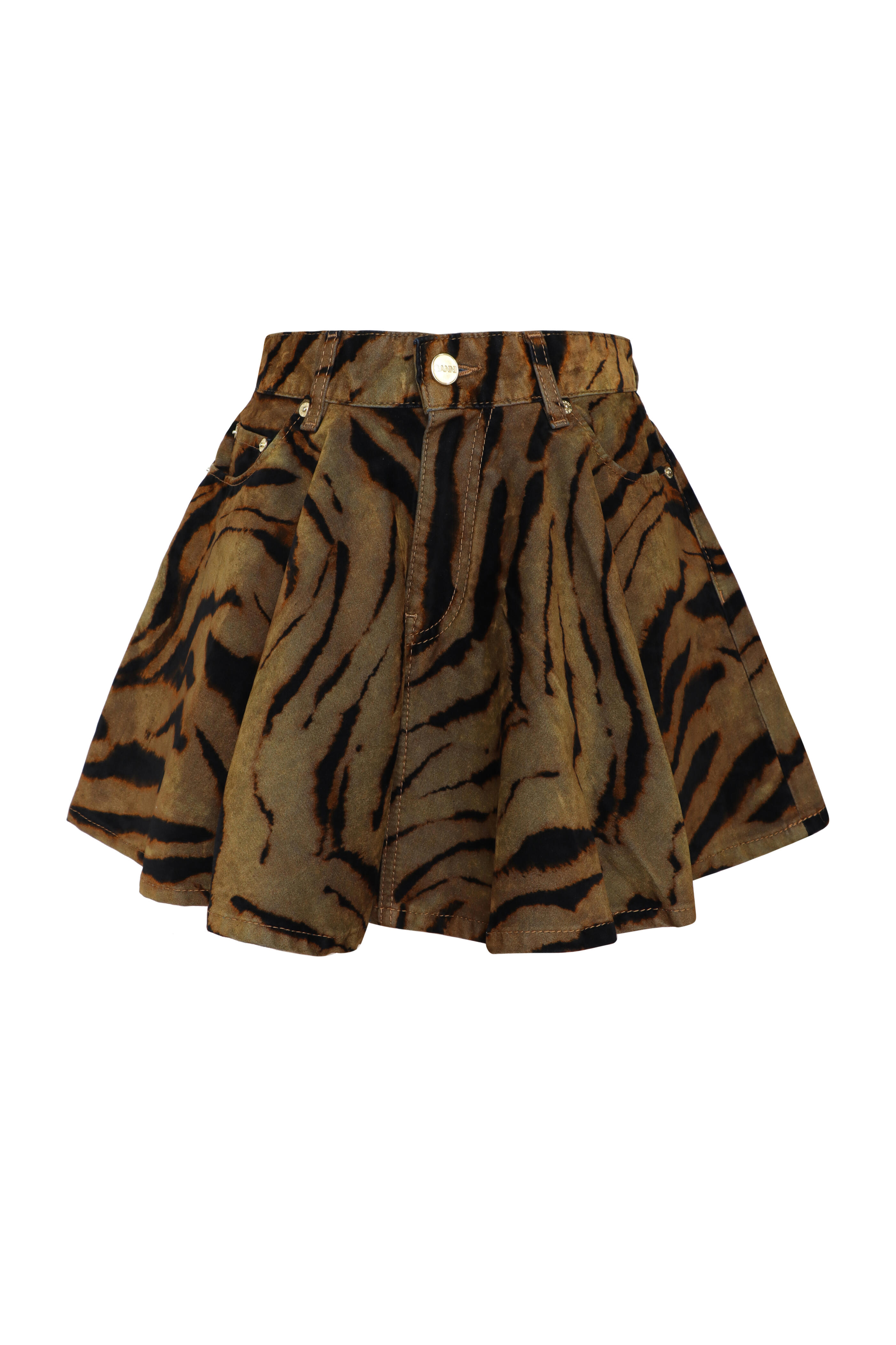 Mid rise. Button closure. Zip fly. Belt loops. Front slip pockets. Aline silhouette. Imported. Mini length. 61% recycled cotton, 20% viscose, 19% recycled polyester. Dry clean.