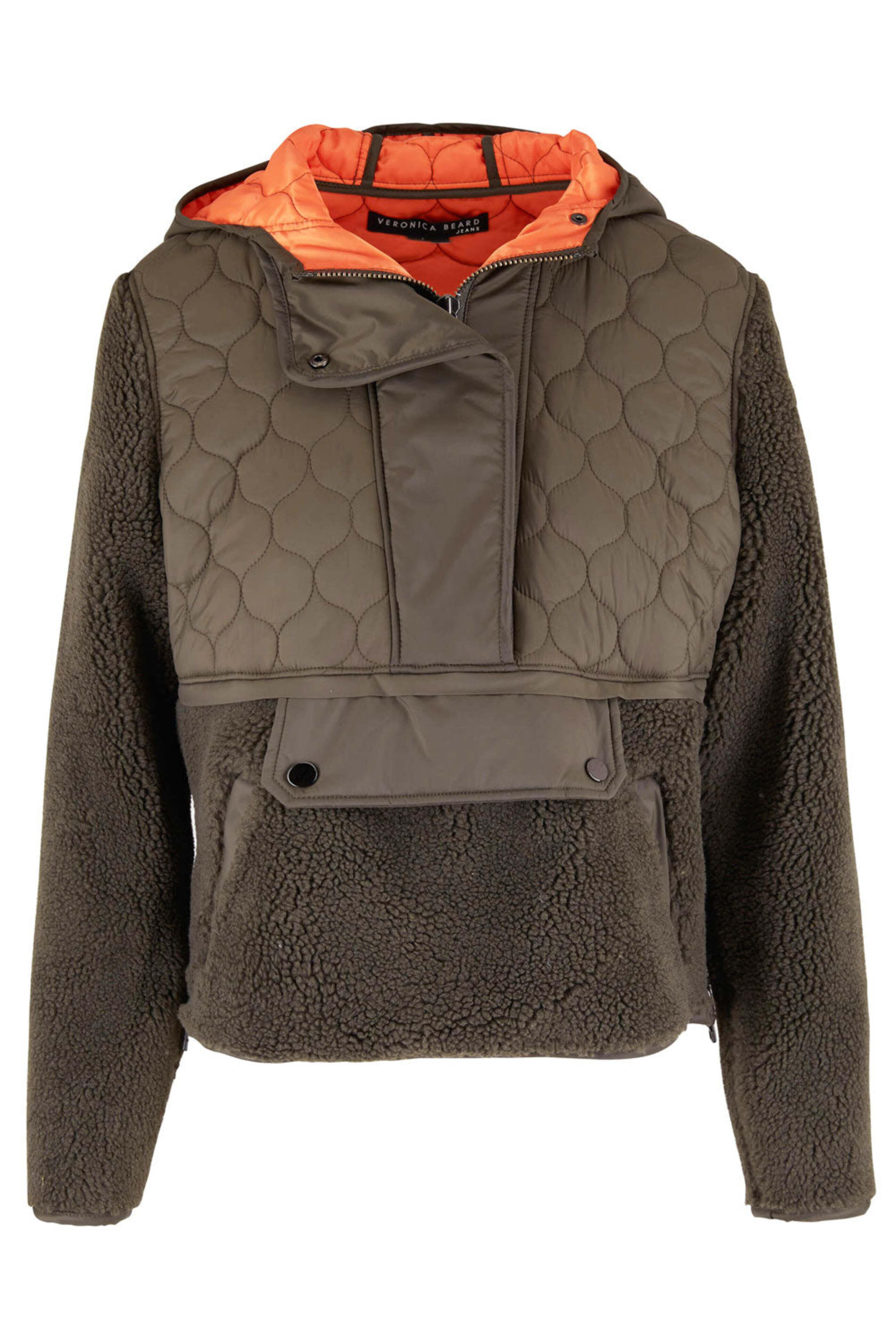 Veronica Beard Army Green Quilted Sherpa Leo Pullover. Hooded. Long sleeves; banded cuffs. Concealed quarter zip closure; snap button placket. Front flap pocket; snap button closure. Front slant slip pockets. Quilted and sherpa fabrication. 100% polyester.