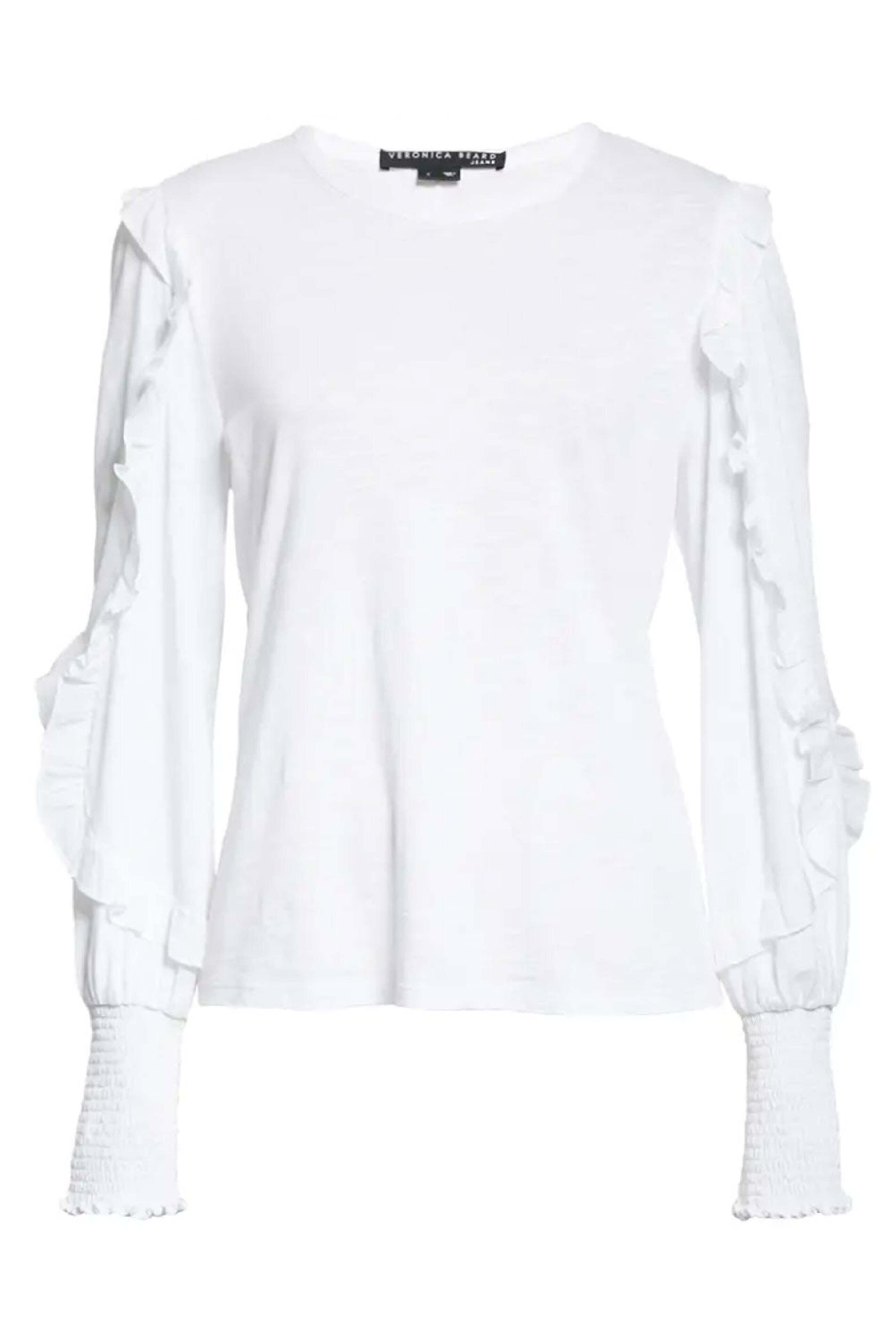 Veronica Beard White Osage Tee. Round neck. Ruffle detail at shoulders and sleeves. Long sleeves; extended smocked cuffs. Relaxed fit. Center back seam detail. 100% pima cotton.