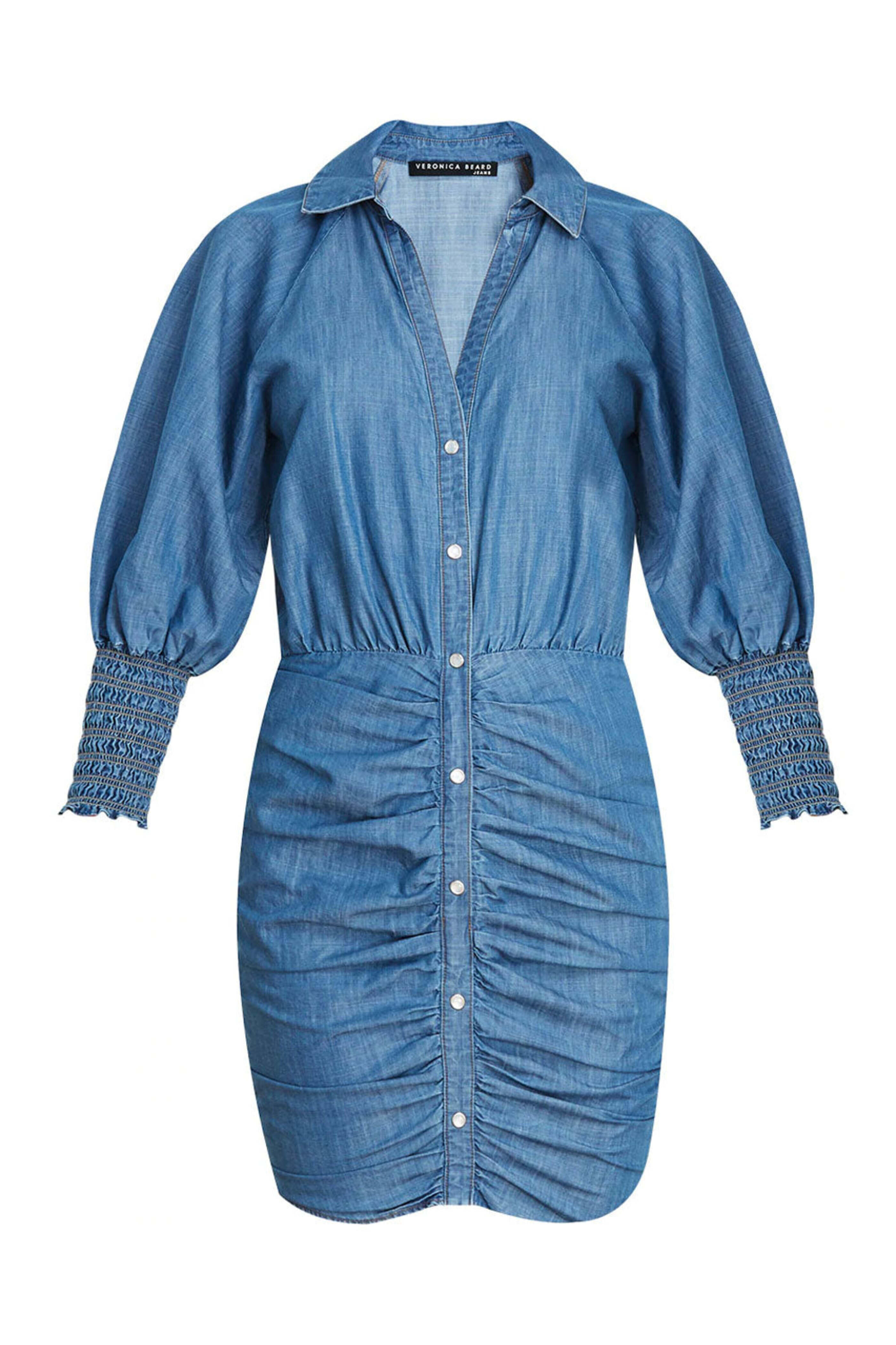 Veronica Beard Vale Blue Allie Denim Dress. Spread collar. Deep v neck. ¾ length puff sleeves; smocked cuffs. Button down front closure. Ruched skirt. Slim through hip and thigh. Mini length. 59% cotton, 41% lyocell.