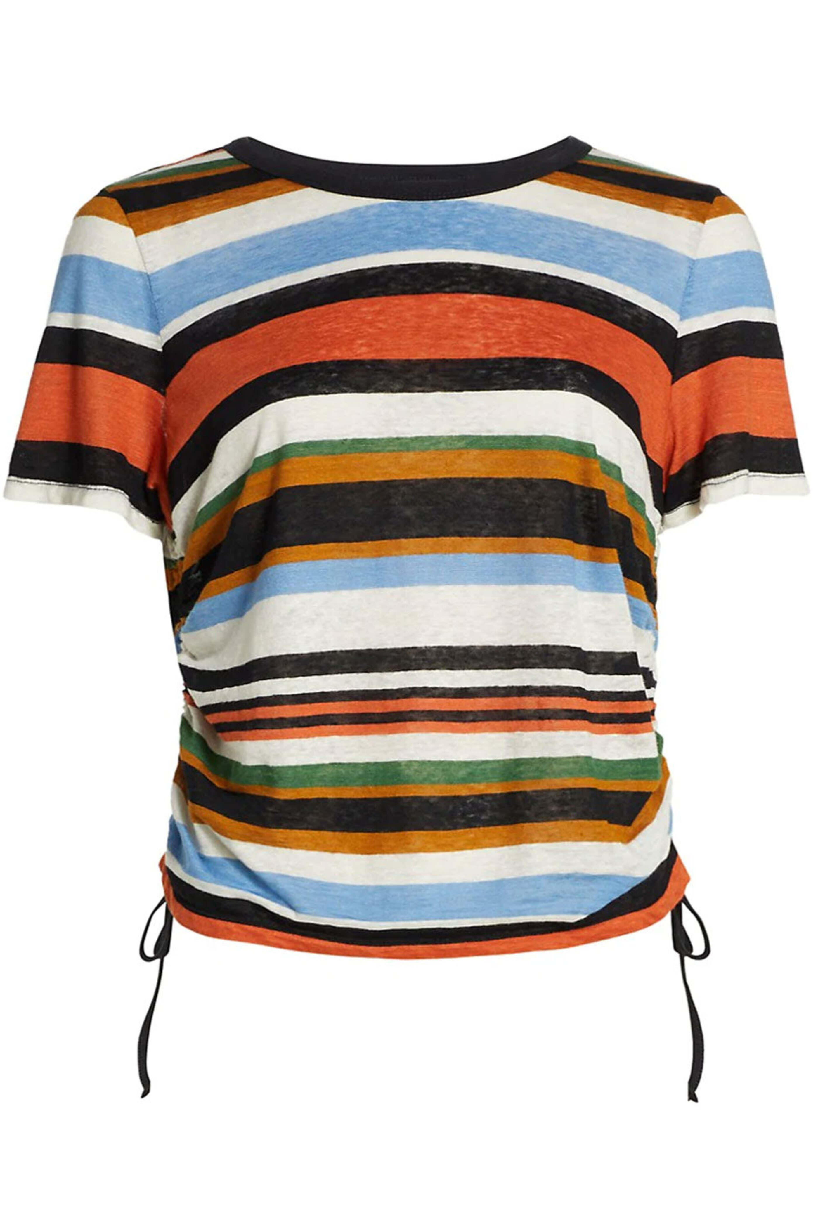 Veronica Beard Multi Stripe Tazi Tee. Round neck. Short sleeves. Drawstring detail at sides. Relaxed fit. 100% linen.