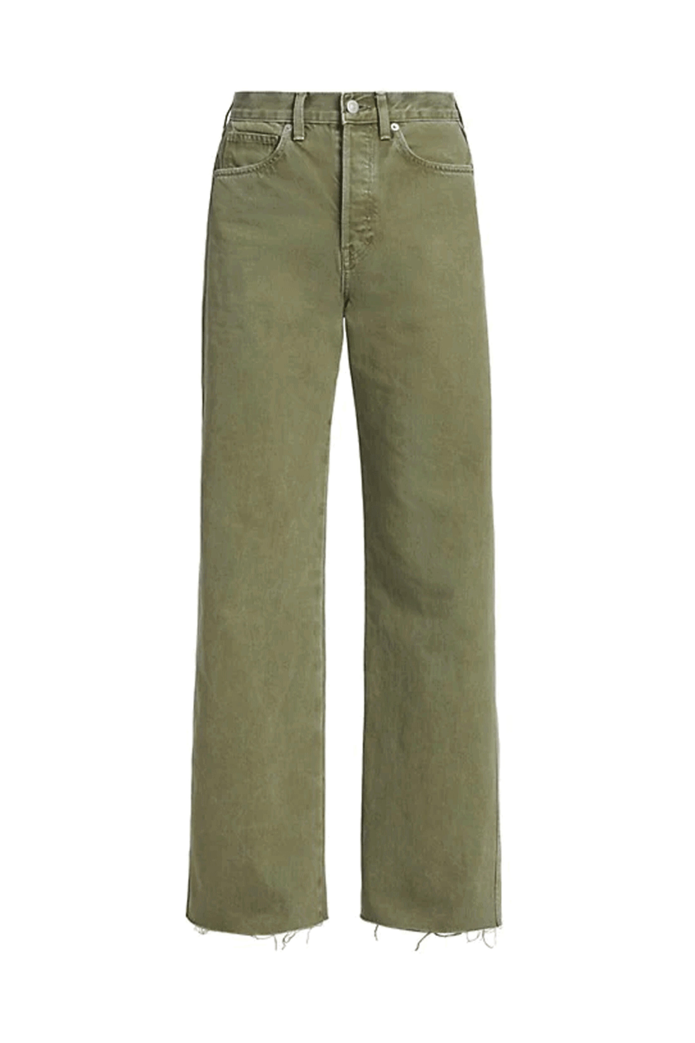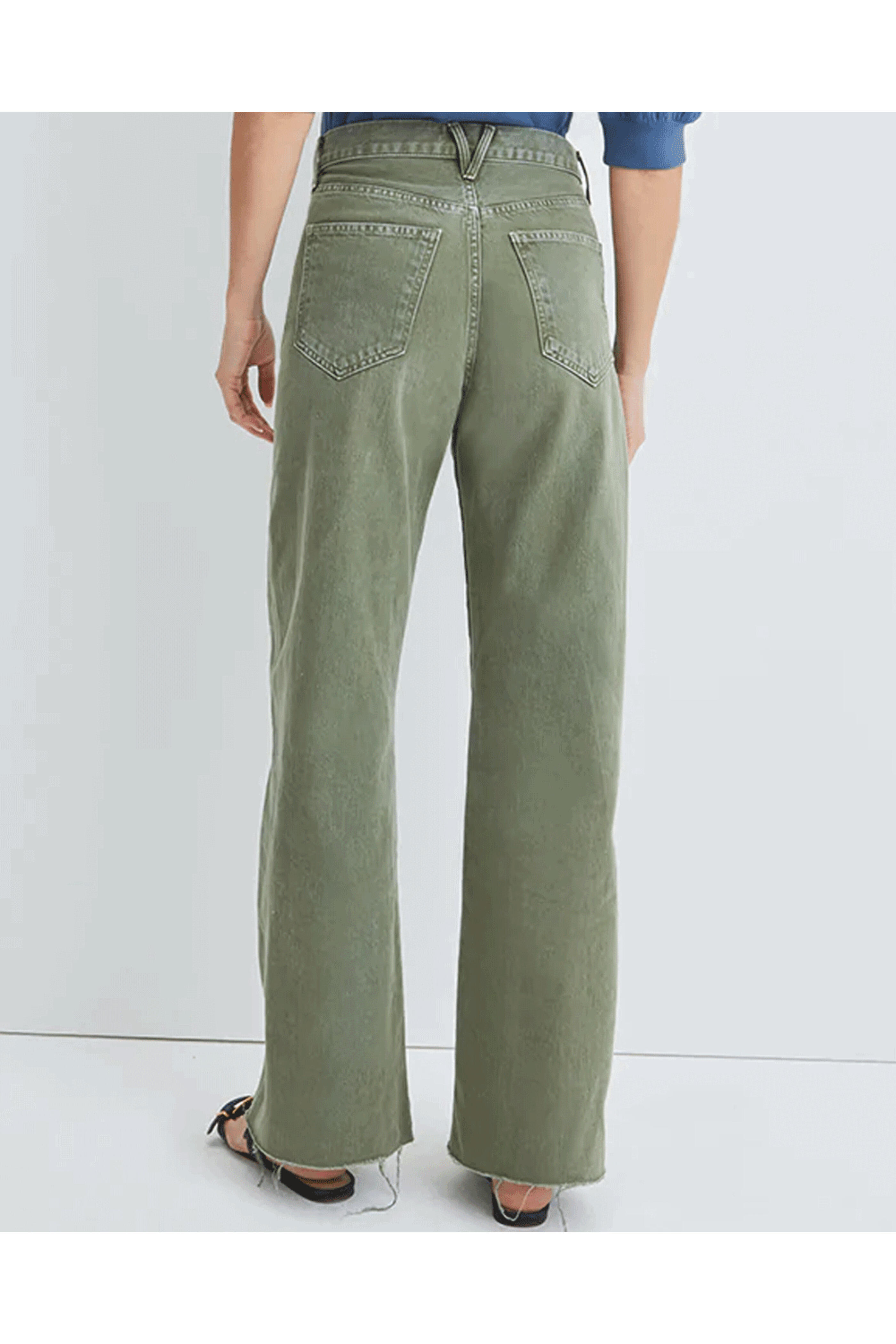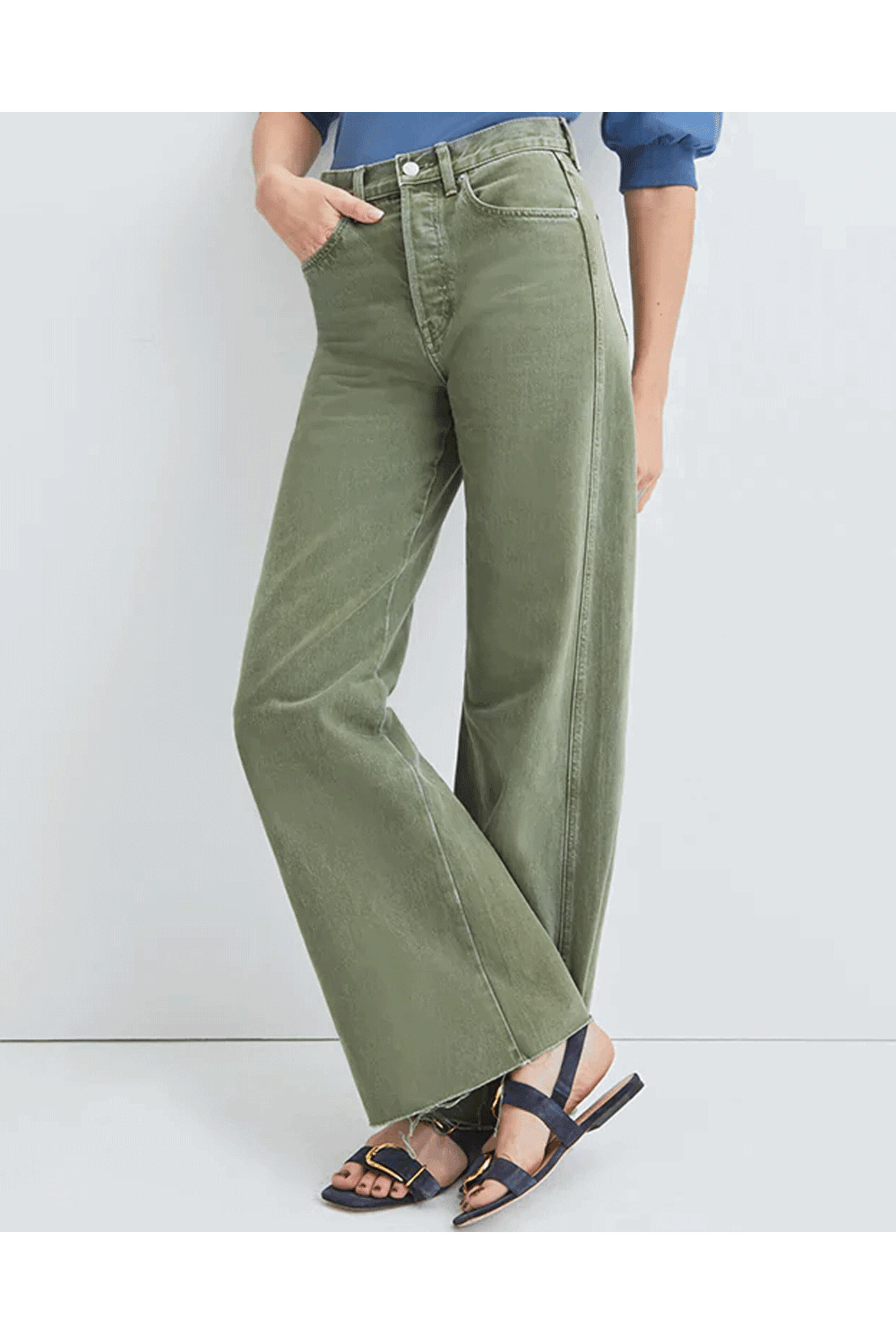 Veronica Beard Taylor High Rise Wide Leg Jean in Clover Green. High rise. Button fly closure. Belt loops. Five pocket style. Wide through leg. Full length. Raw hem. Rigid denim fabrication. 100% cotton.
