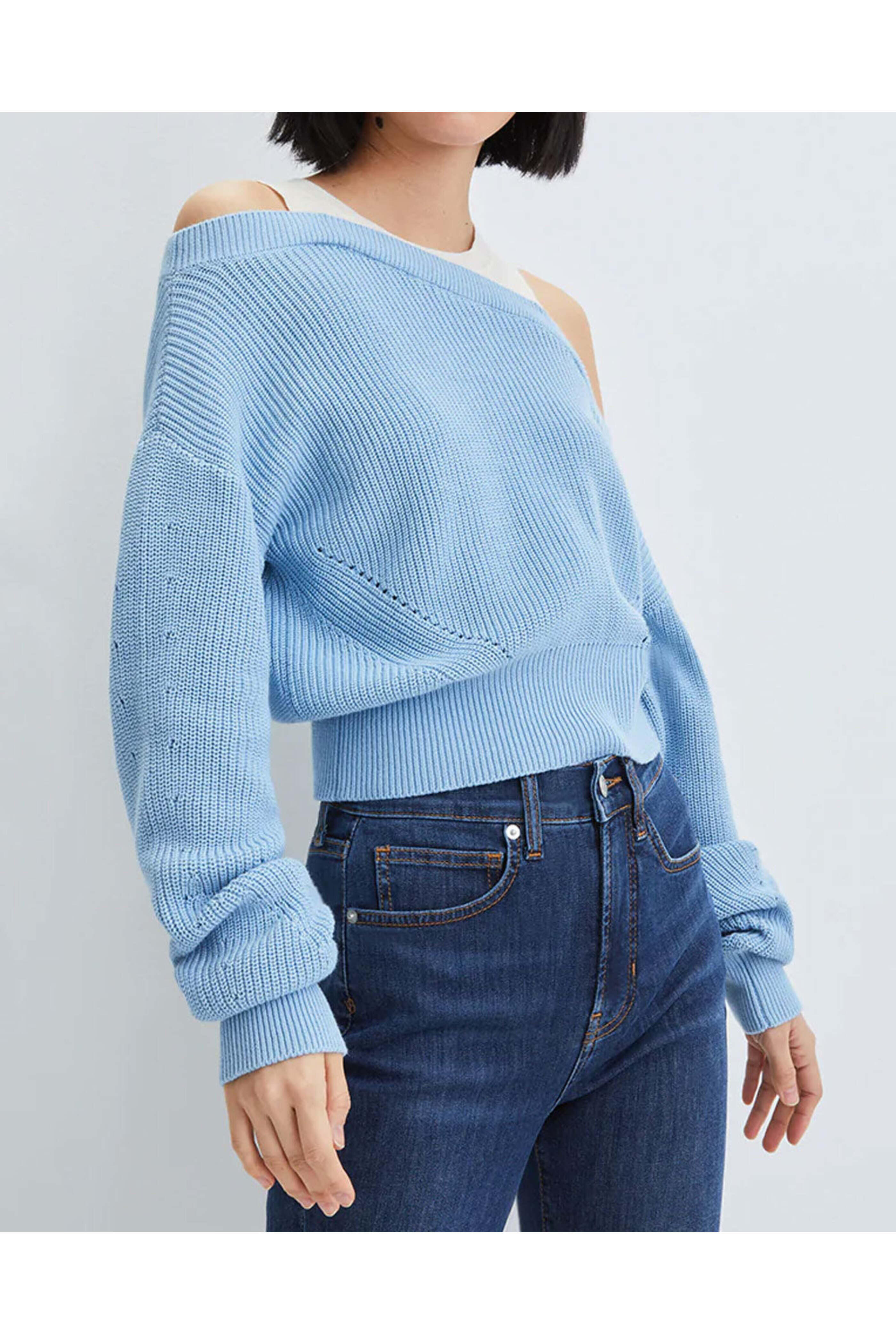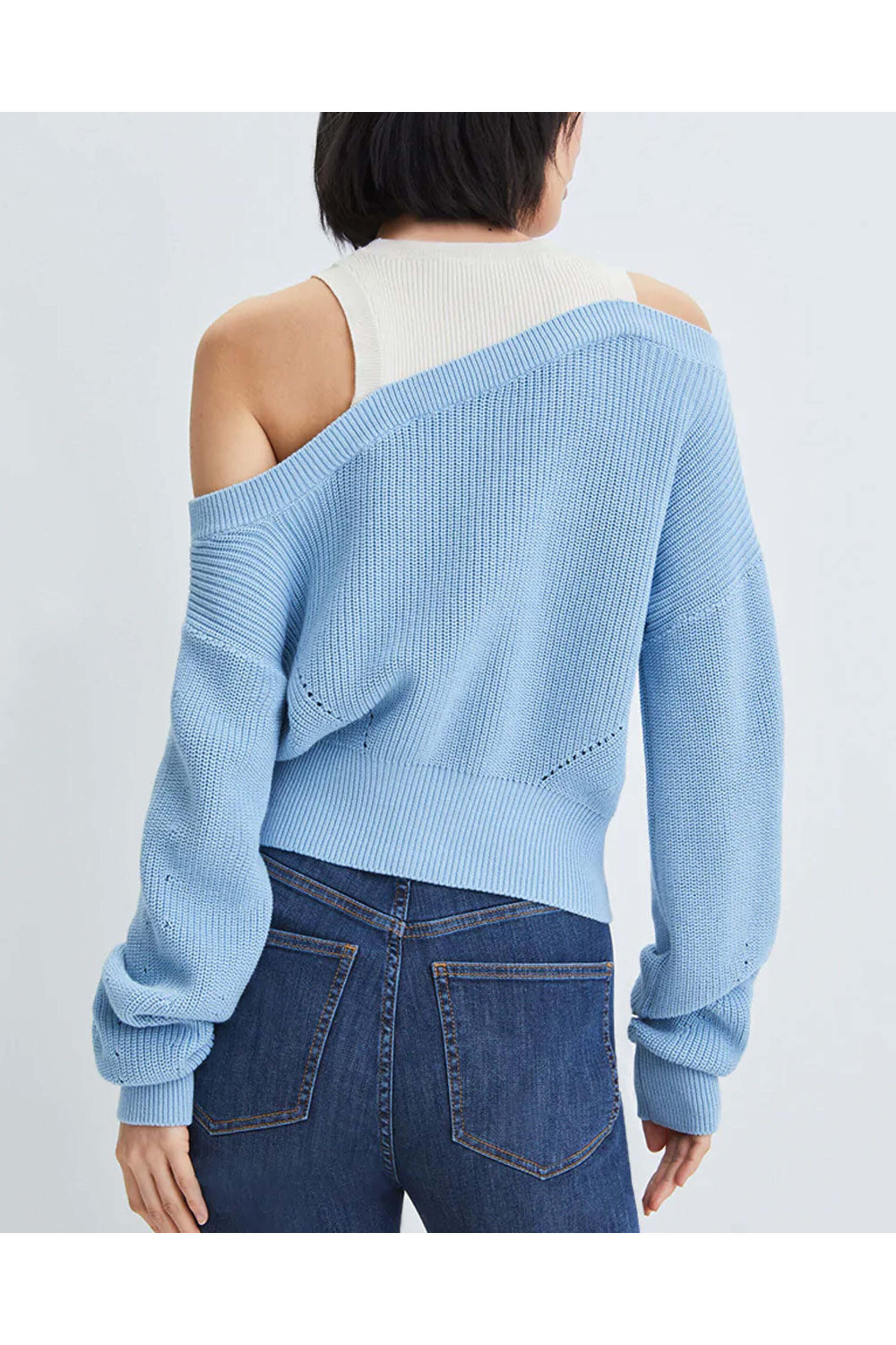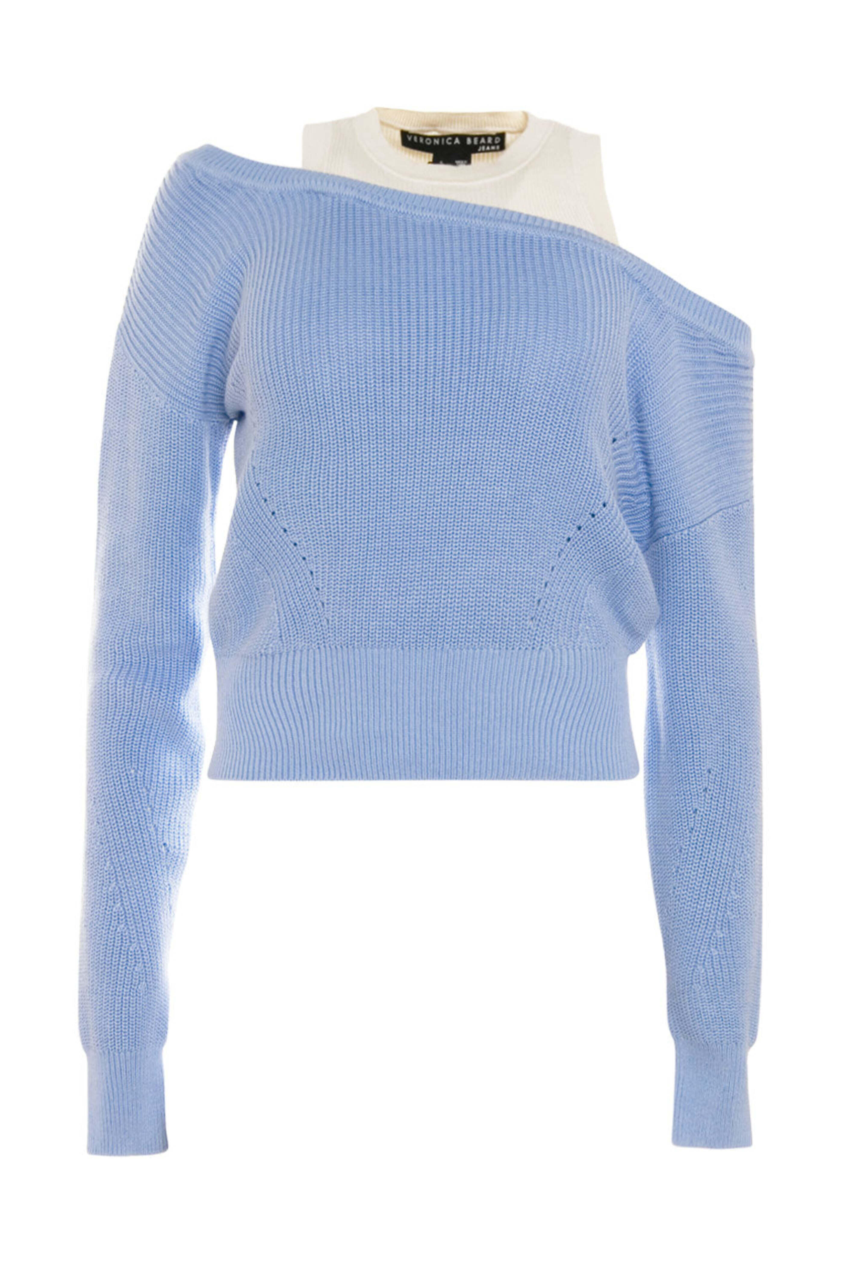 Veronica Beard Blue Knit Layer Prescott Sweater. Crew neck. Off the shoulder; drop shoulders. Long sleeves. Faux layer fabrication. Ribbed throughout. Straight hem. 100% cotton.