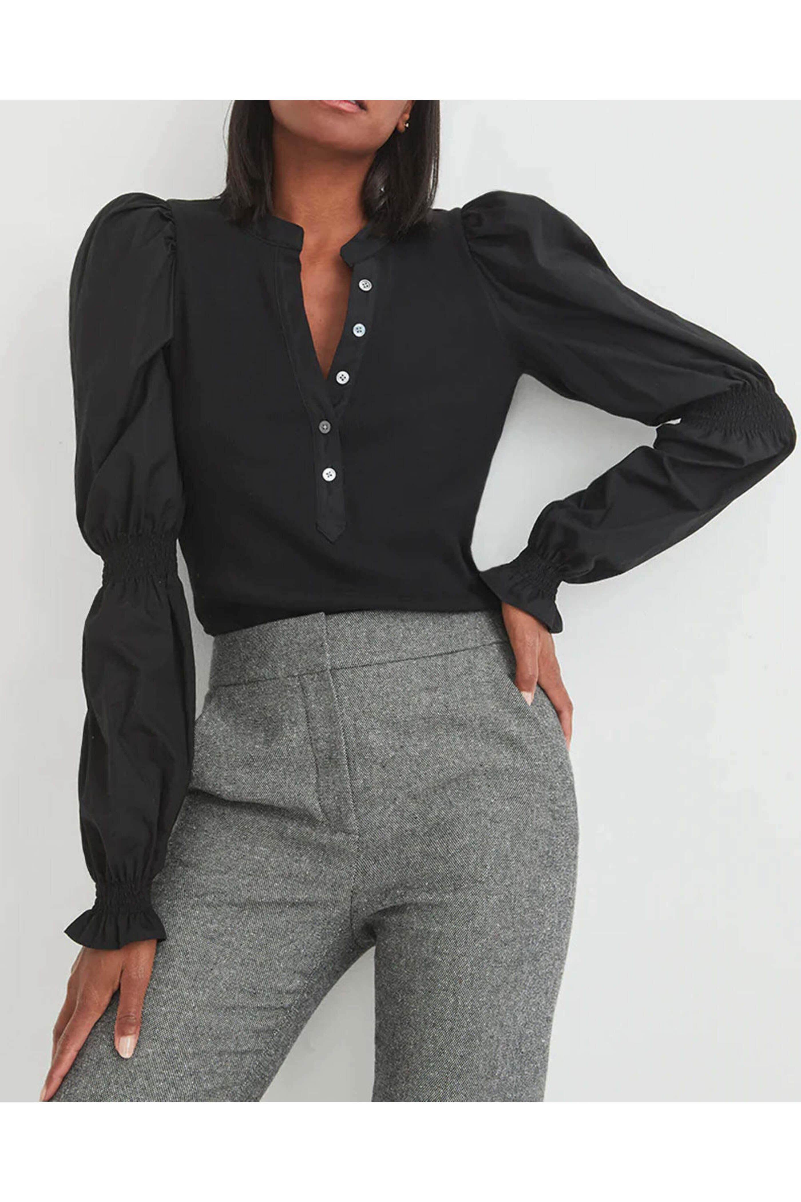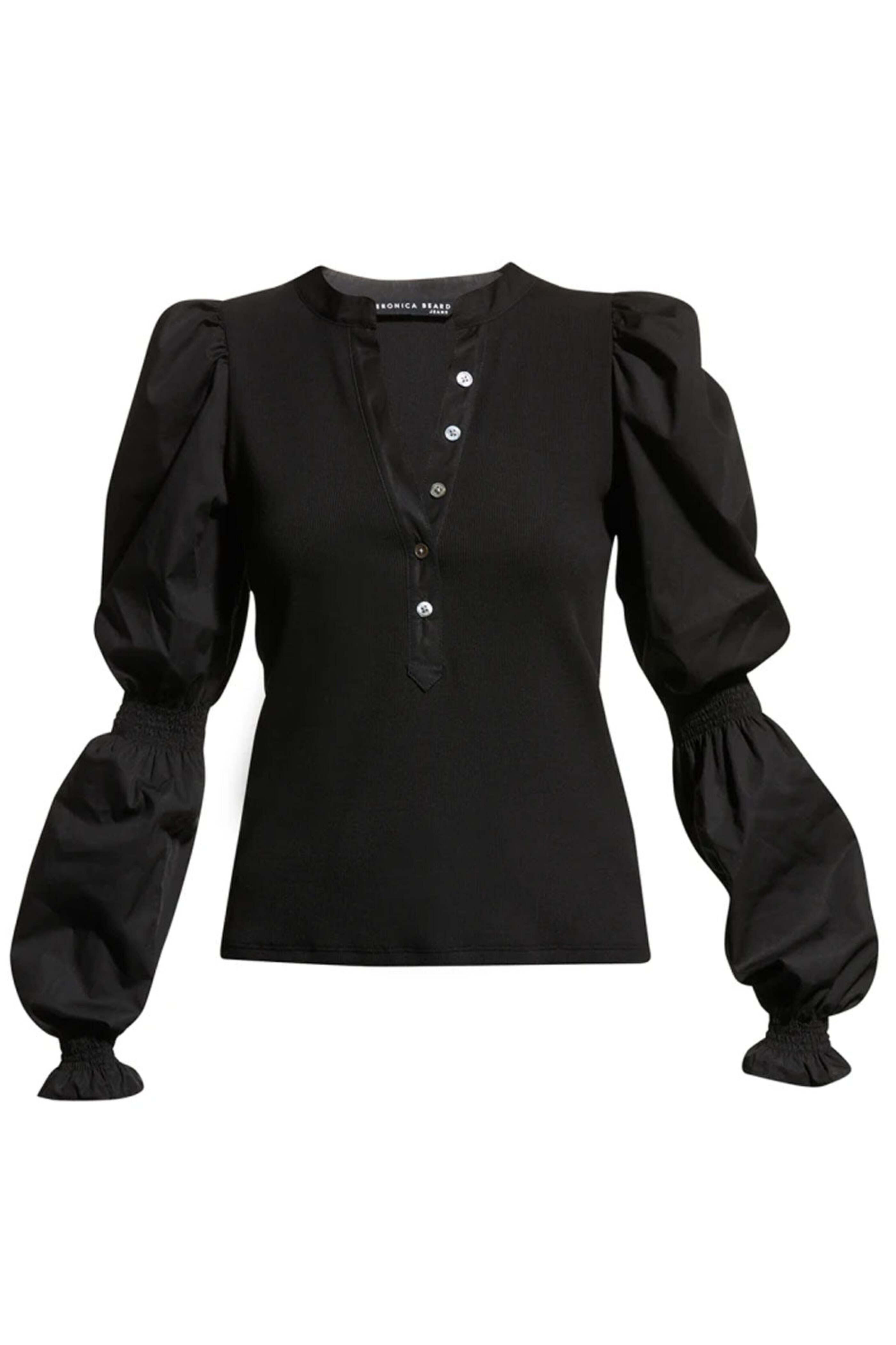 Veronica Beard Black Effy Top. V Neck. Long puff sleeves; cinched detail. Partial button up closure at front. Slim fit. 97% Cotton, 3% Elastane.
