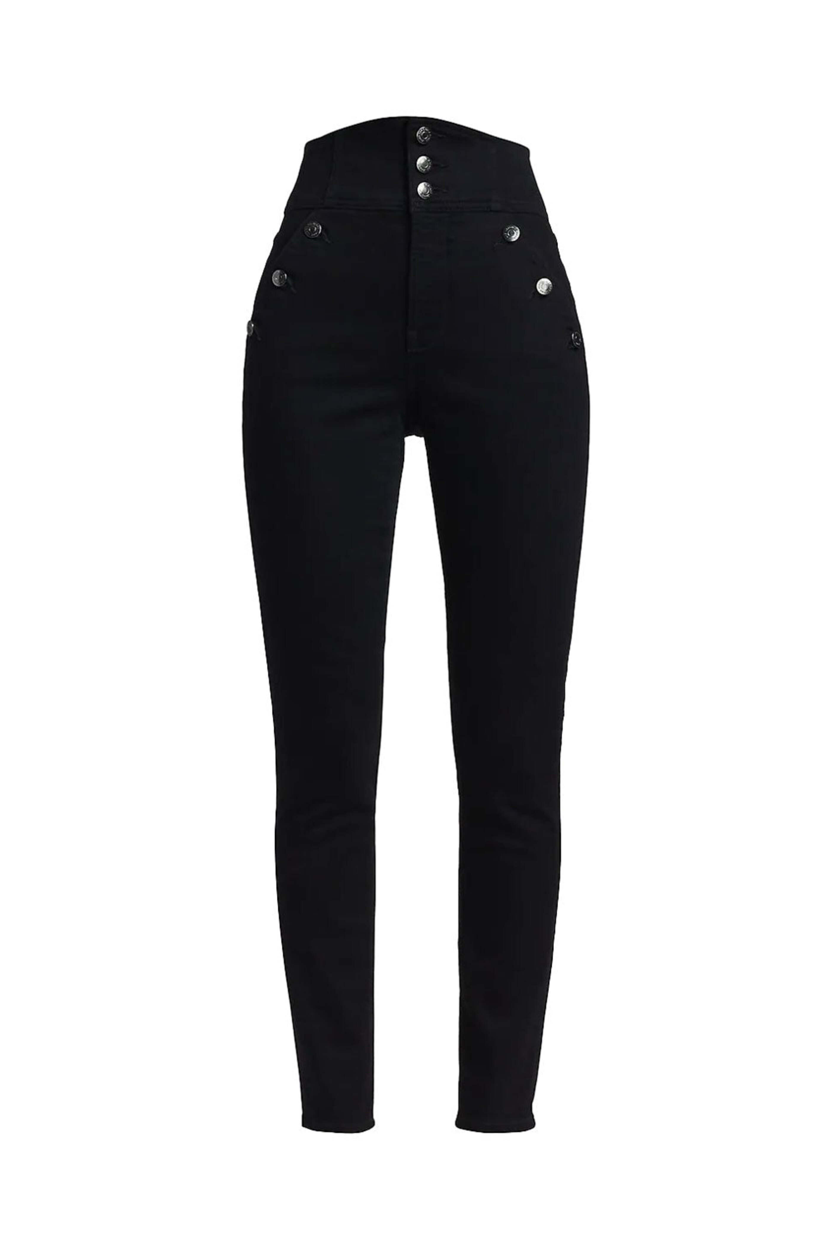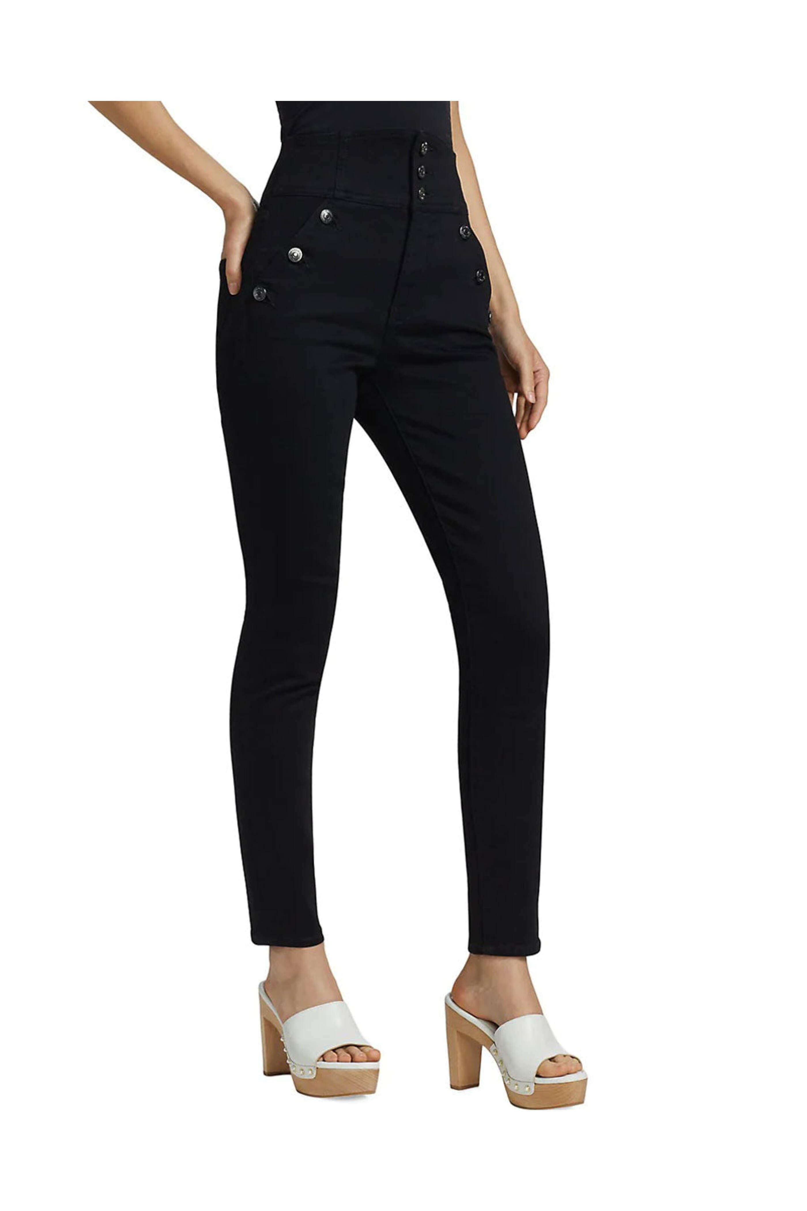 Veronica Beard Jossie Sailor Jean in Onyx. High rise. Button closure. Zip fly. Belt loops. Four pocket style. Skinny silhouette. Slim fit. 91% Cotton, 6% Polyester, 3% Elastane.
