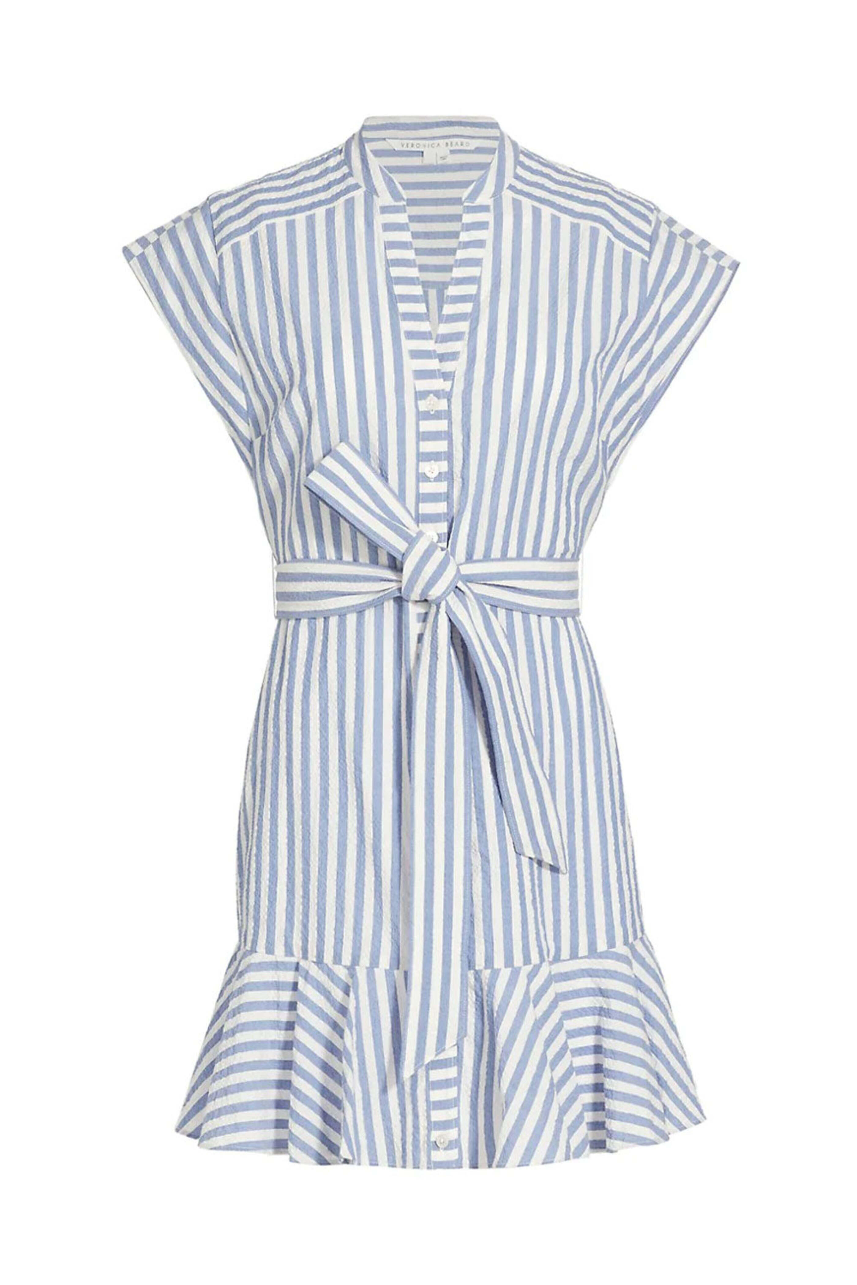 Veronica Beard Blue and White Avella Dress. Split v neck. Short cap sleeves. Button down front closure. Removable self-tie belt; self-fabrication. Slim silhouette. Flounce hem. Mini length. Seersucker fabrication. 99% cotton, 1% elastane.
