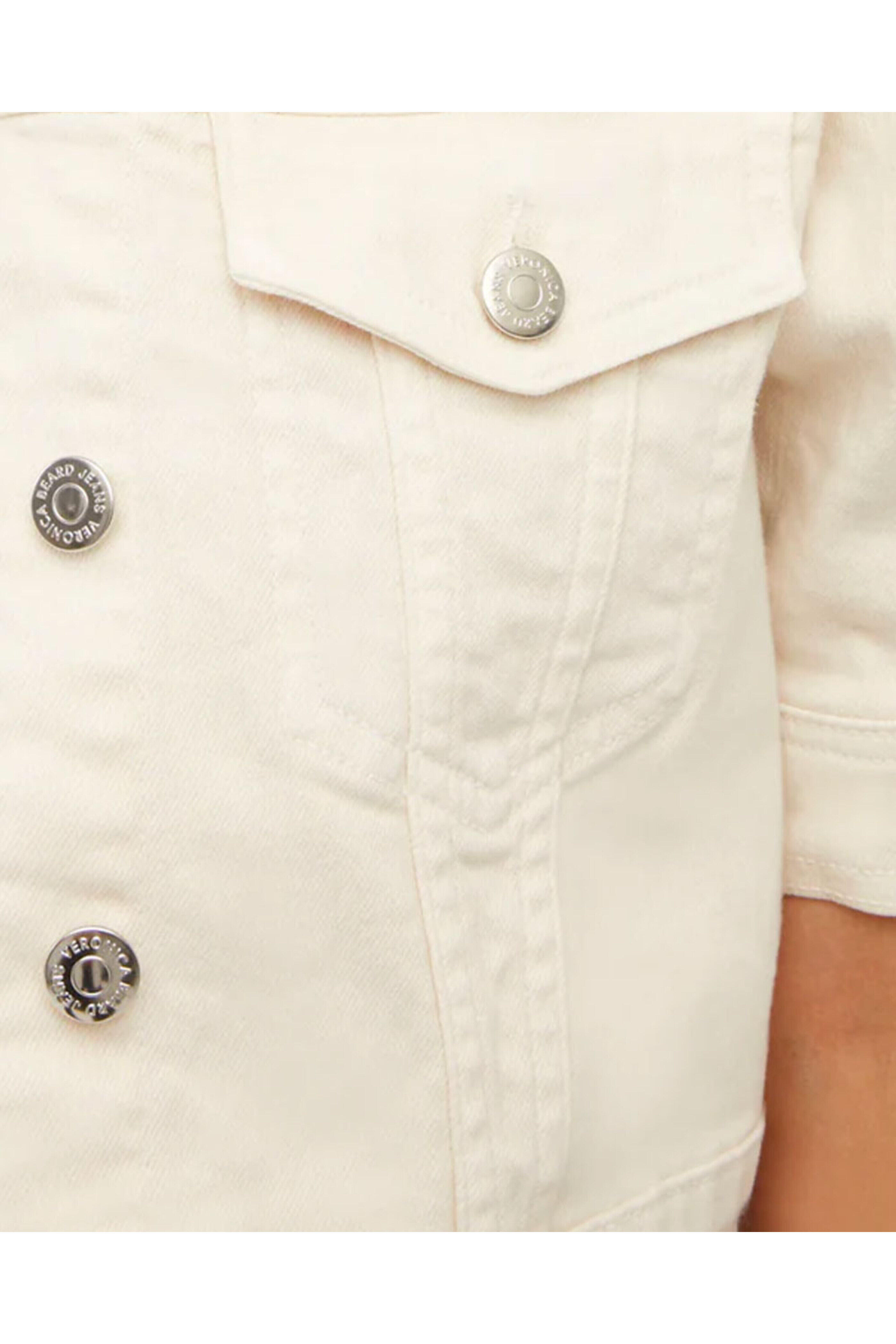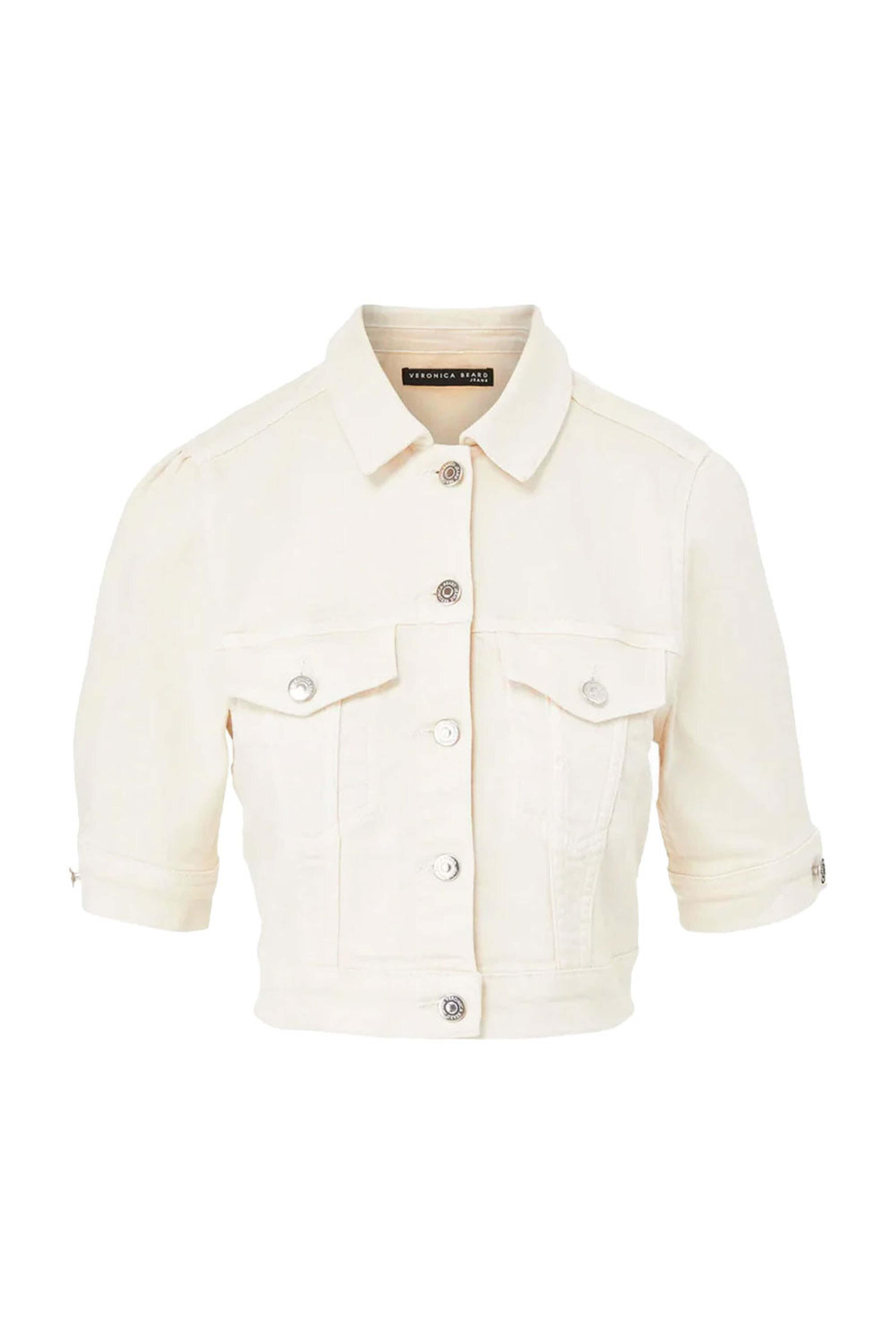 Veronica Beard Ecru Raina Denim Jacket. Point collar. Short sleeves. Elbow length sleeves, front button sleeves. Chest flap pockets. Imported.