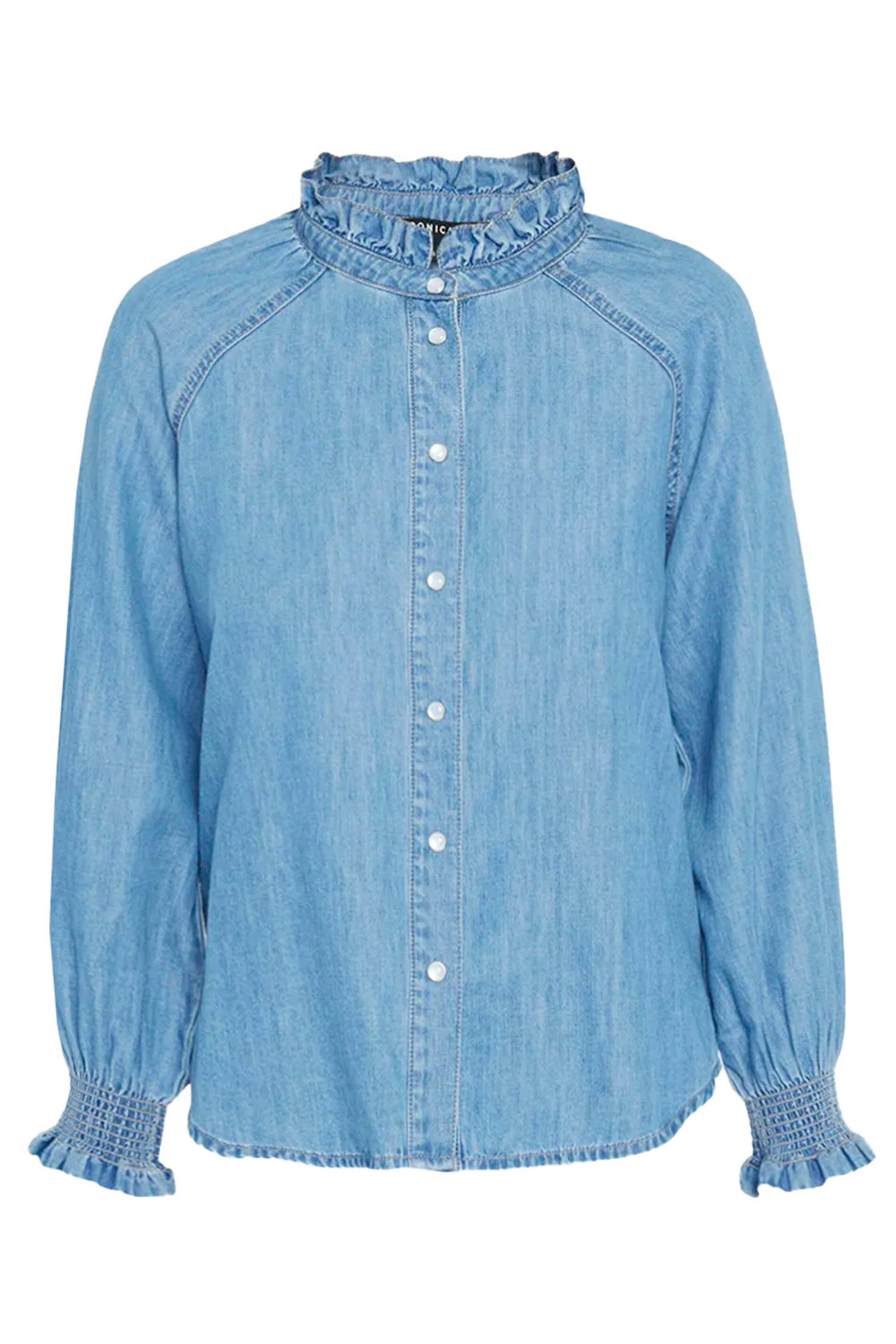 Veronica Beard Iceberg Chambray Calisto Shirt. Ruffle collar. Long raglan sleeves; smocked cuffs. Button down front closure. Relaxed fit. Rounded hem. Denim fabrication. 100% cotton.