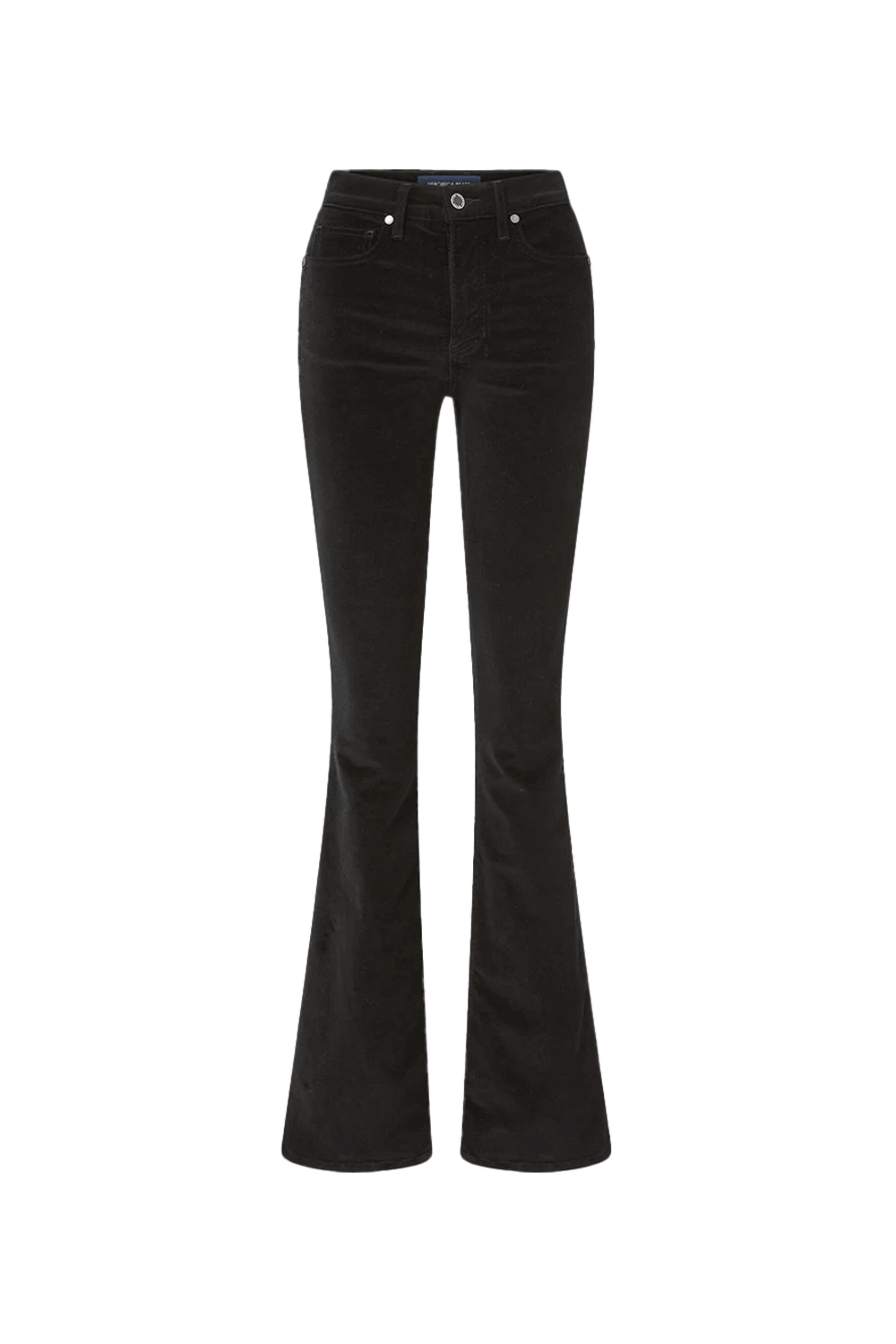 Veronica Beard Black Beverly Velvet Skinny Flare. Mid rise. Five-pocket style. Concealed zip fly, button closure. Full length. 52% cotton, 39% modal, 7% polyester, 2% elastane.