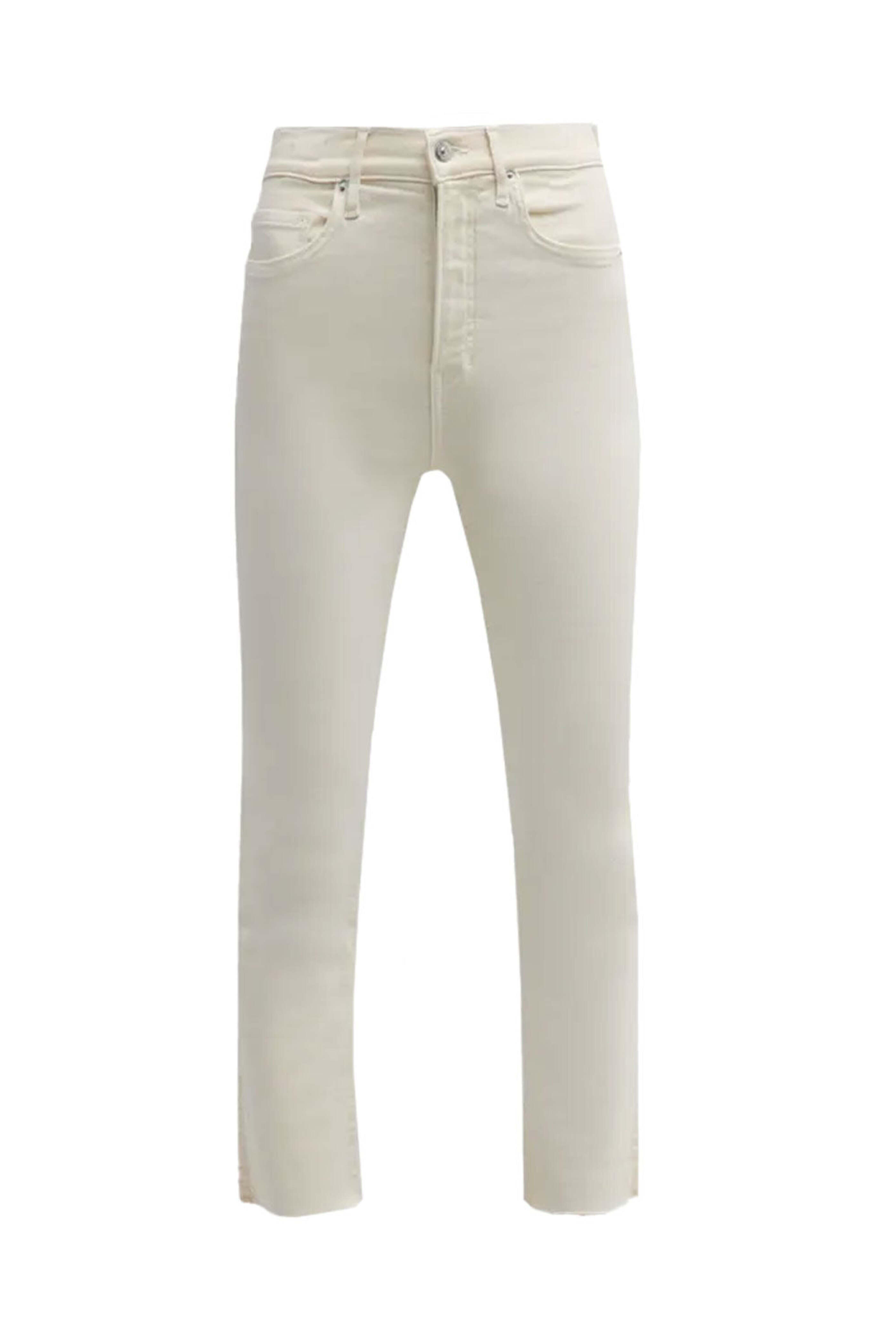 Veronica Beard Carly Kick Flare Raw Hem Jean in Ecru. High rise. Button closure. Zip fly. Belt loops. Five pocket style. Straight silhouette. Cropped length. Raw hem. Cotton, polyester, polyurethane. Made in LA.