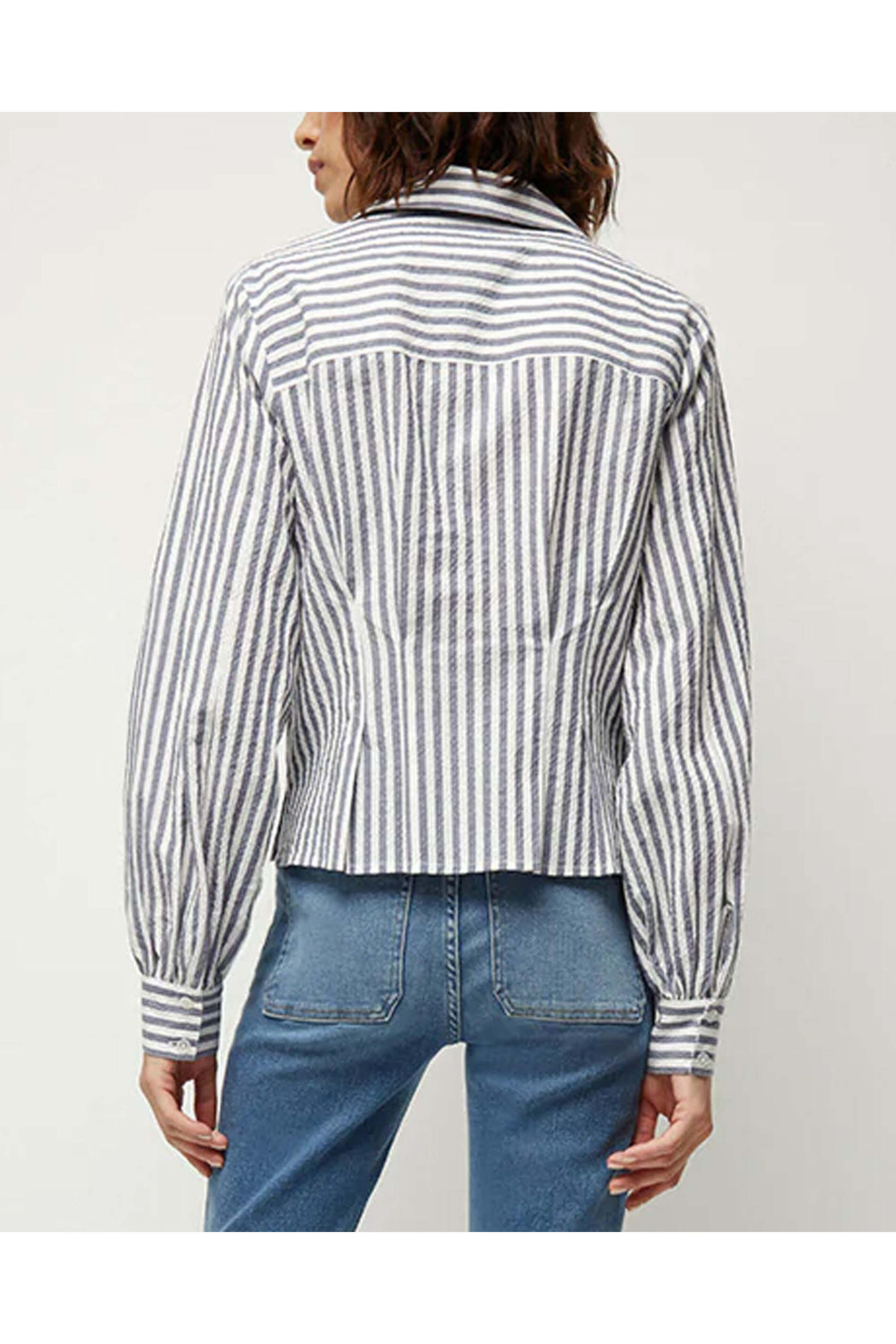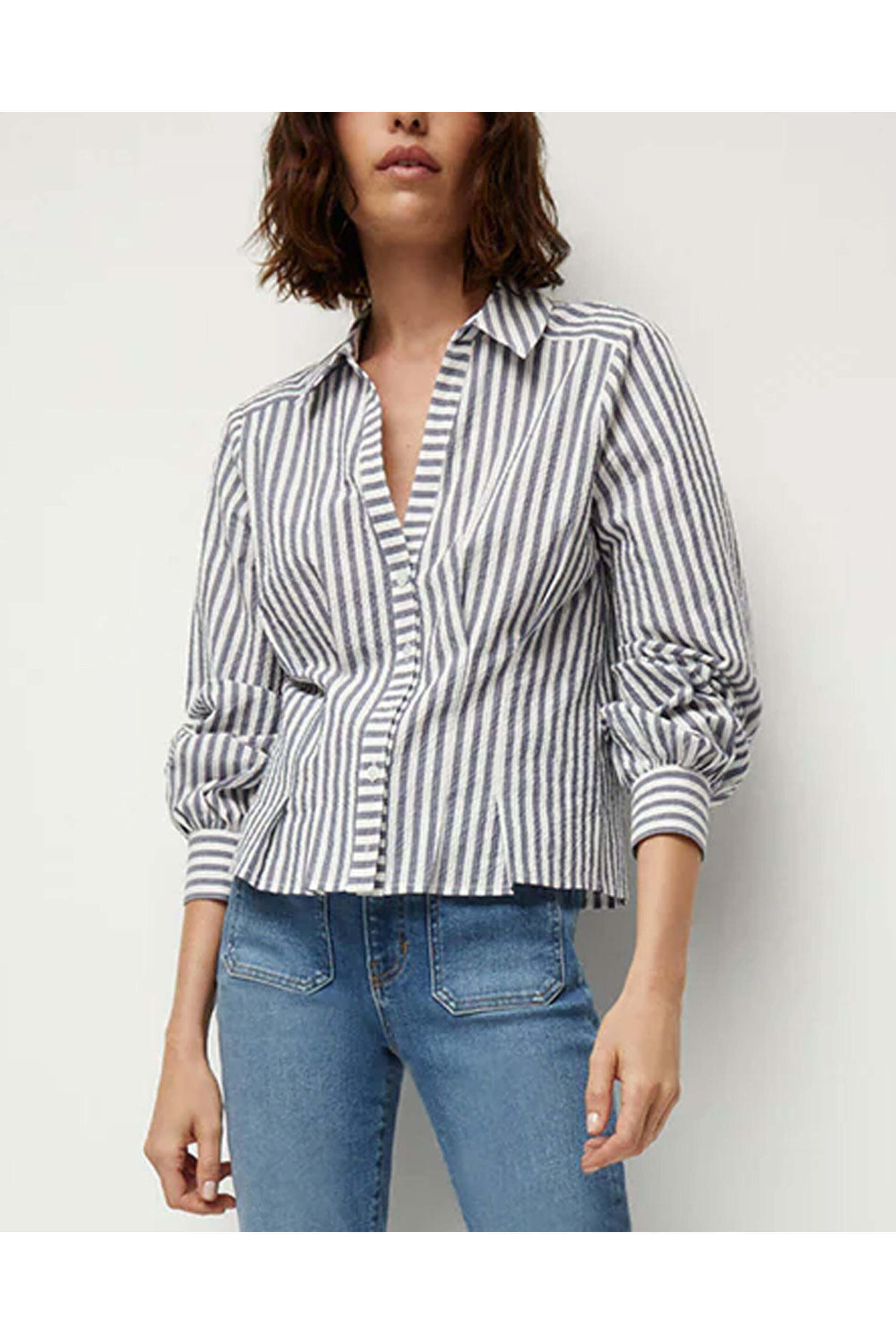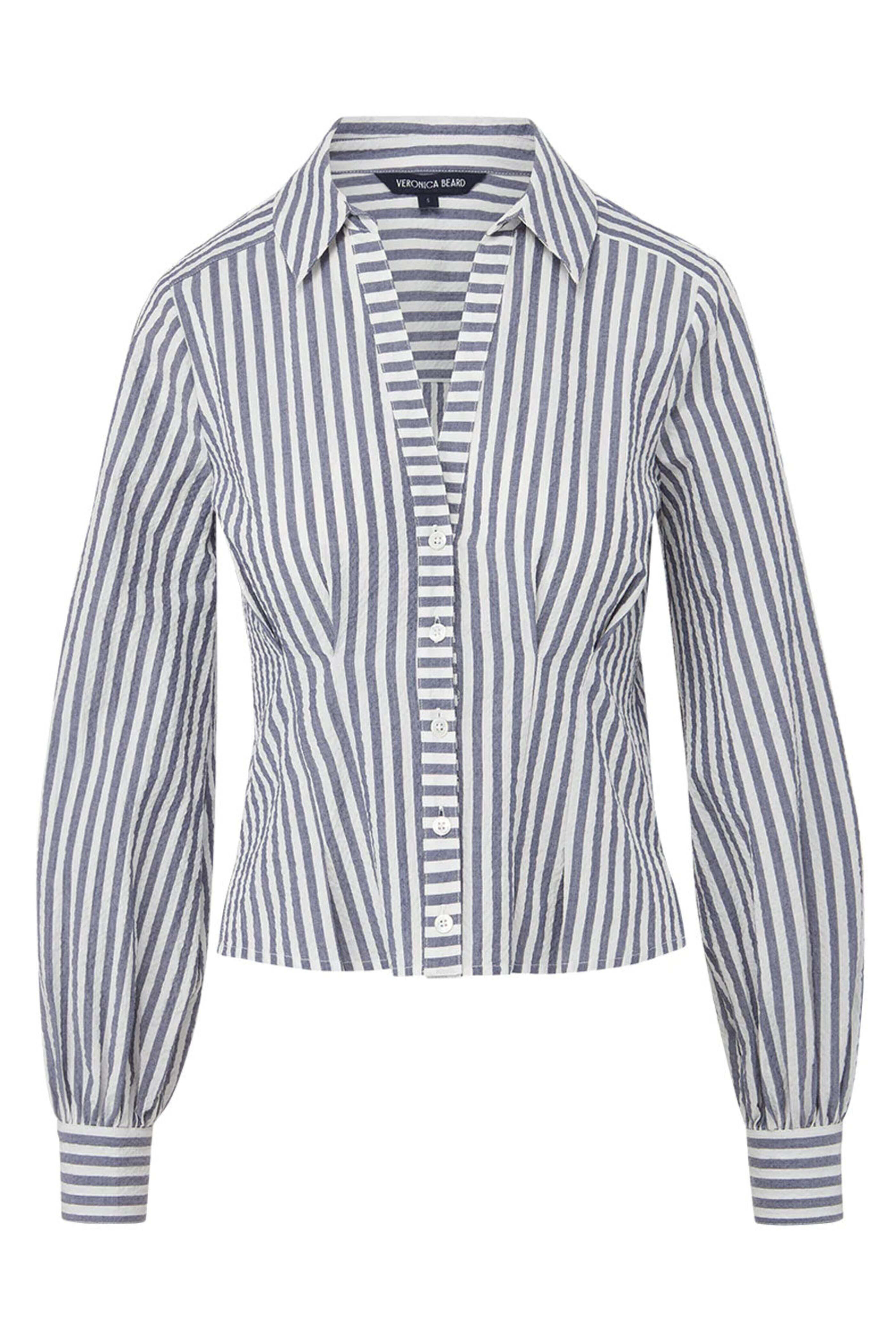 Veronica Beard Navy and Off White Stripe Seersucker Ertha Top. Collar. V neck. Long raglan sleeves; button cuffs. Button down front closure. Relaxed fit. Seersucker fabrication. 99% cotton, 1% elastane.