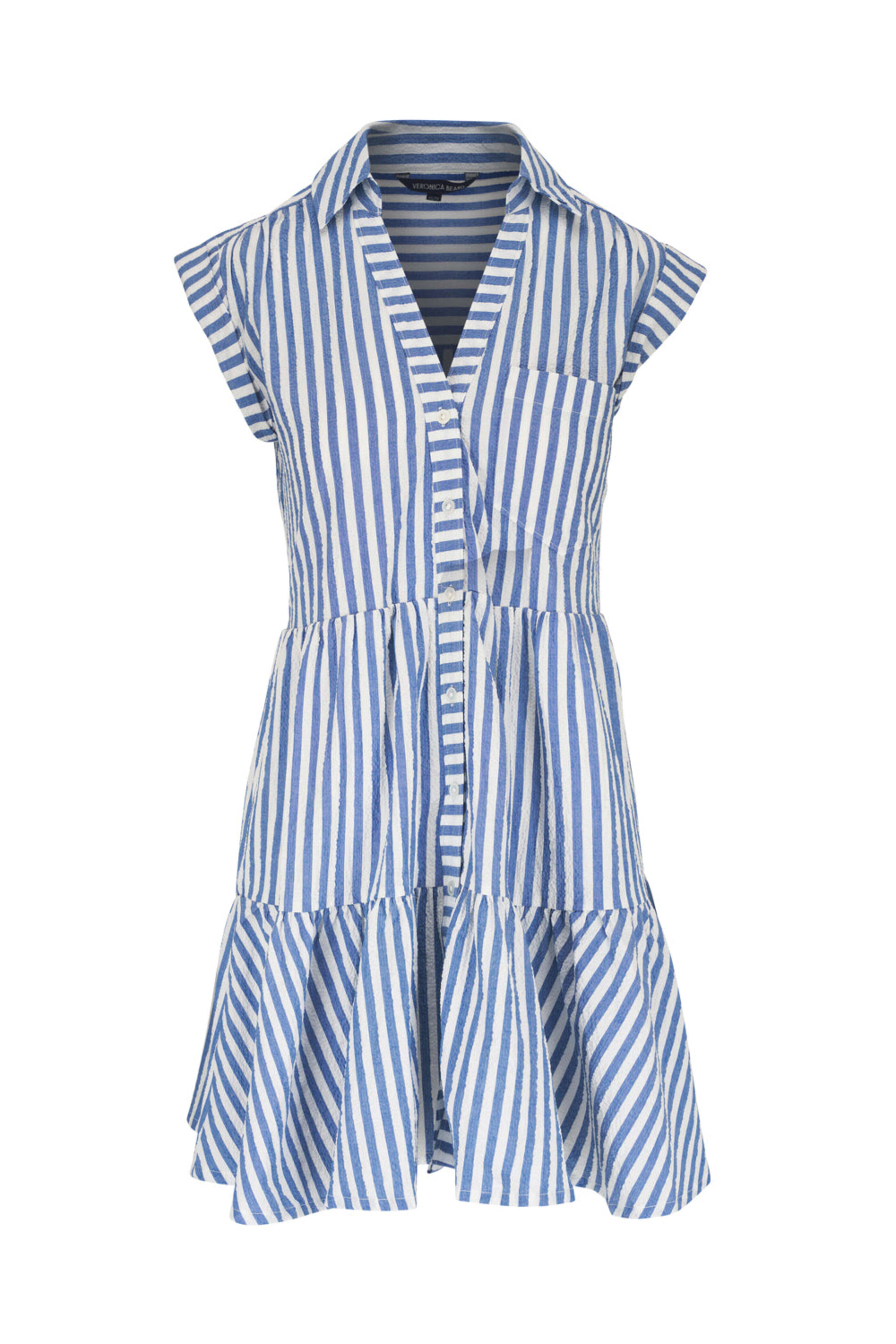 Veronica Beard Blue and White Trisha Dress. Collar. V neck. Short sleeves. Button down front closure. Single chest patch pocket. Tiered silhouette. Mini length. 98% cotton, 2% spandex.