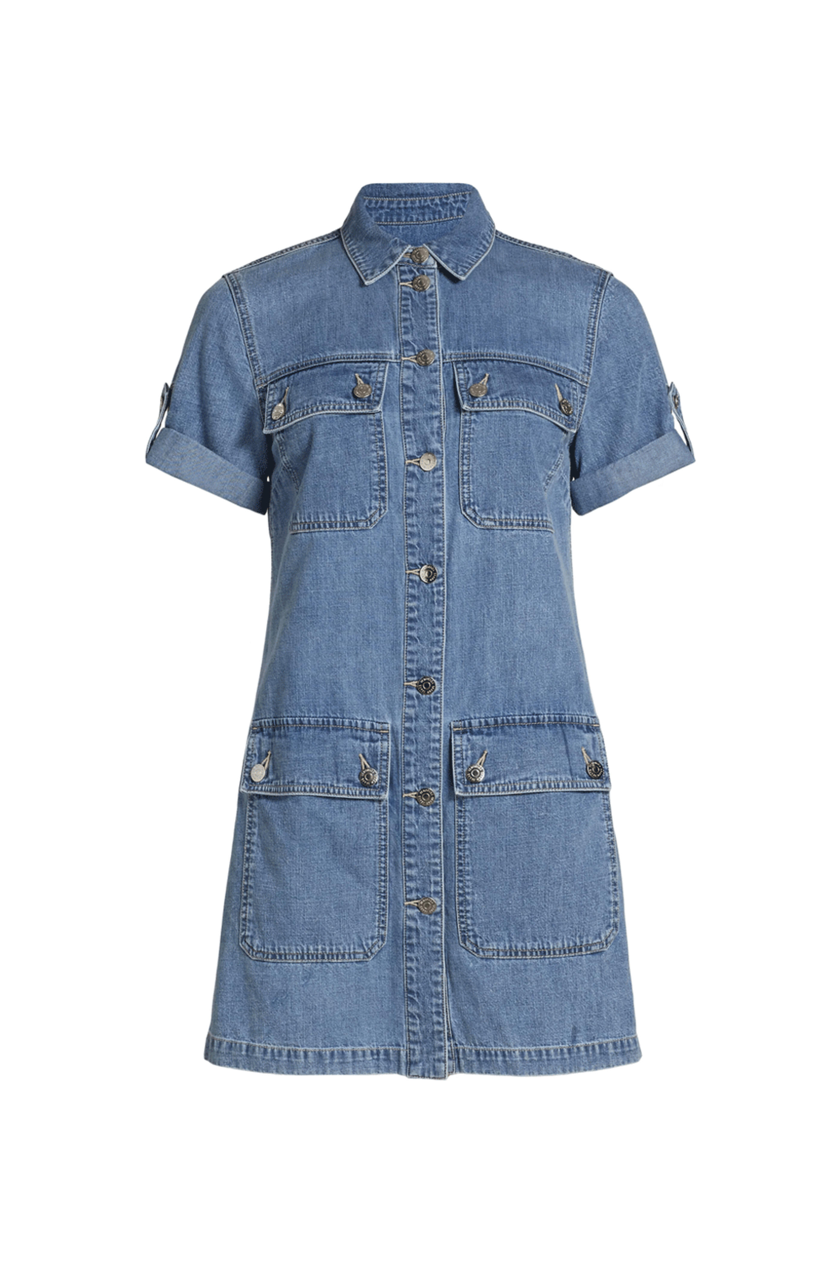 Veronica Beard Starlight Warren Mini Dress. Point collar. Short sleeves. Front patch pockets. Front button closure. Mini length. 100% cotton.