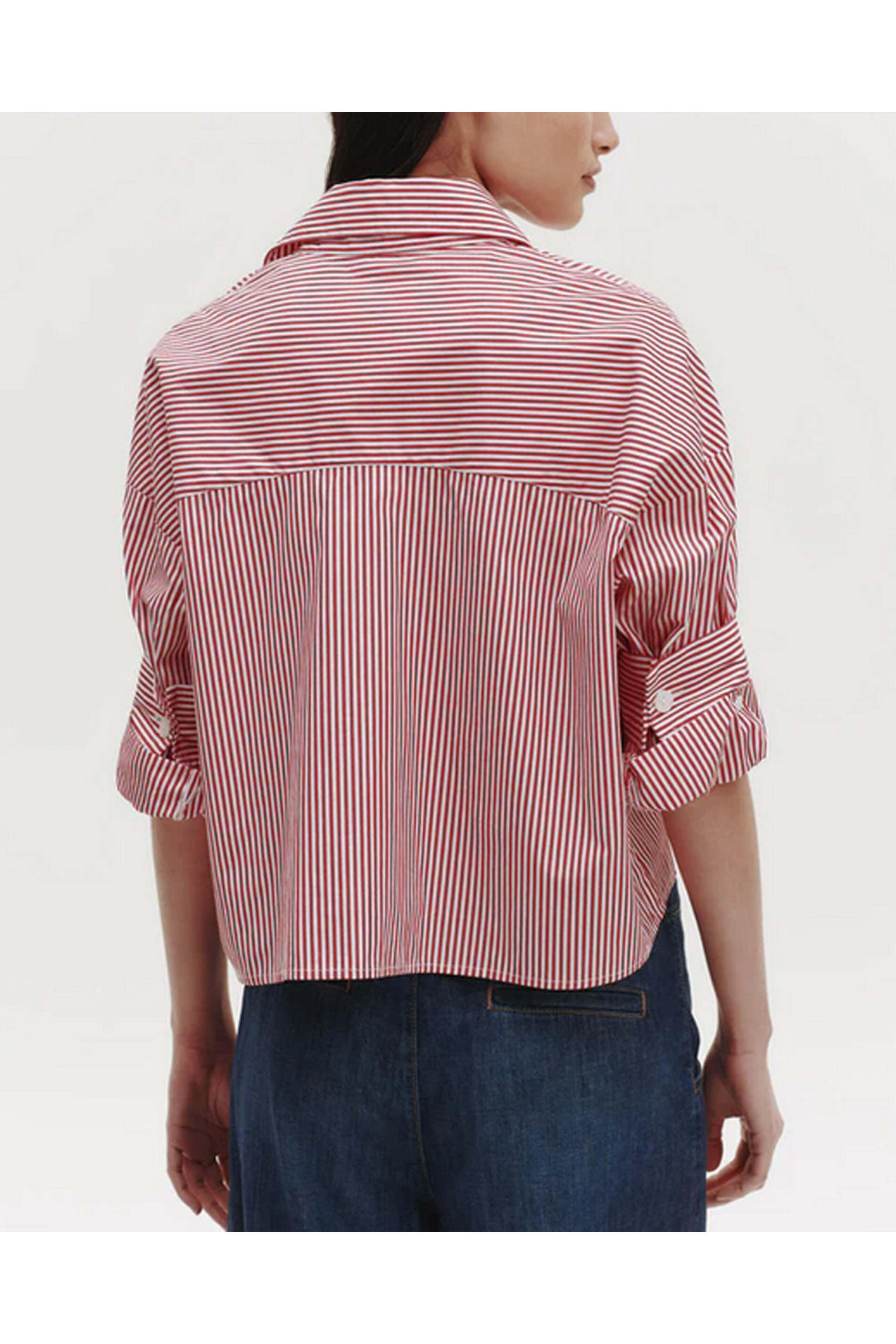 TWP Red and White Stripe Next Ex Shirt. Collar. Drop shoulders. Elbow length sleeves; double roll button cuffs. Button down front closure. Single chest patch pocket. Boxy fit. 100% cotton.