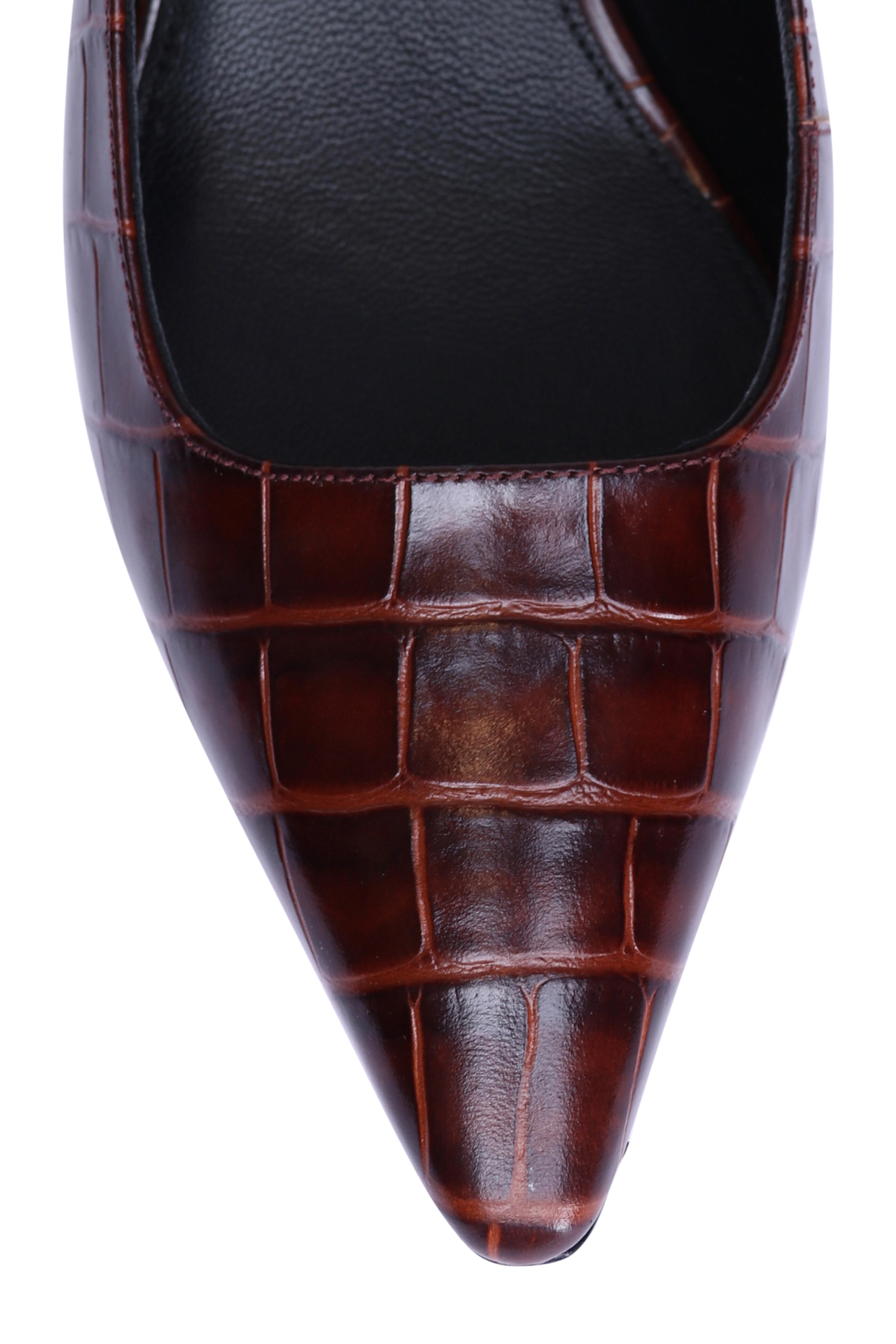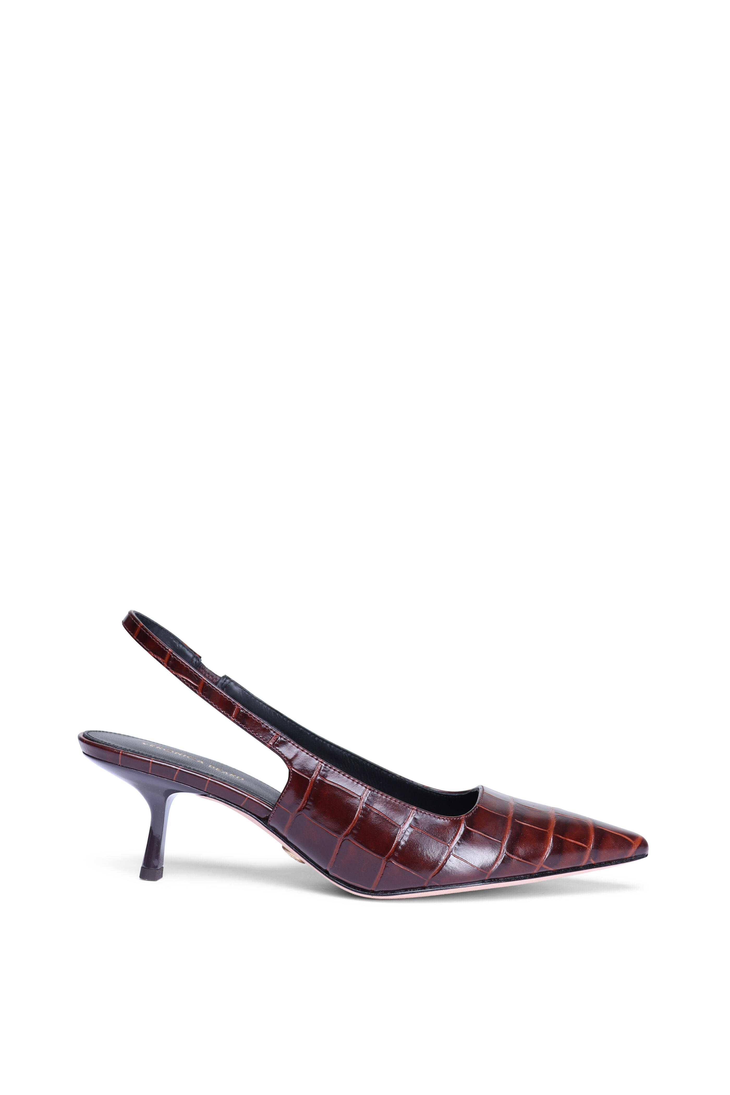 Croc-embossed leather upper. Leather lining and sole. Pointed toe. Elasticated slingback strap. Slip-on style. Stiletto heel. Imported. Heel measurement: 54mm.