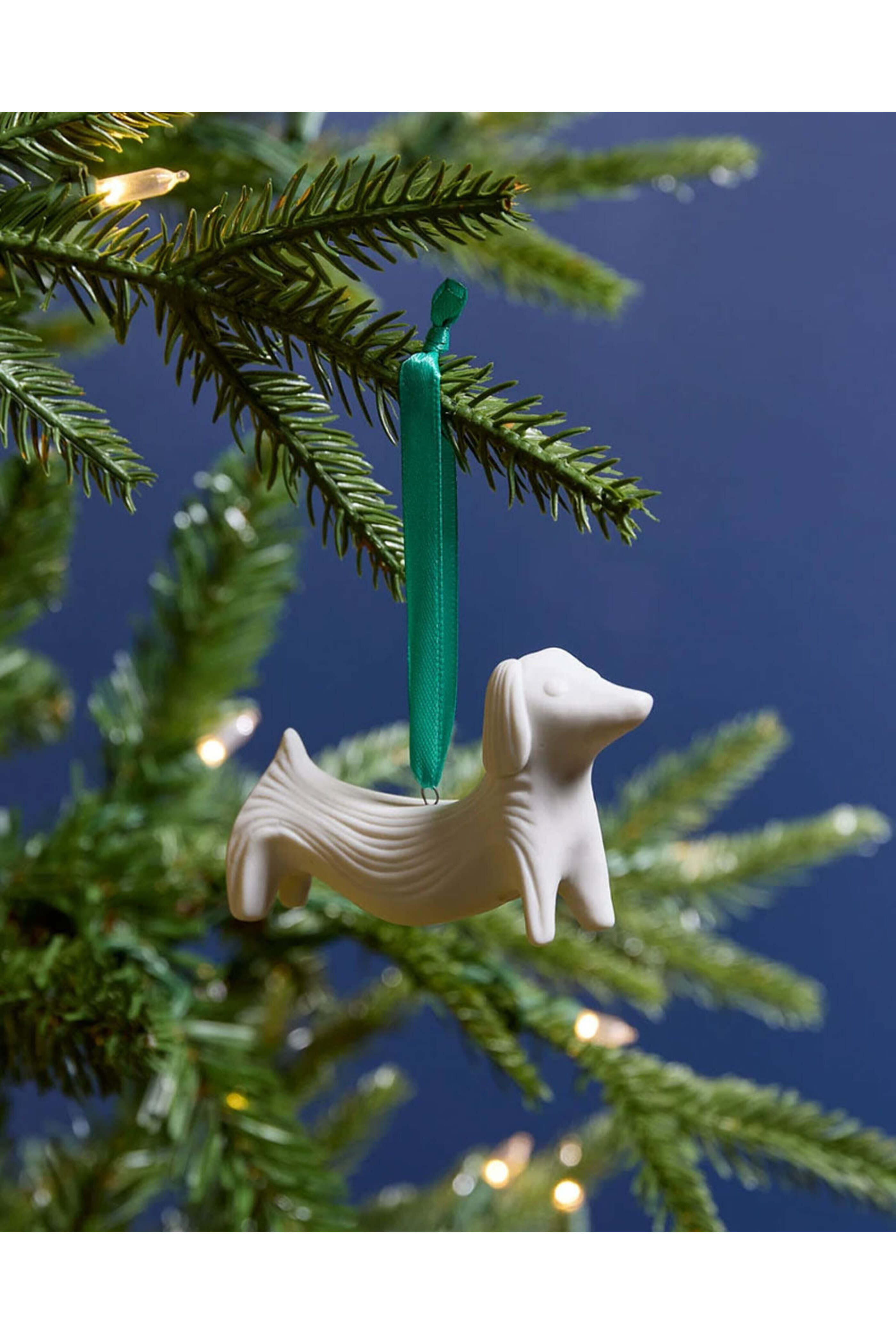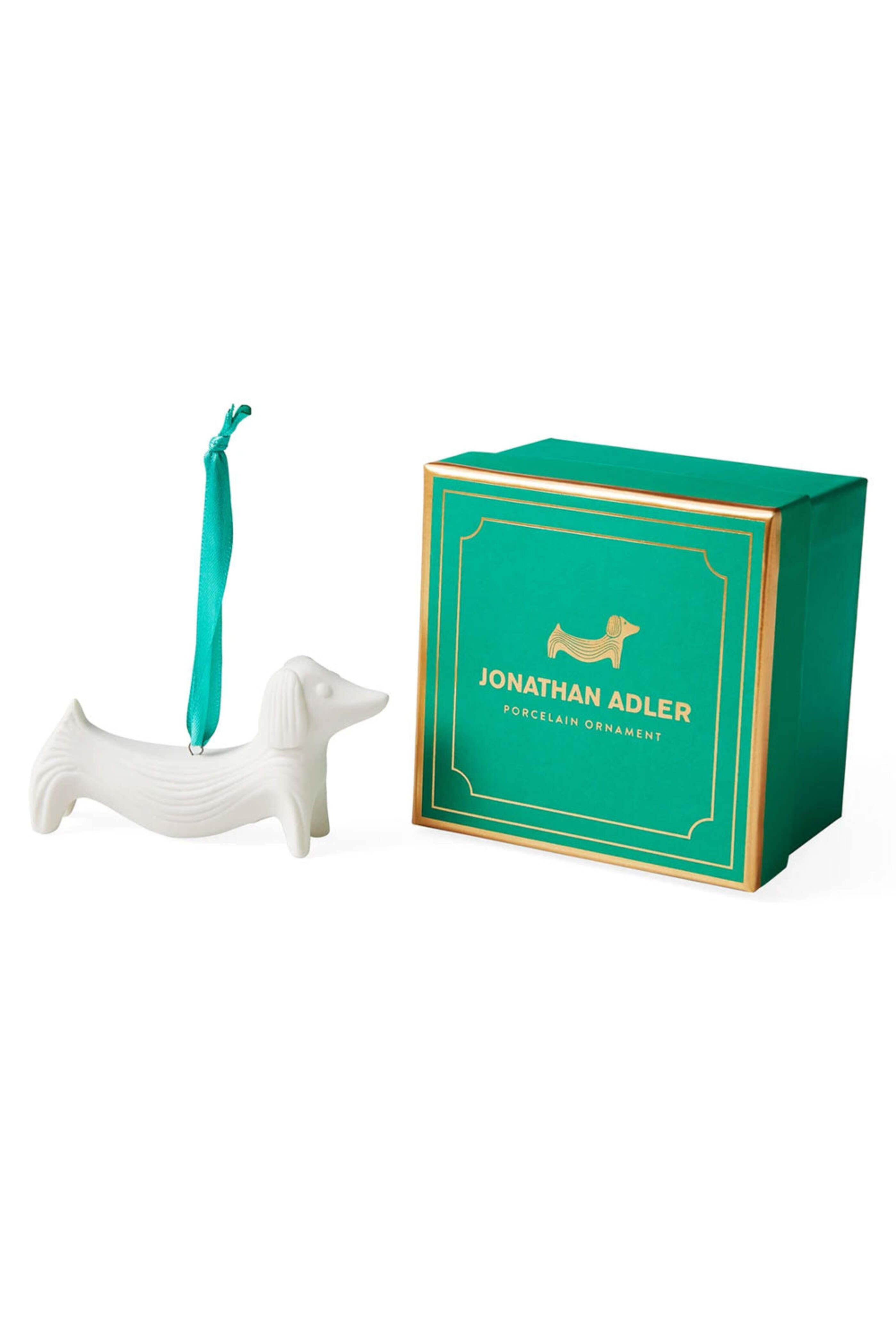 Jonathan Adler Dachshund Ornament. 3.5" W, 1.25" D, 2.25" H. High-fired unglazed porcelain. Boxed for easy gifting. Gift box: 4" W, 4" D, 3" H.