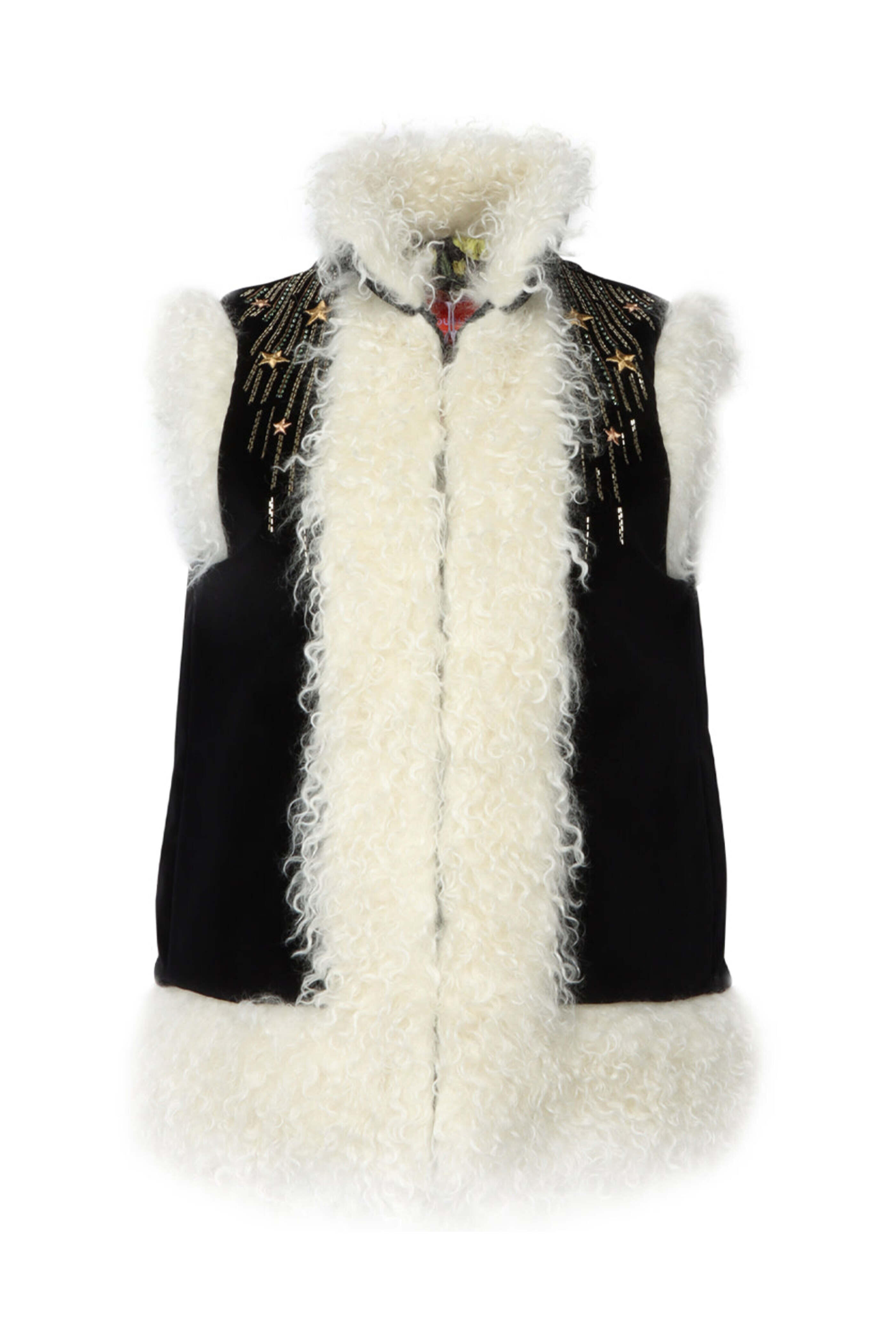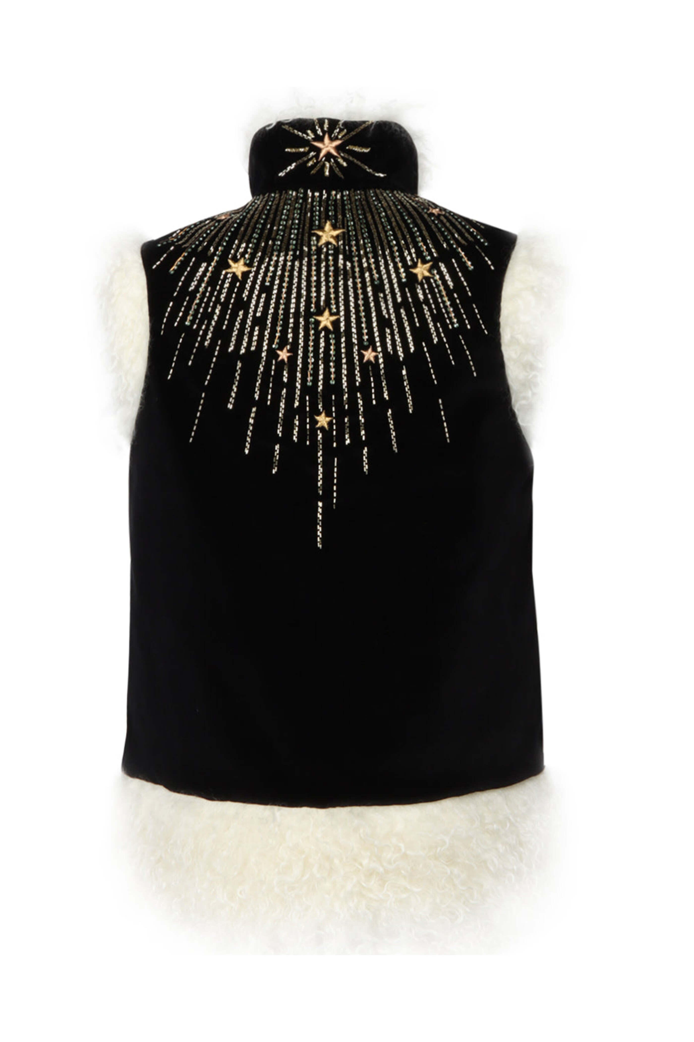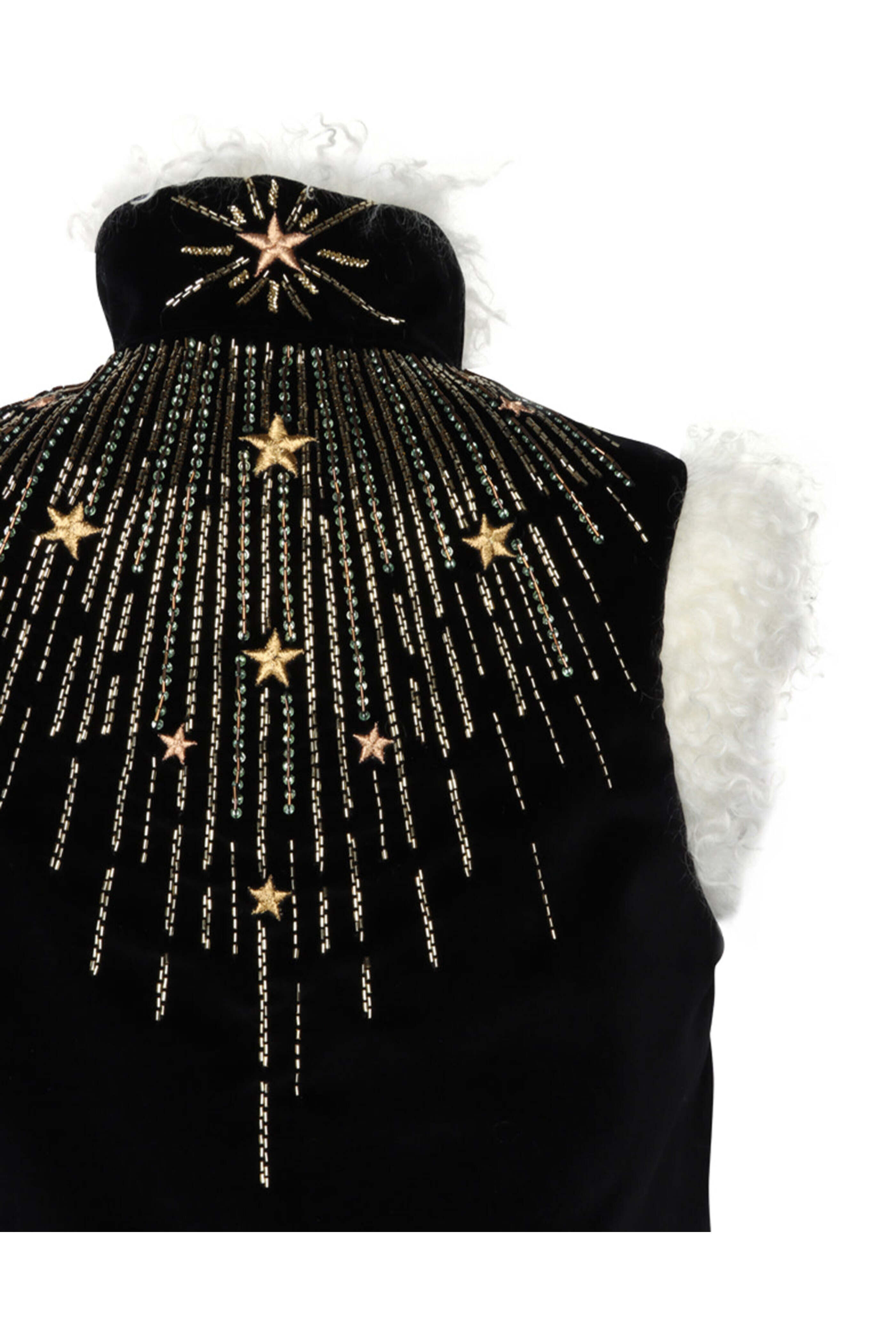 La DoubleJ Solid Embroidered Folk Vest. Stand collar. Sleeveless. Concealed hook and eye closure. Boxy fit. Shearling trim. Embroidered and beaded detail throughout. Velvet fabrication. Lined. 100% cotton outer 1, 100% mohair outer 2, 100% polyester lining.