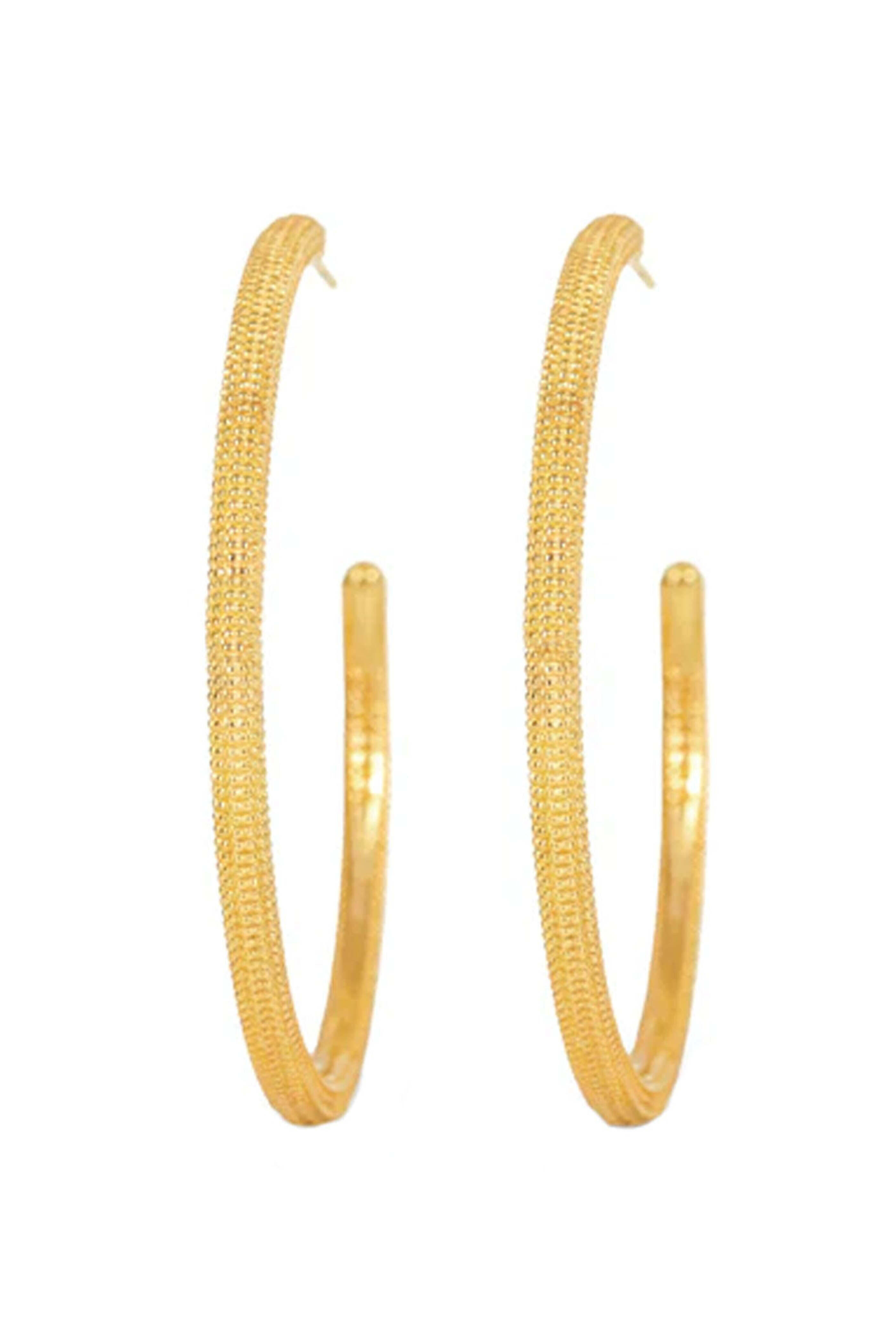 14k yellow gold. Textured design. Push back. Handcrafted in L.A.. 1.38 diameter.