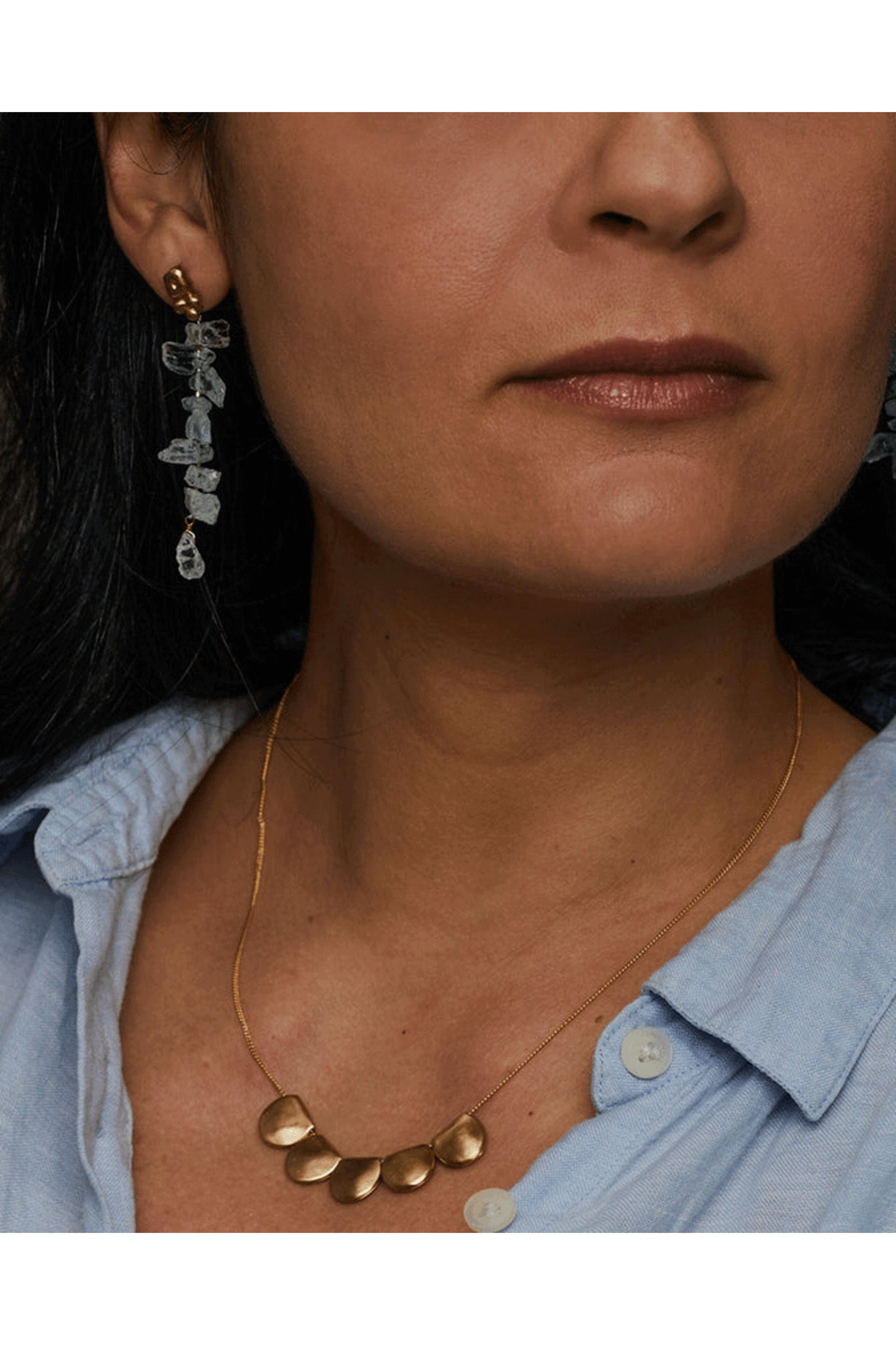 Julie Cohn Petite Ore Aquamarine Earrings. Bronze. Aquamarine. Cascading shards design. Links. Drop style. 2.5 L. Gold-filled post. Pushback post. Limited edition. Handcrafted in the USA.