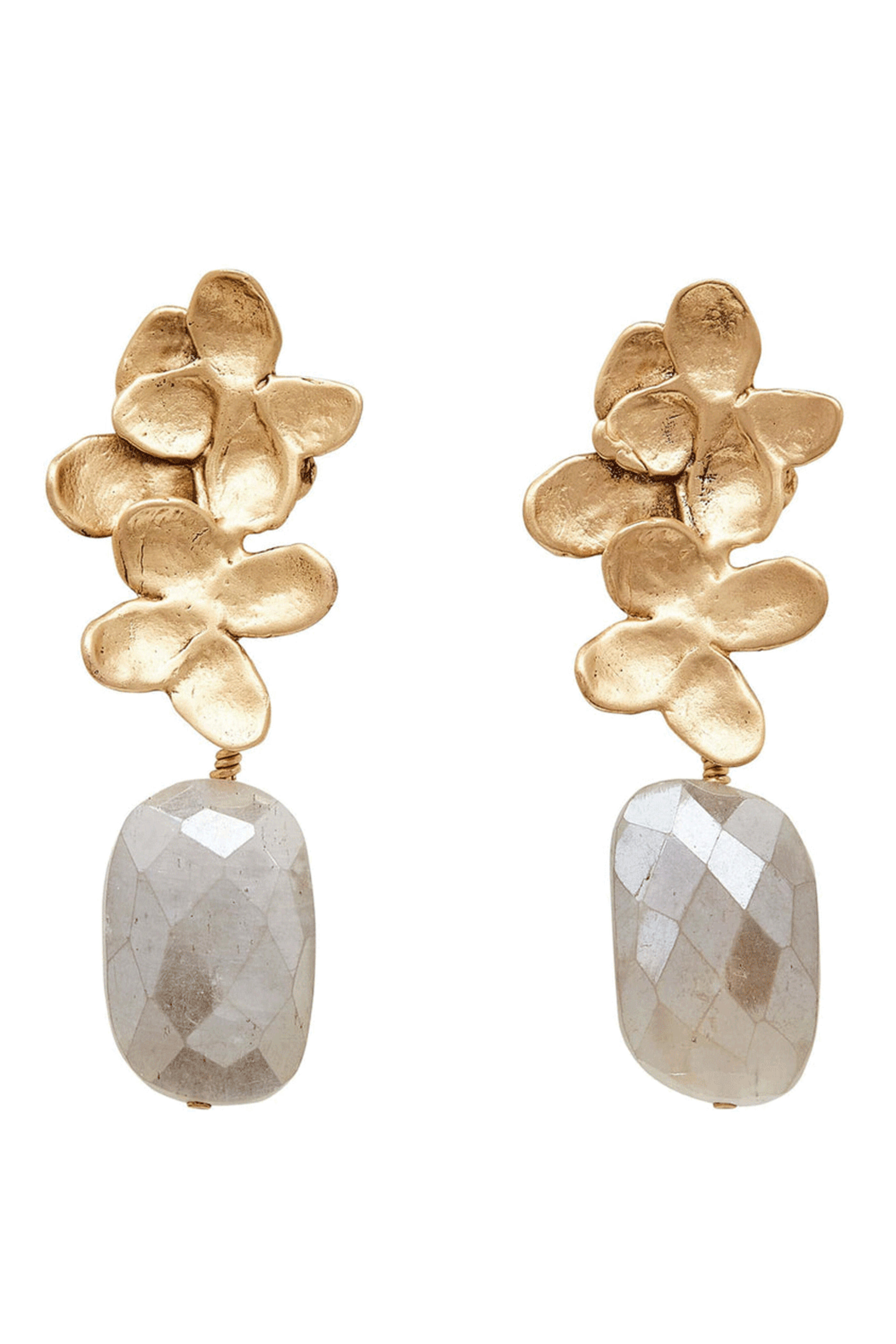 Julie Cohn Hydrangea Moonstone Earrings. Bronze. Moonstone. Hydrangea blossom inspired design. Drop style. 1.75. Gold-filled post. Push back post. Limited addition. Handcrafted in the USA.