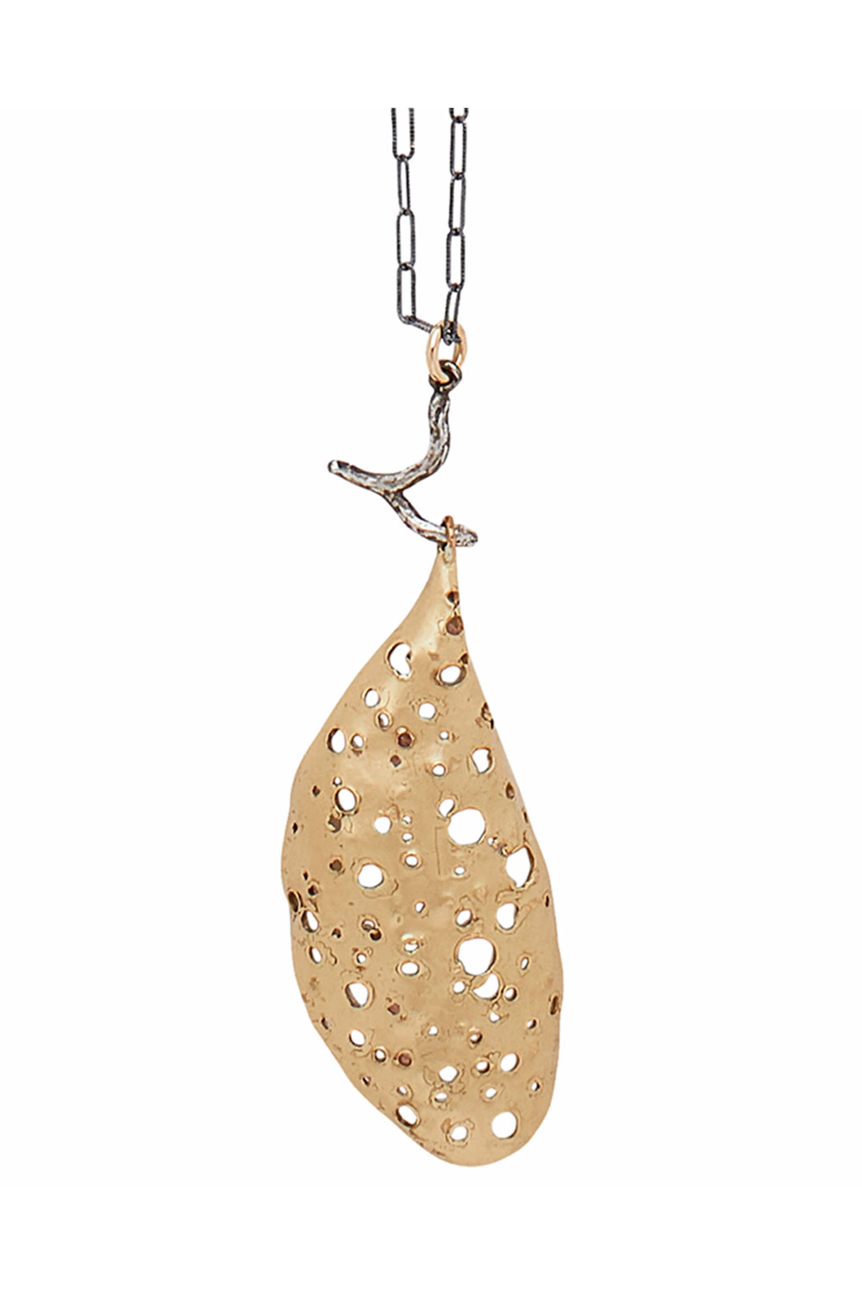 Julie Cohn Cocoon Bronze Pendant. hand fabricated and perforated in bronze with a sterling silver branch detail. Pendant is 2.5 inches. 32-inch sterling silver chain. Made in USA.