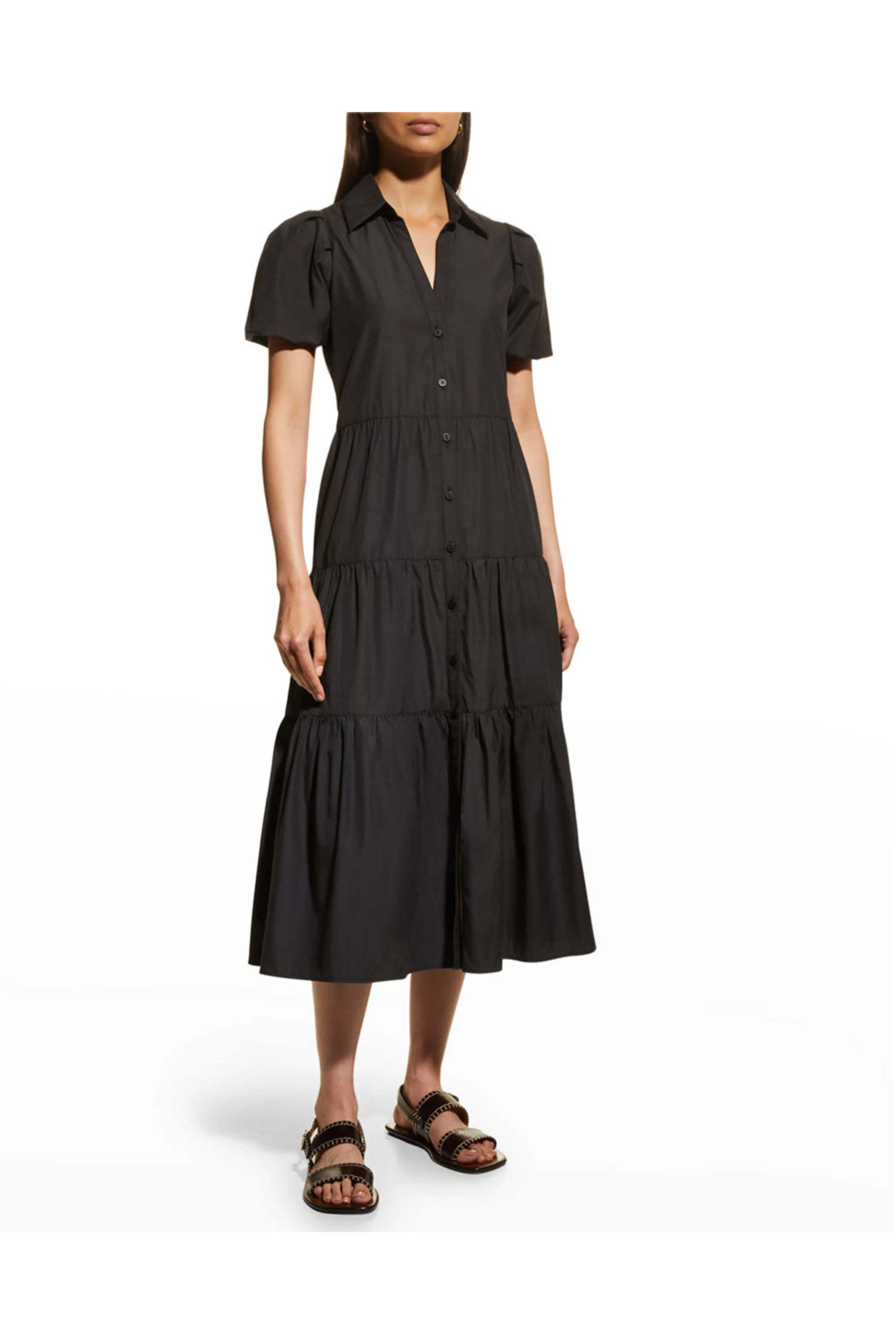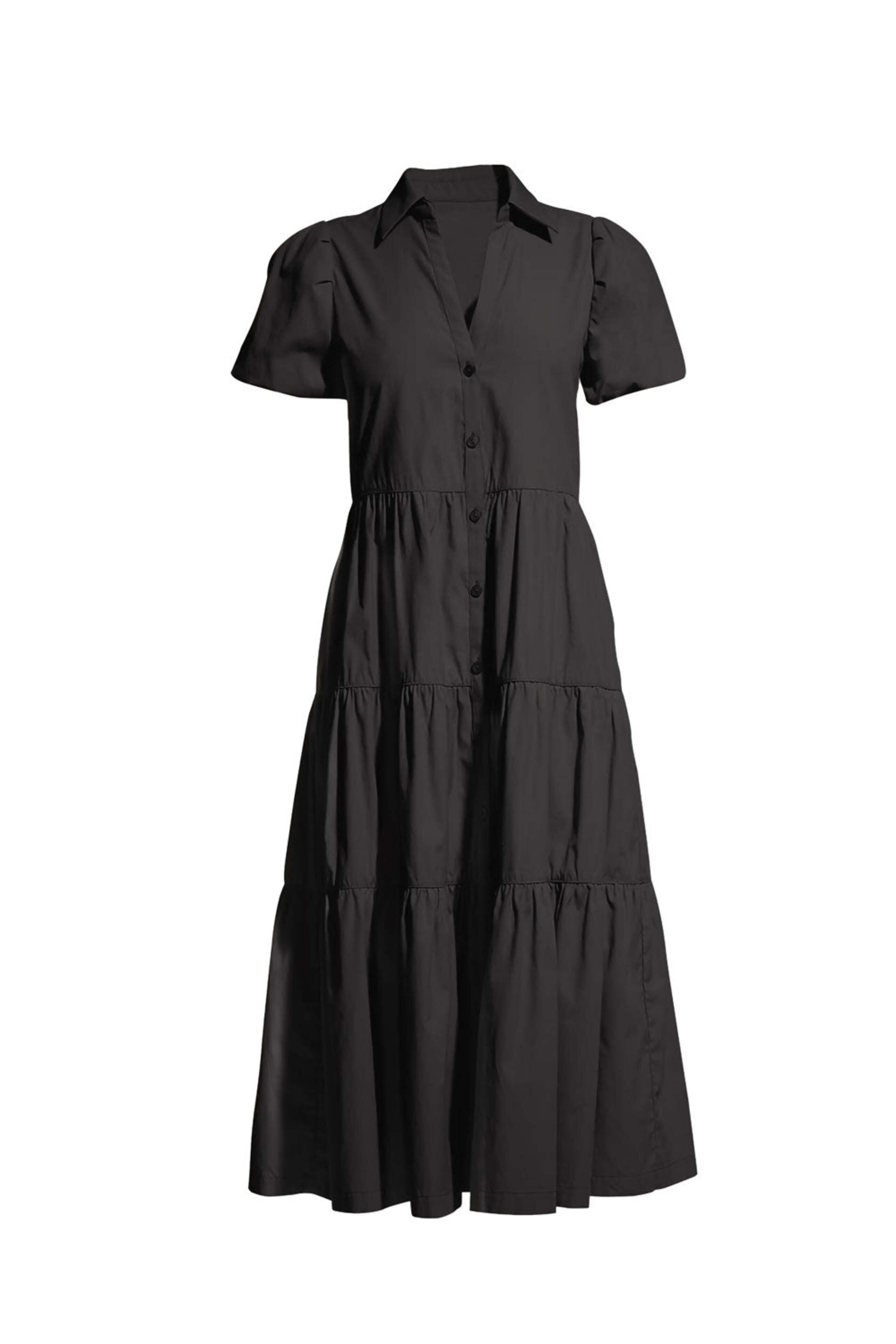 Collar. V neck. Short puff sleeves. Button down front closure. Tiered throughout. Relaxed fit. Midi length. Brochu Walker Washed Black Havana Dress. 65% polyester, 35% cotton.