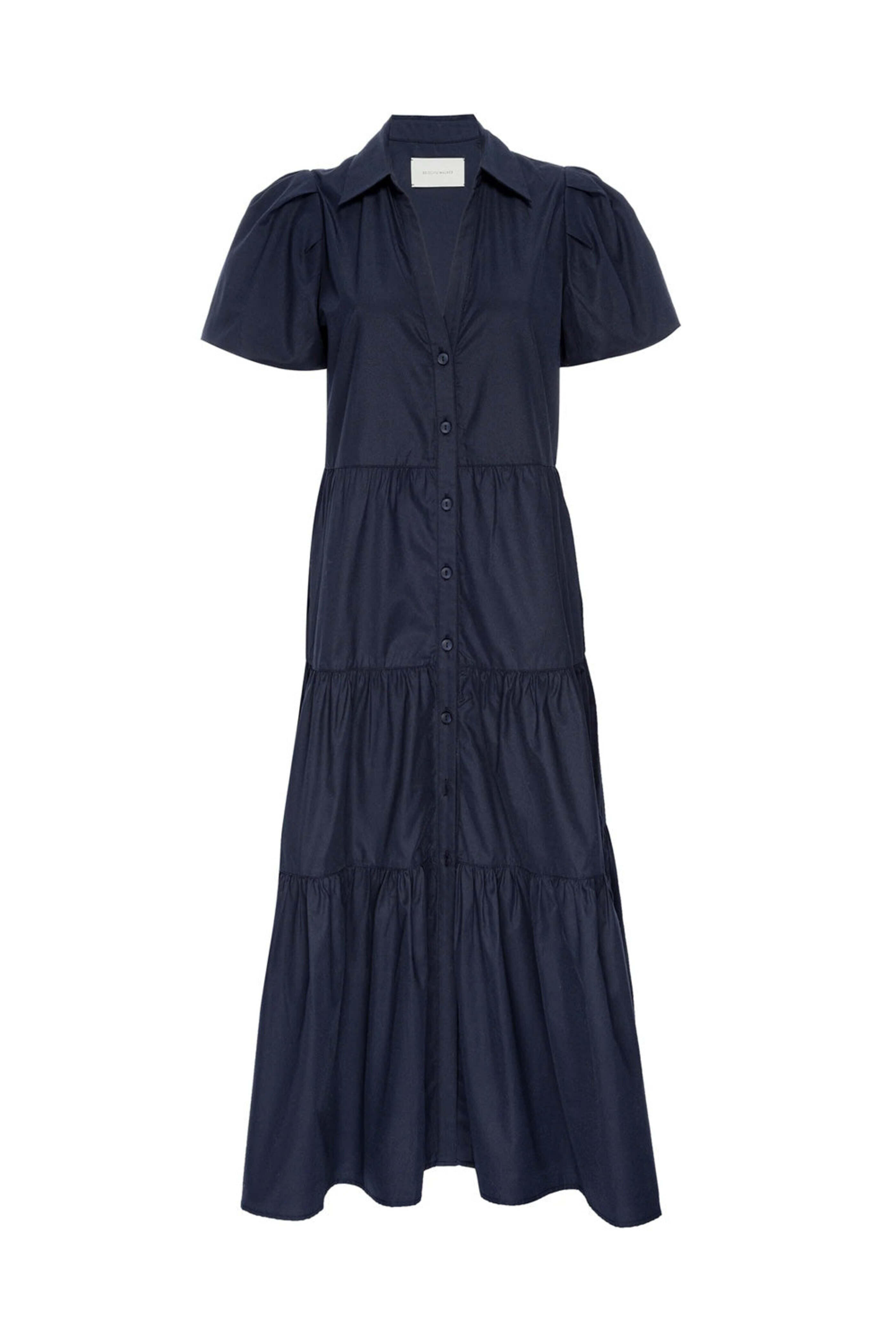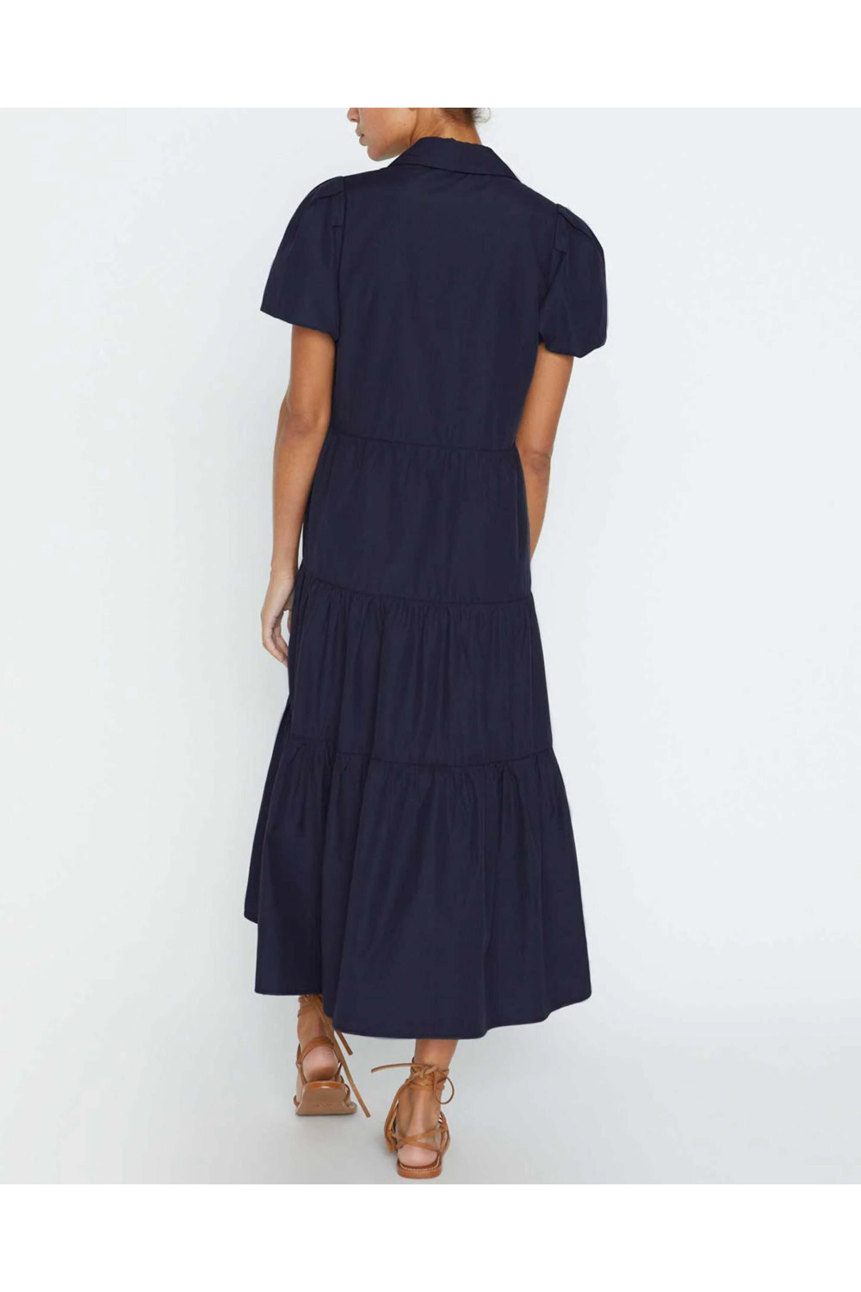 Brochu Walker Navy Havana Dress. Collar. V neck. Short sleeves. Button down front closure. Tiered silhouette. Relaxed fit. Midi length. 65% polyester, 35% cotton.