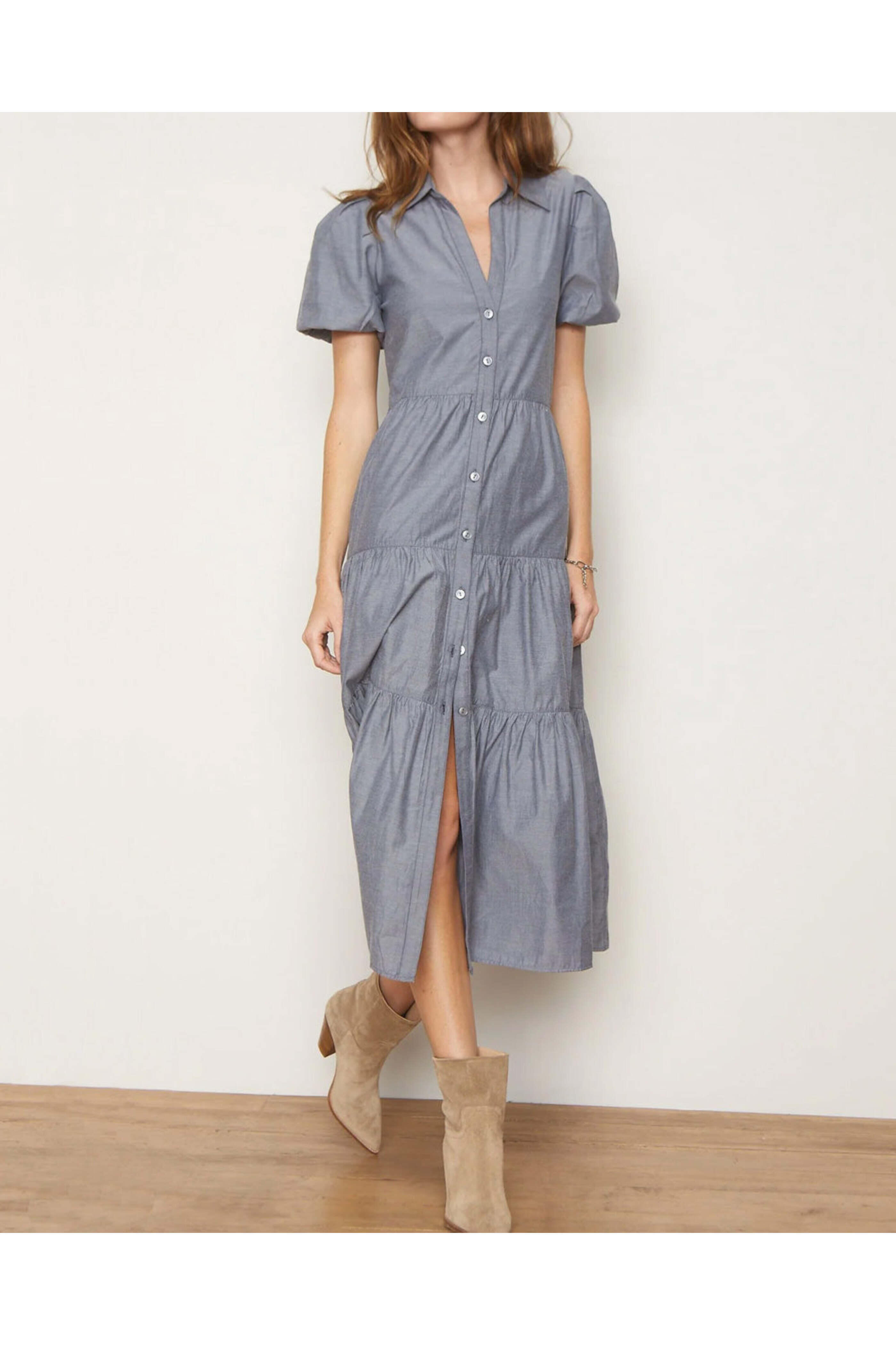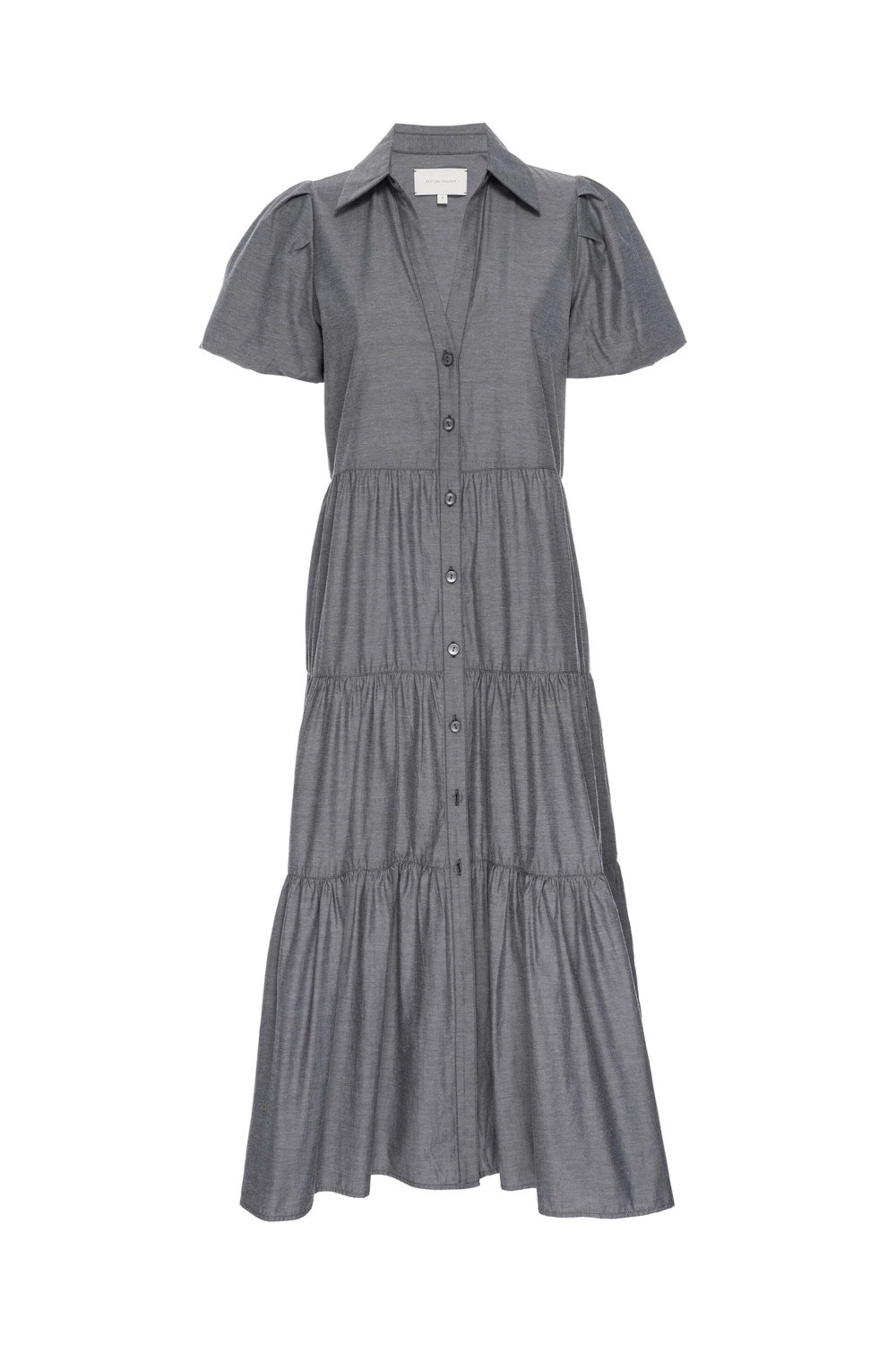 Collar. V neck. Short sleeves. Button down front closure. Tiered silhouette. Relaxed fit. Midi length. Brochu Walker Washed Slate Havana Dress. 65% polyester, 35% cotton.