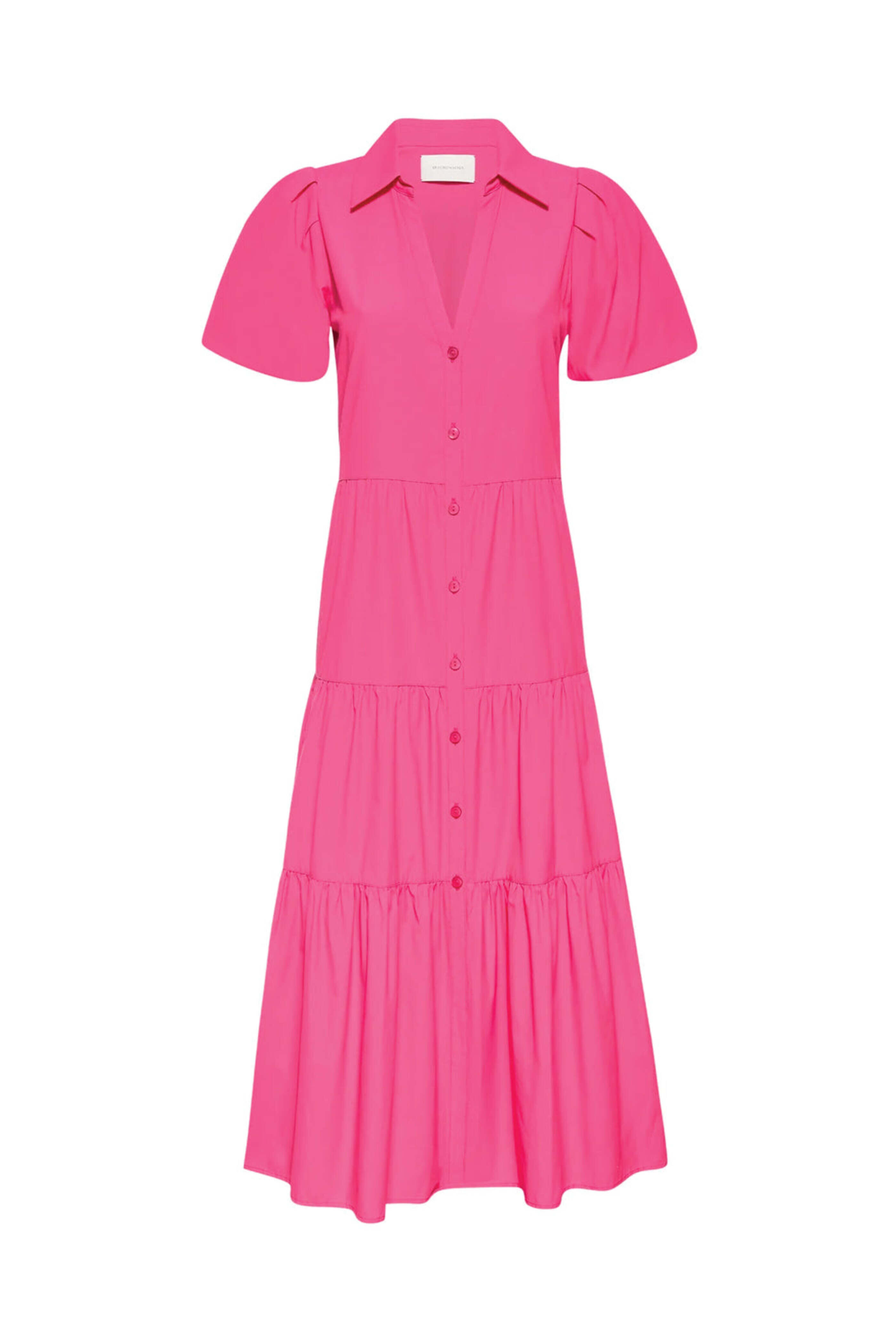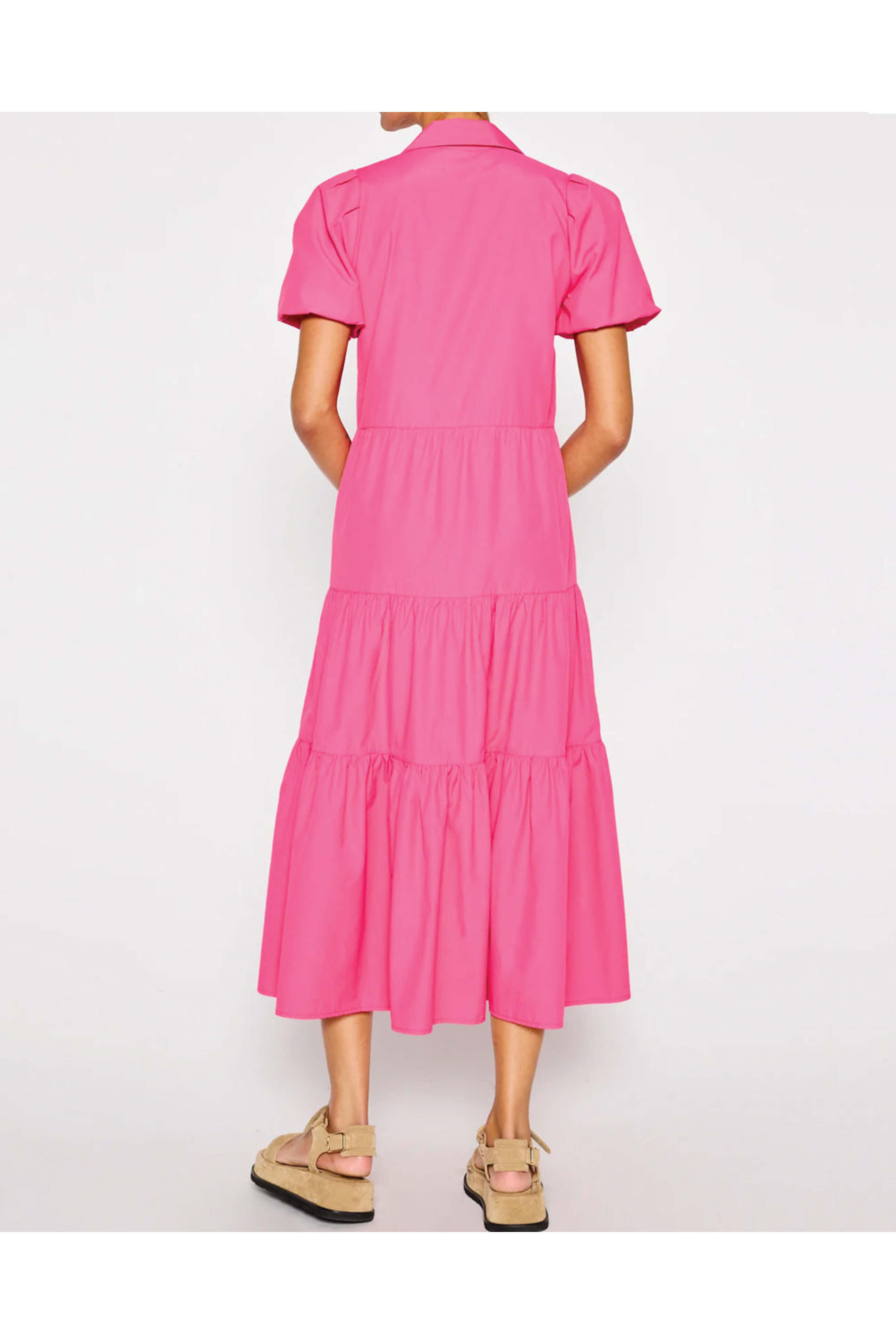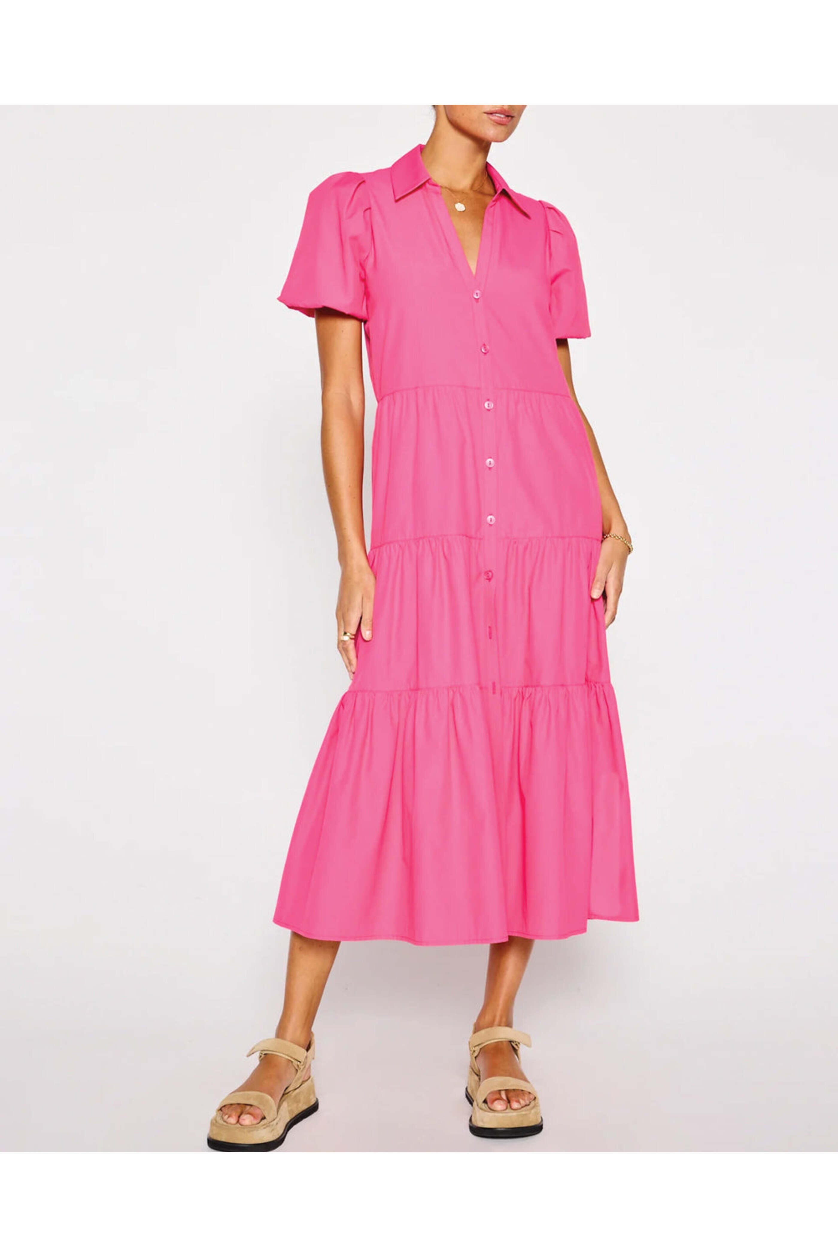 Brochu Walker Hot Pink Havana Dress. Collar. V neck. Short sleeves. Button down front closure. Tiered silhouette. Relaxed fit. Midi length. 65% polyester, 35% cotton.