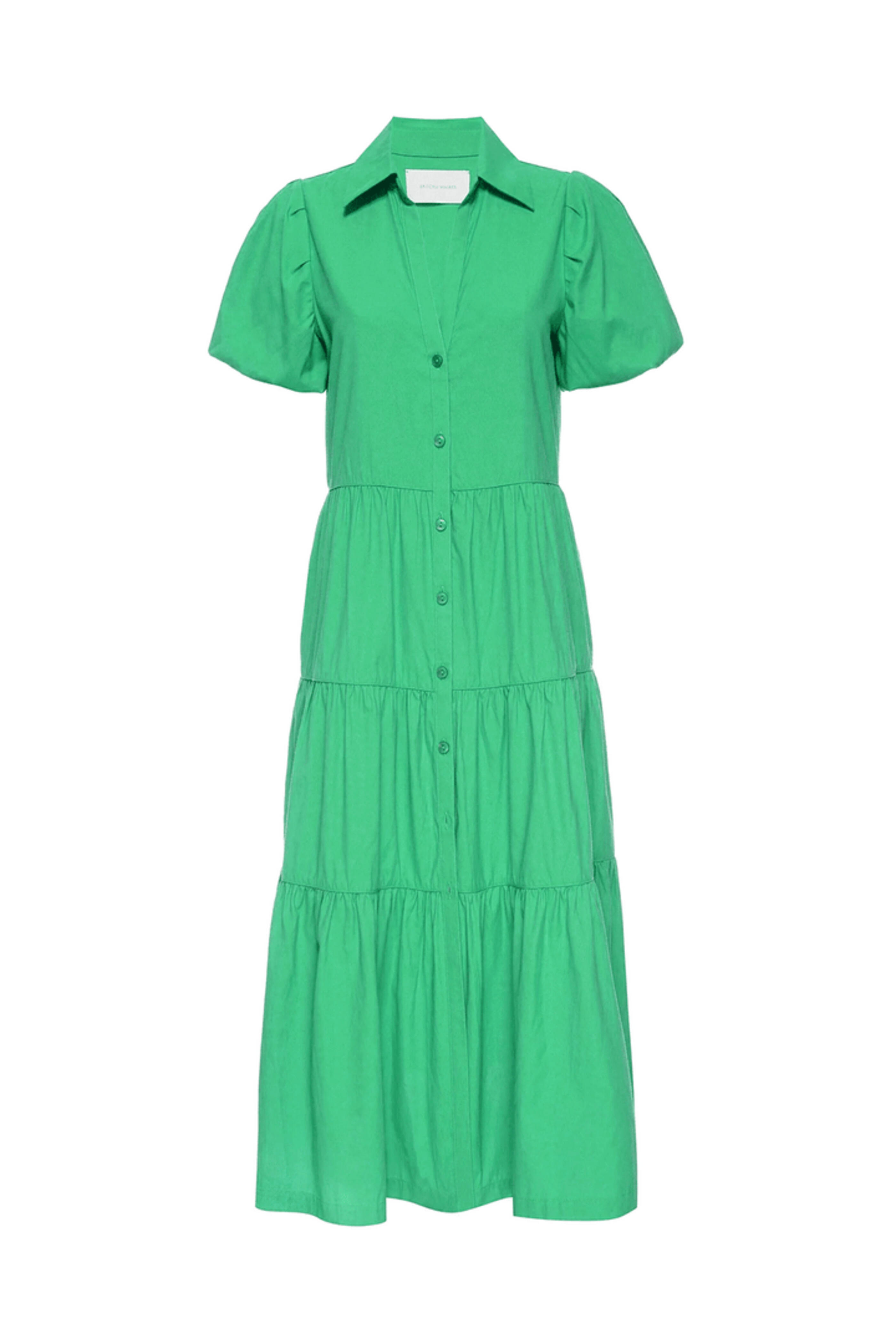 Brochu Walker Derby Green Havana Dress. Collar. V neck. Short puff sleeves. Button down front closure. Tiered throughout. Relaxed fit. Midi length. 65% polyester, 35% cotton.