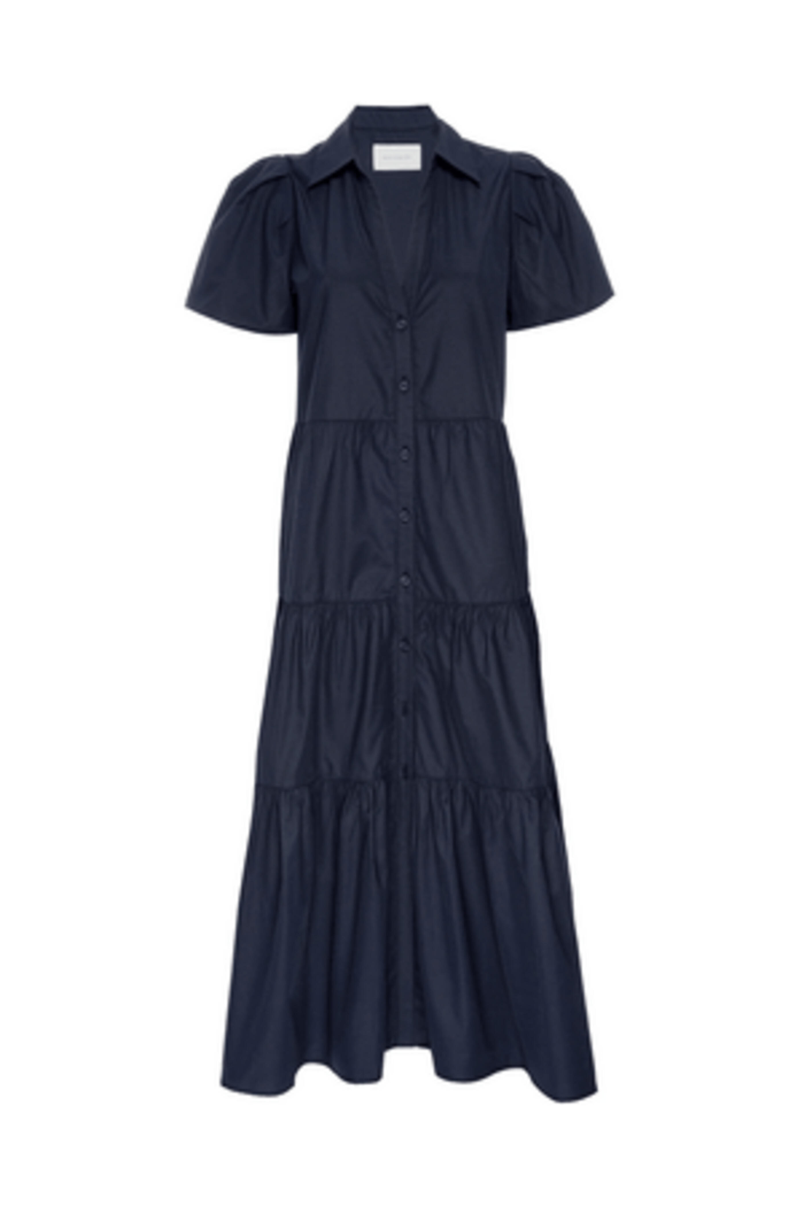 Brochu Walker Navy Havana Dress. Collar. V neck. Short puff sleeves. Button down front closure. Tiered throughout. Relaxed fit. Midi length. 65% polyester, 35% cotton.