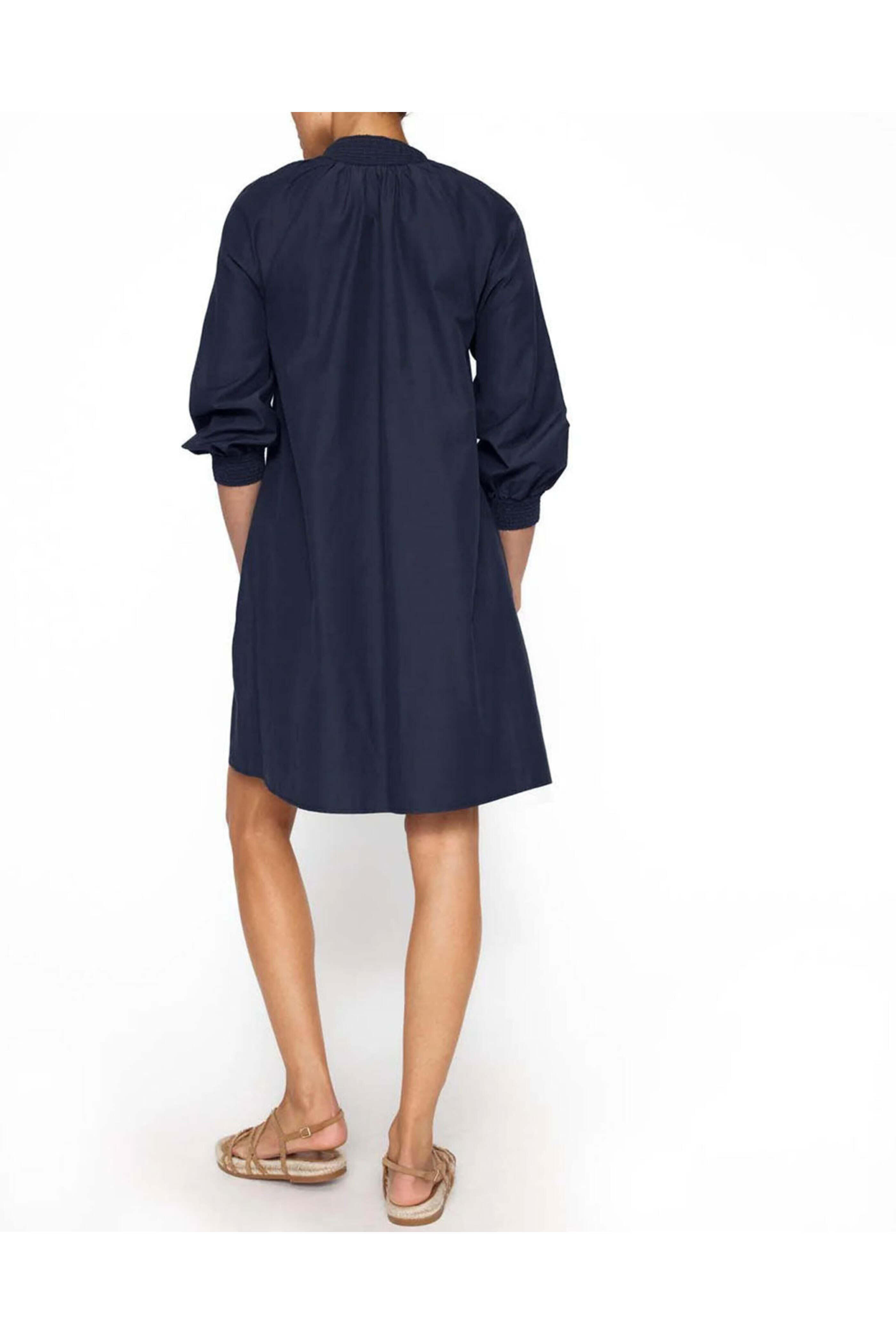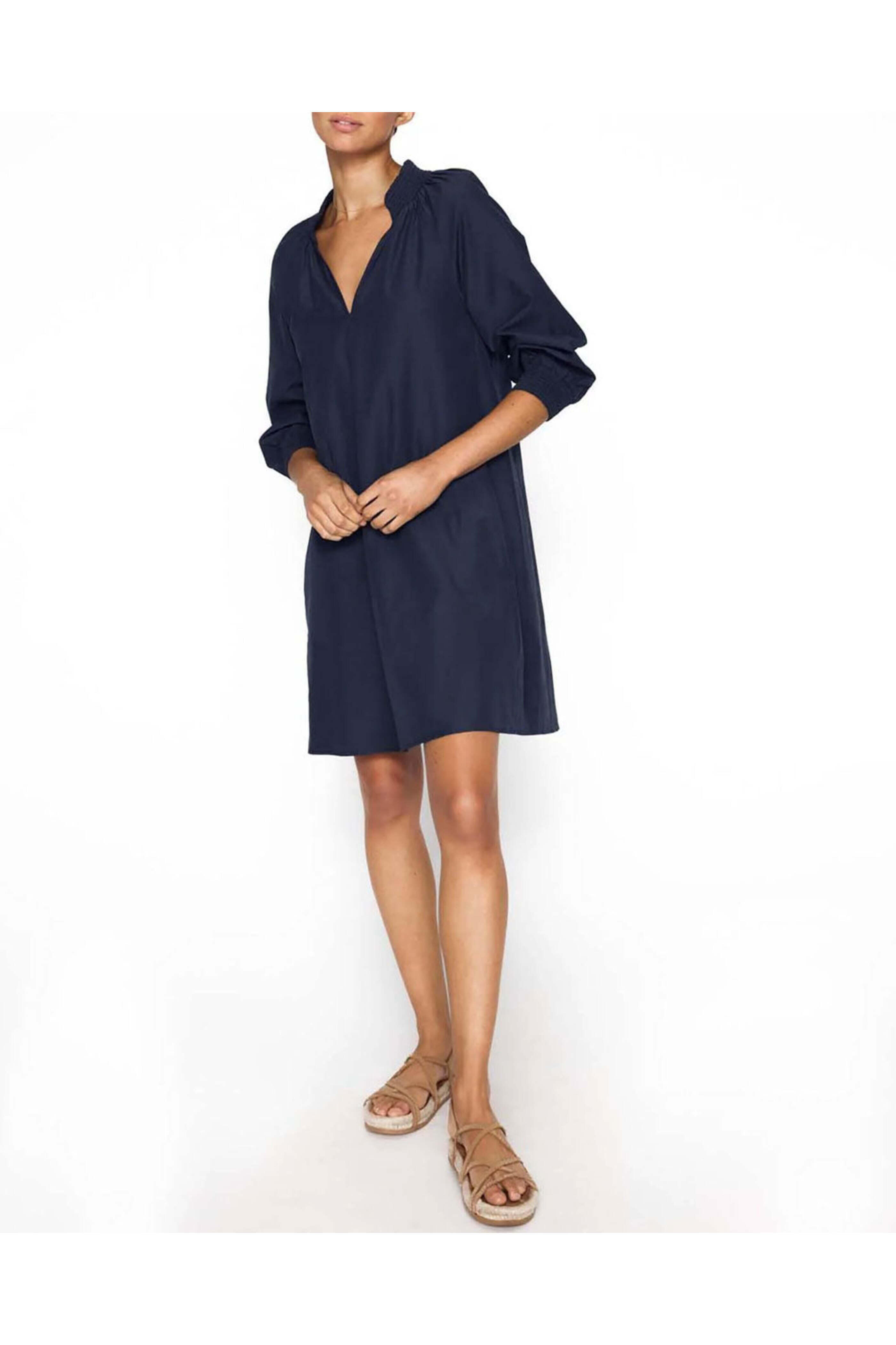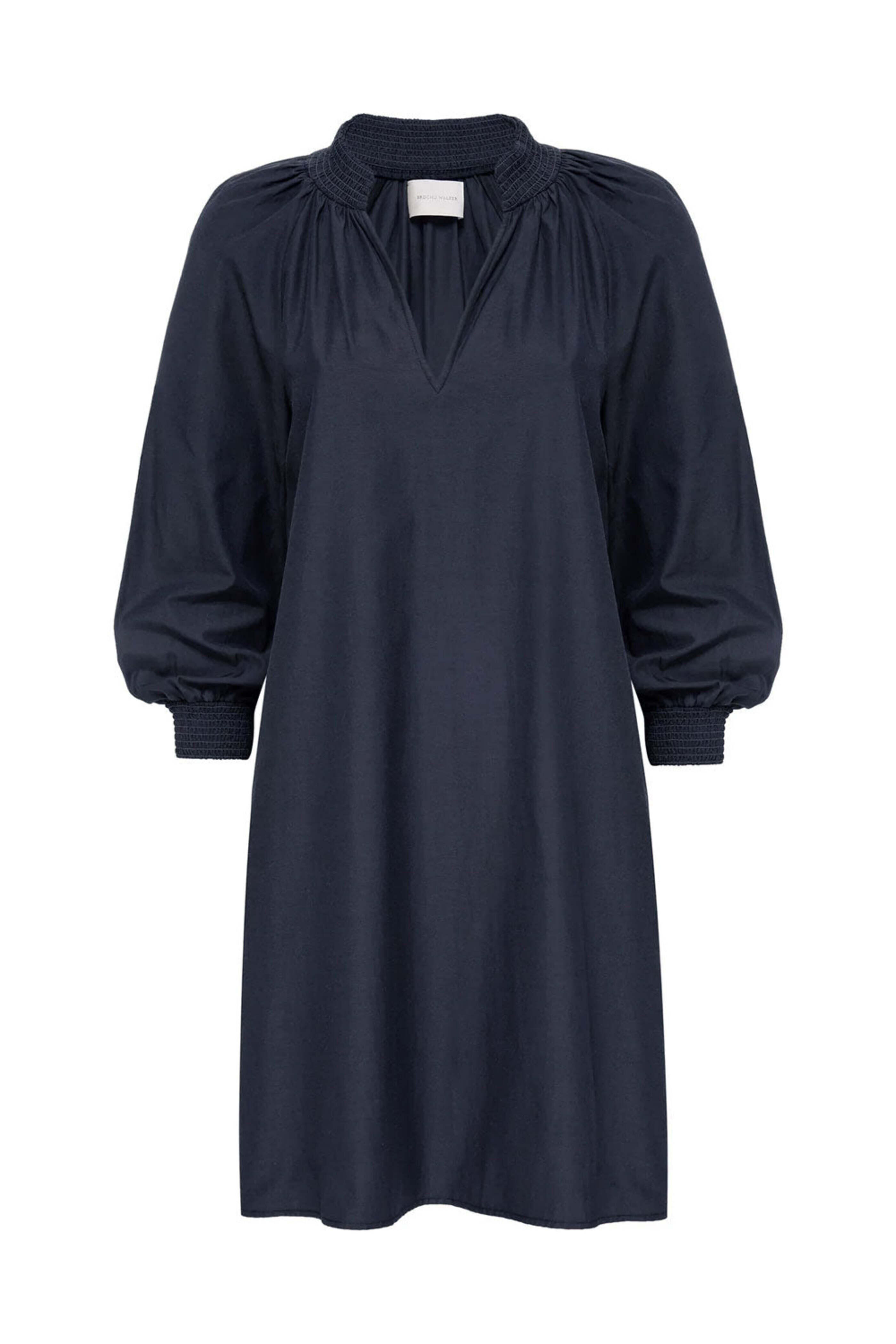 Brochu Walker Navy Amaia Dress. Split v neck; smocked collar. ¾ length raglan sleeves; smocked cuffs. Side slip pockets. Relaxed fit. Rounded hem. 65% polyester, 35% cotton.
