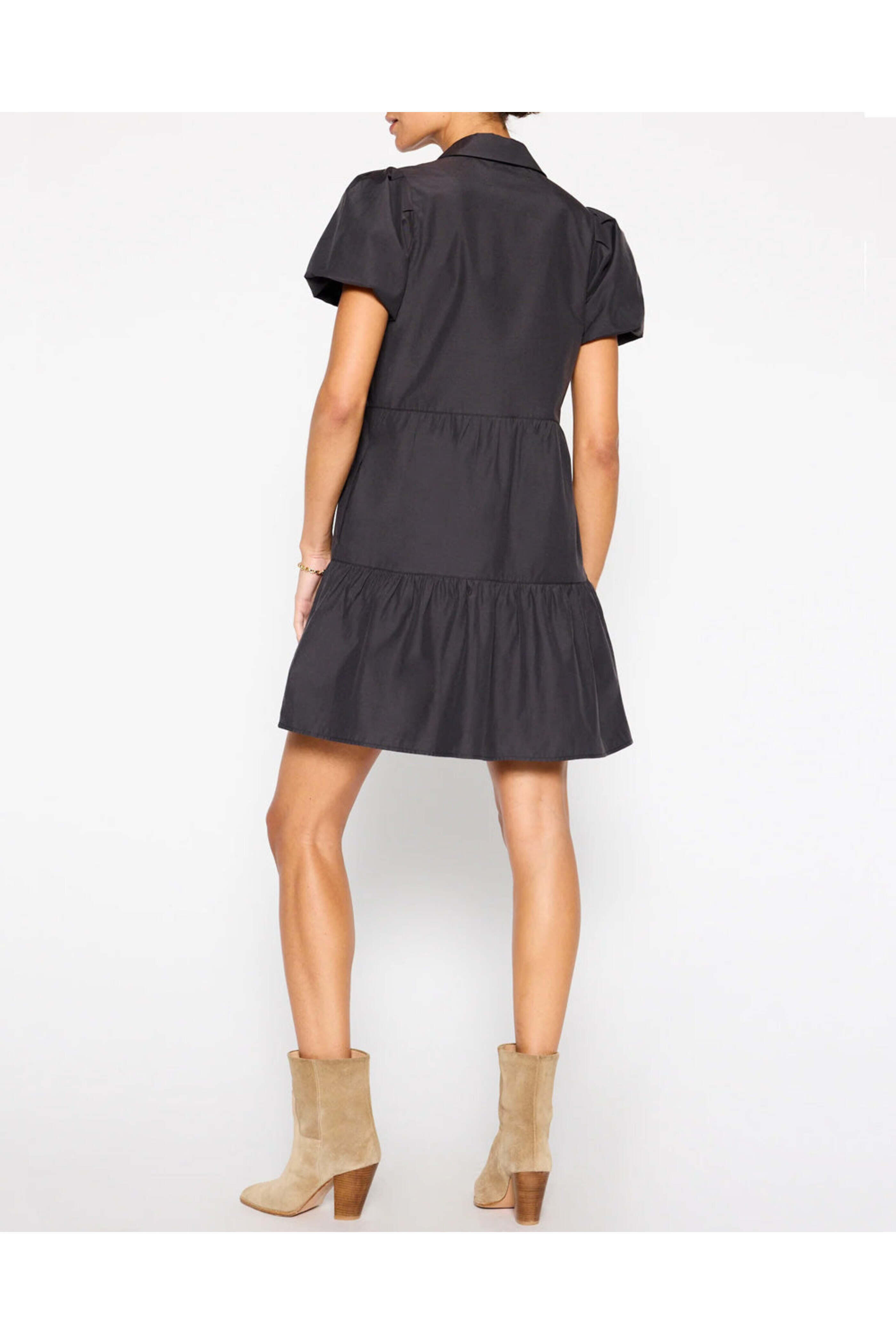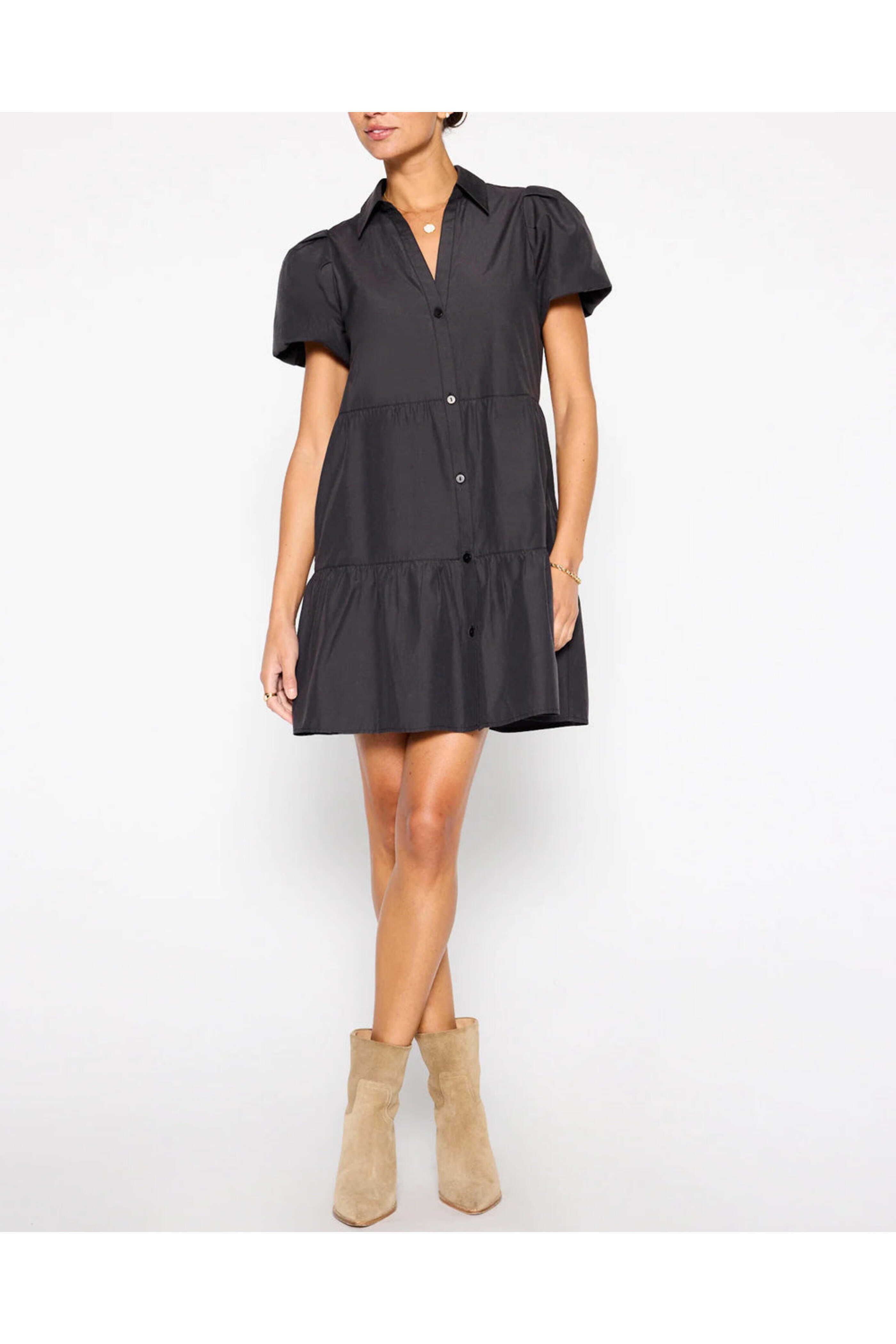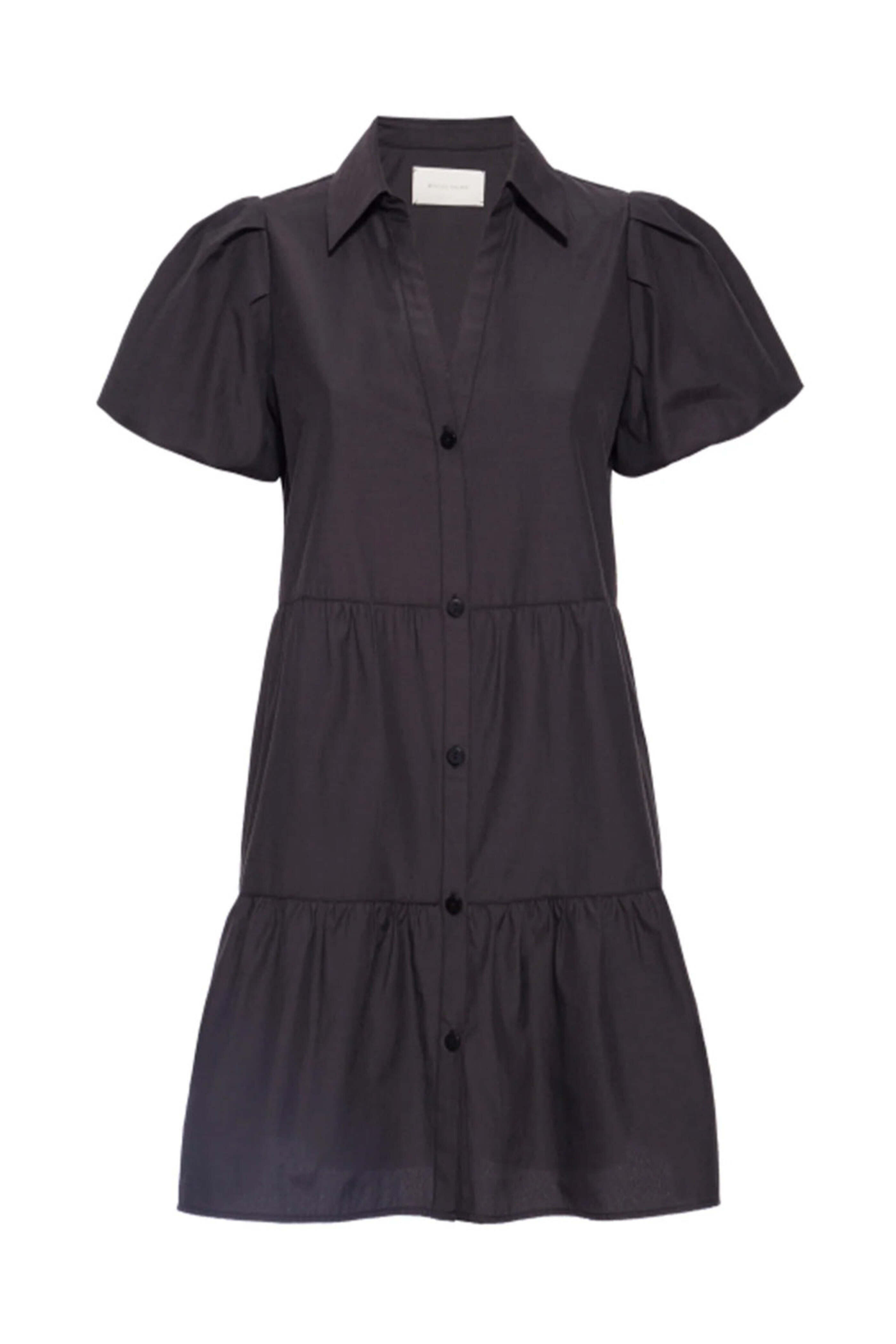 Collar. V neck. Short sleeves. Button down front closure. Tiered silhouette. Relaxed fit. Mini length. Brochu Walker Washed Black Havana Mini Dress. 65% polyester, 35% cotton.