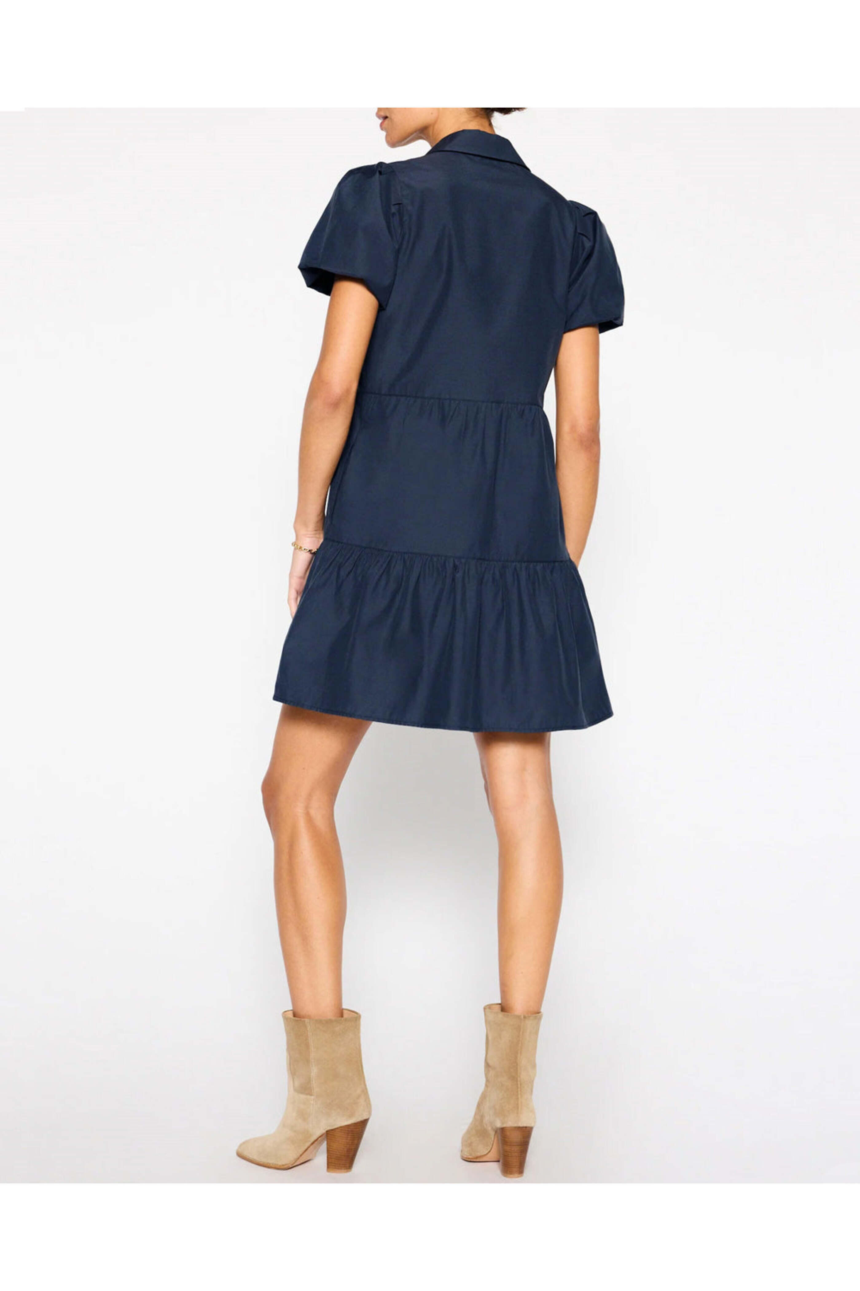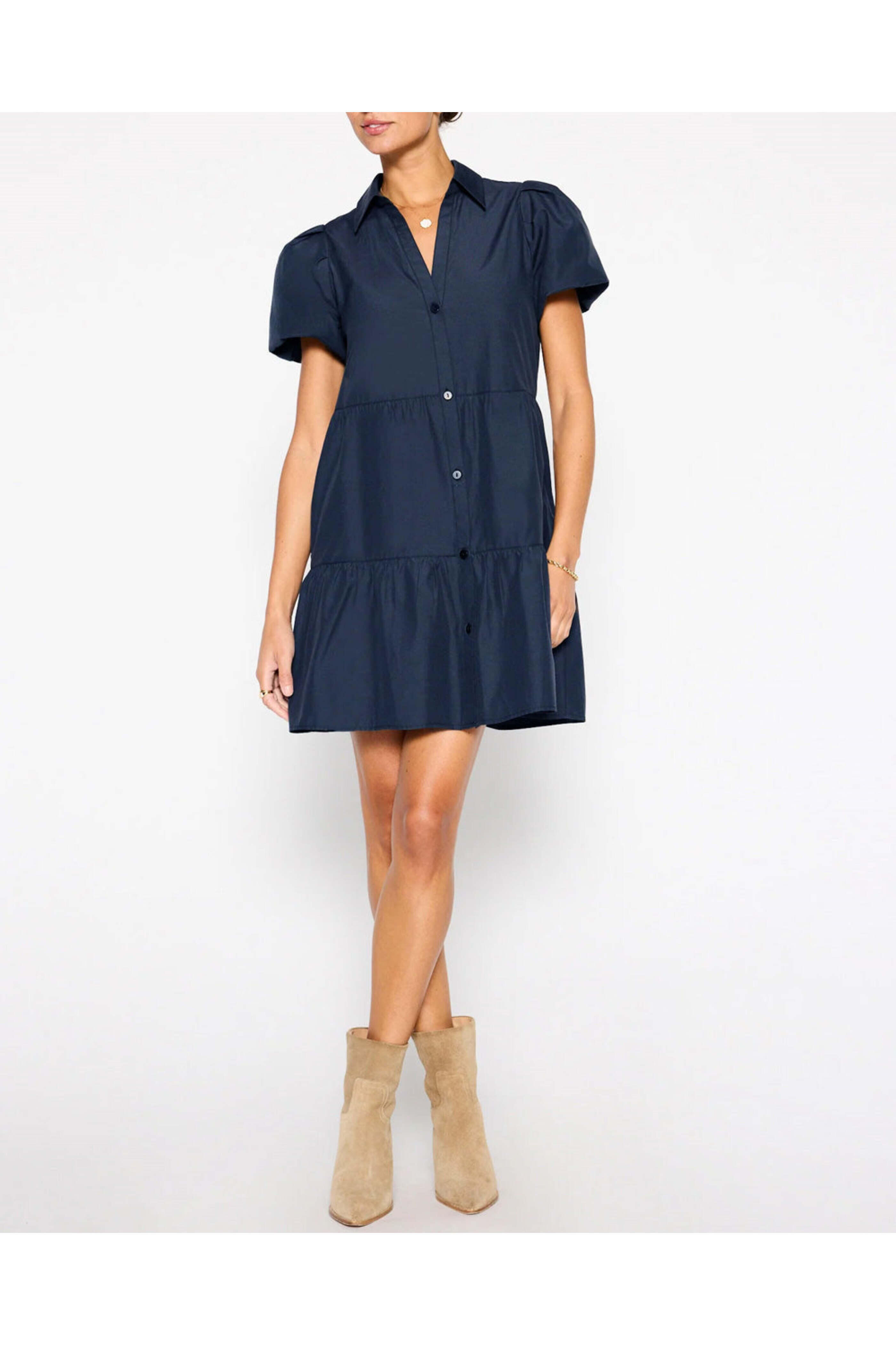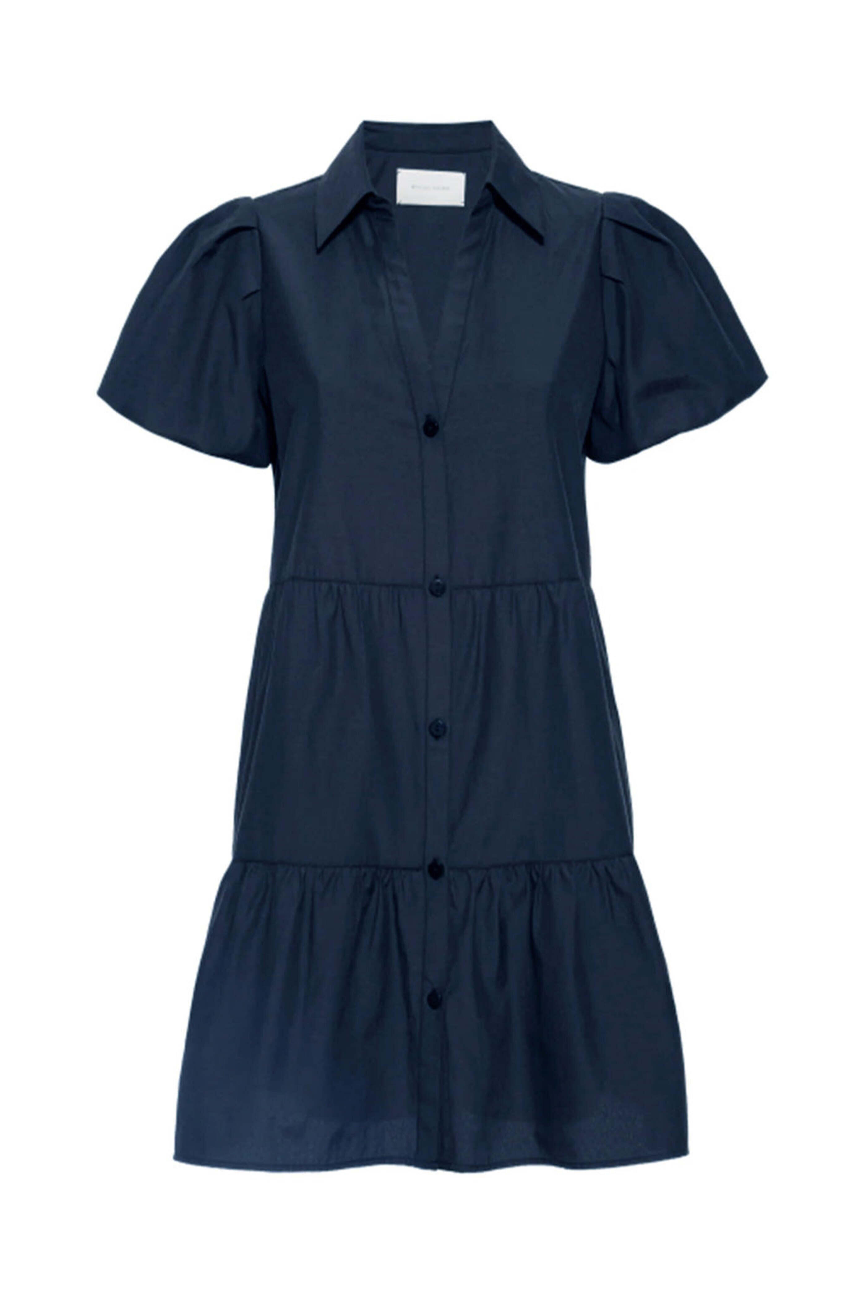 Brochu Walker Navy Havana Mini Dress. Collar. V neck. Short sleeves. Button down front closure. Tiered silhouette. Relaxed fit. Mini length. 65% polyester, 35% cotton.