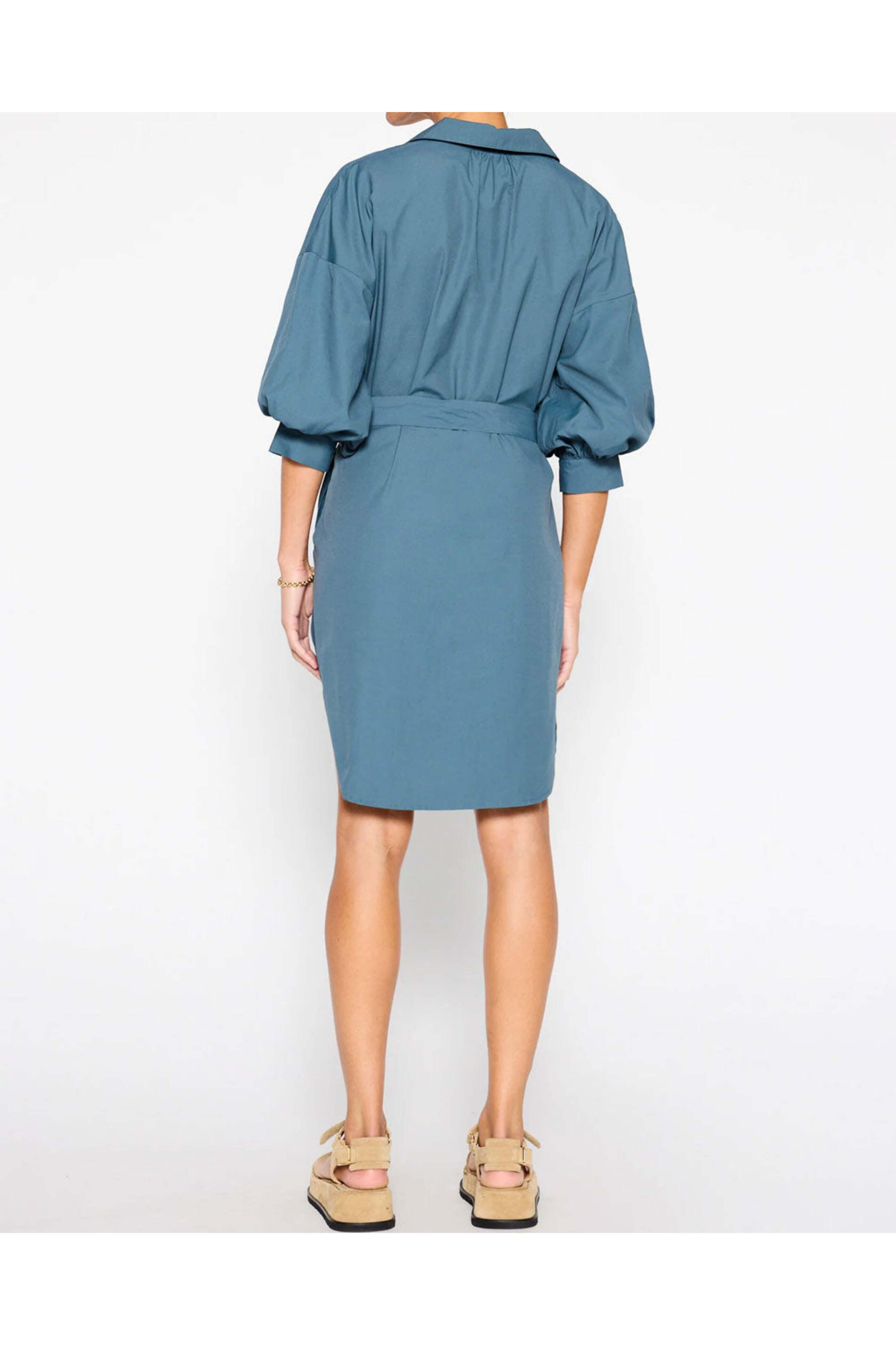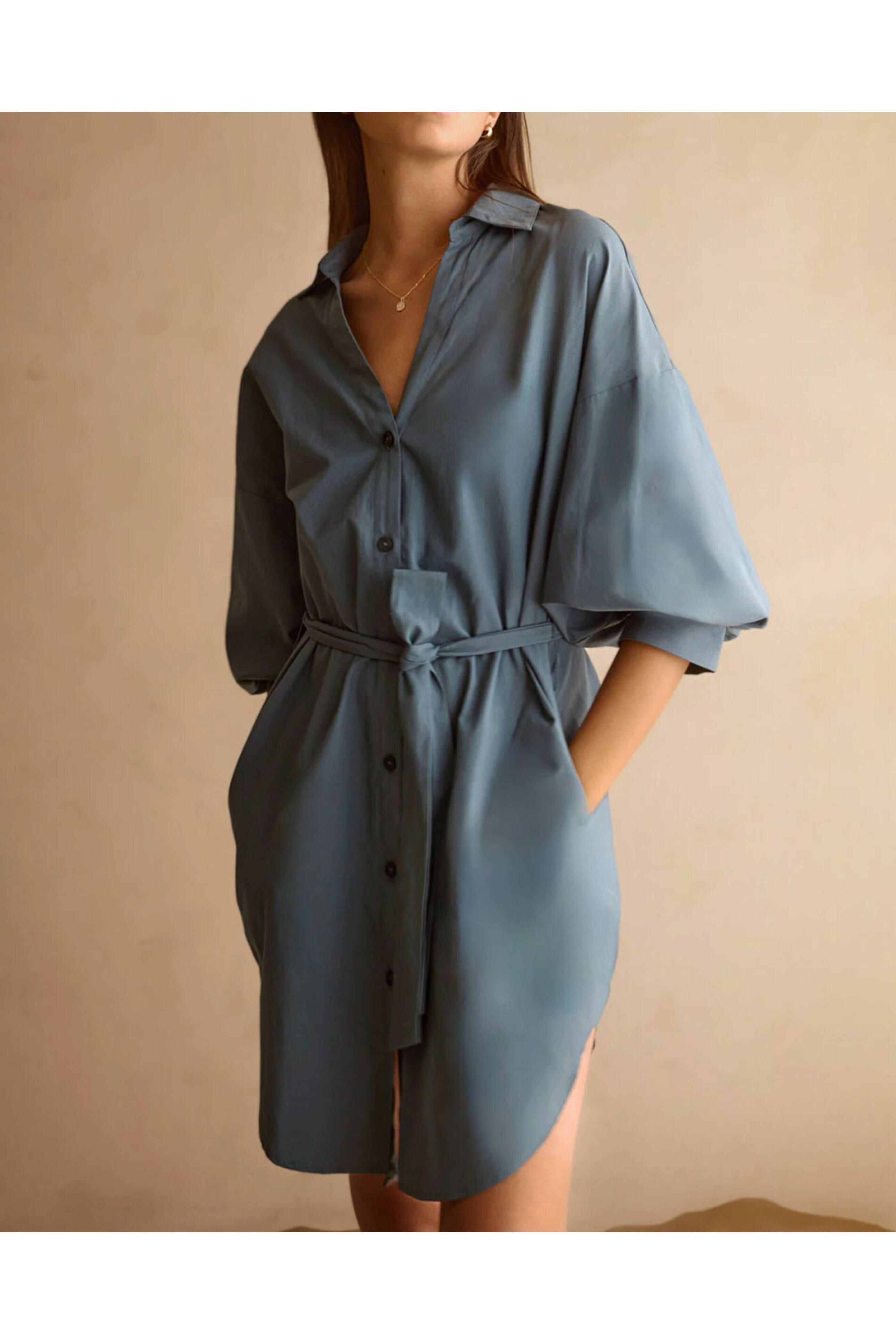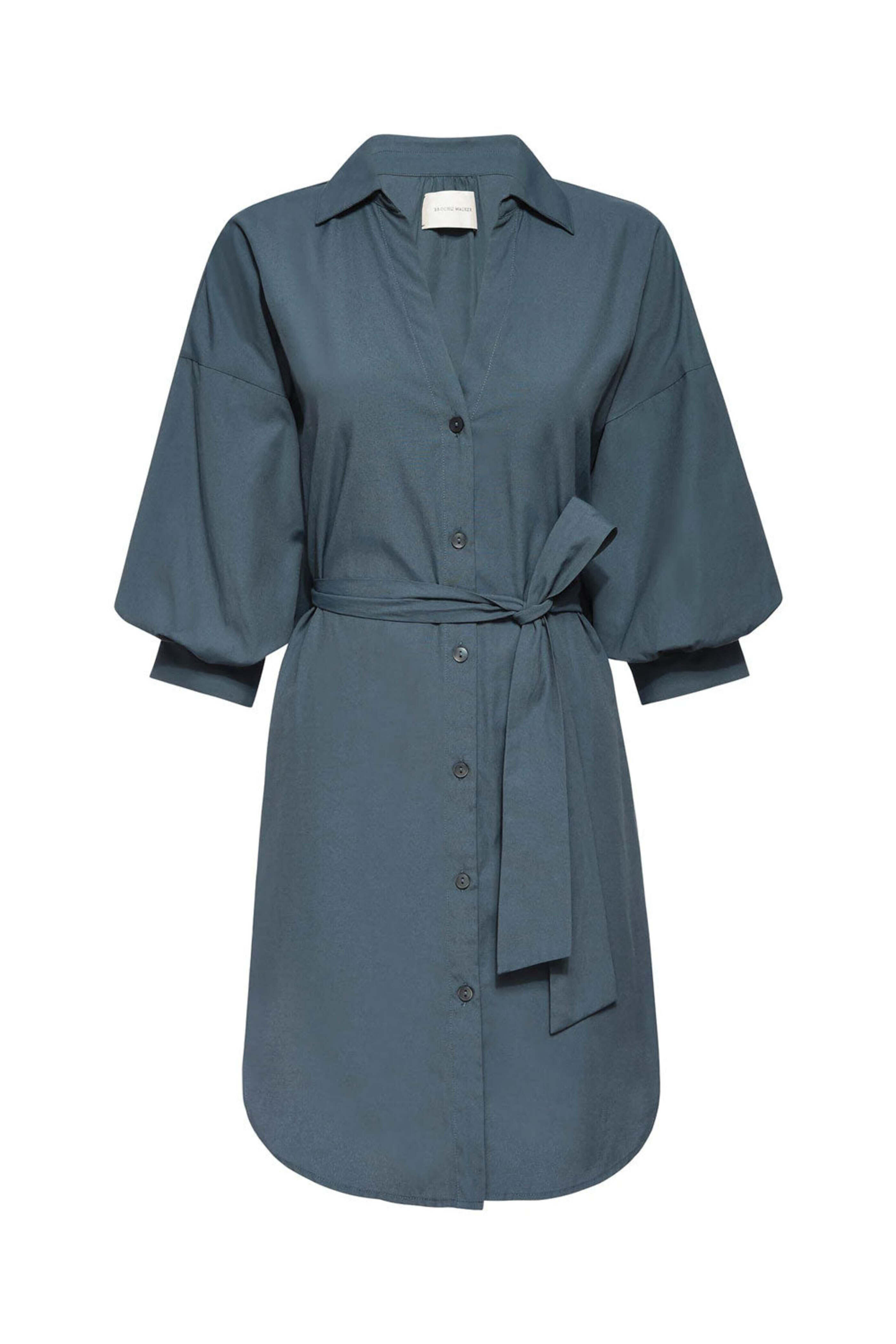 Brochu Walker Ocean Kate-Belted Dress . Collared v-neckline. Elbow length sleeves with a blouson effect. Button front closure . Self, removable belt. Scooped, shirttail hem. Relaxed fit . Mini . 65% Polyester/35% Cotton.