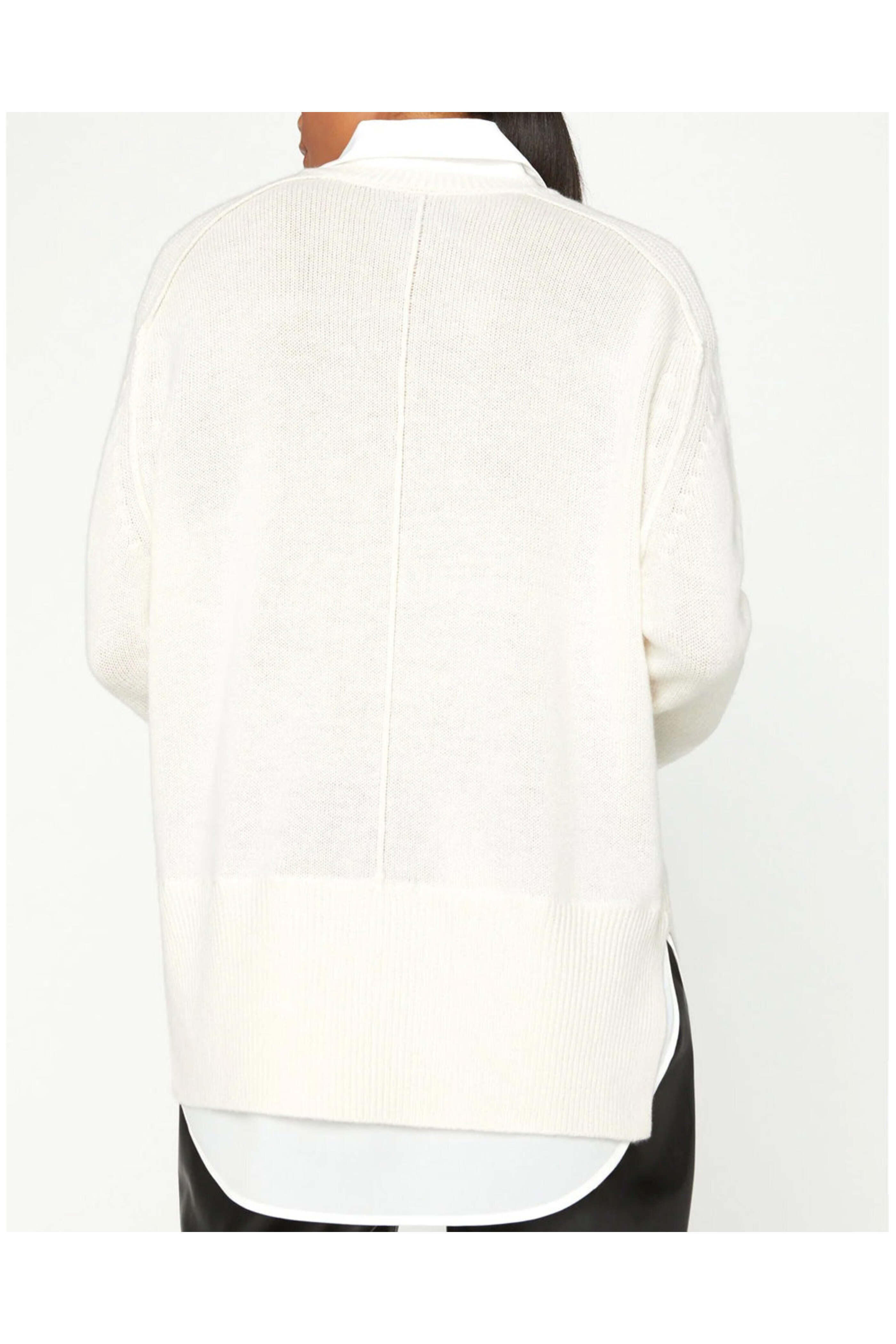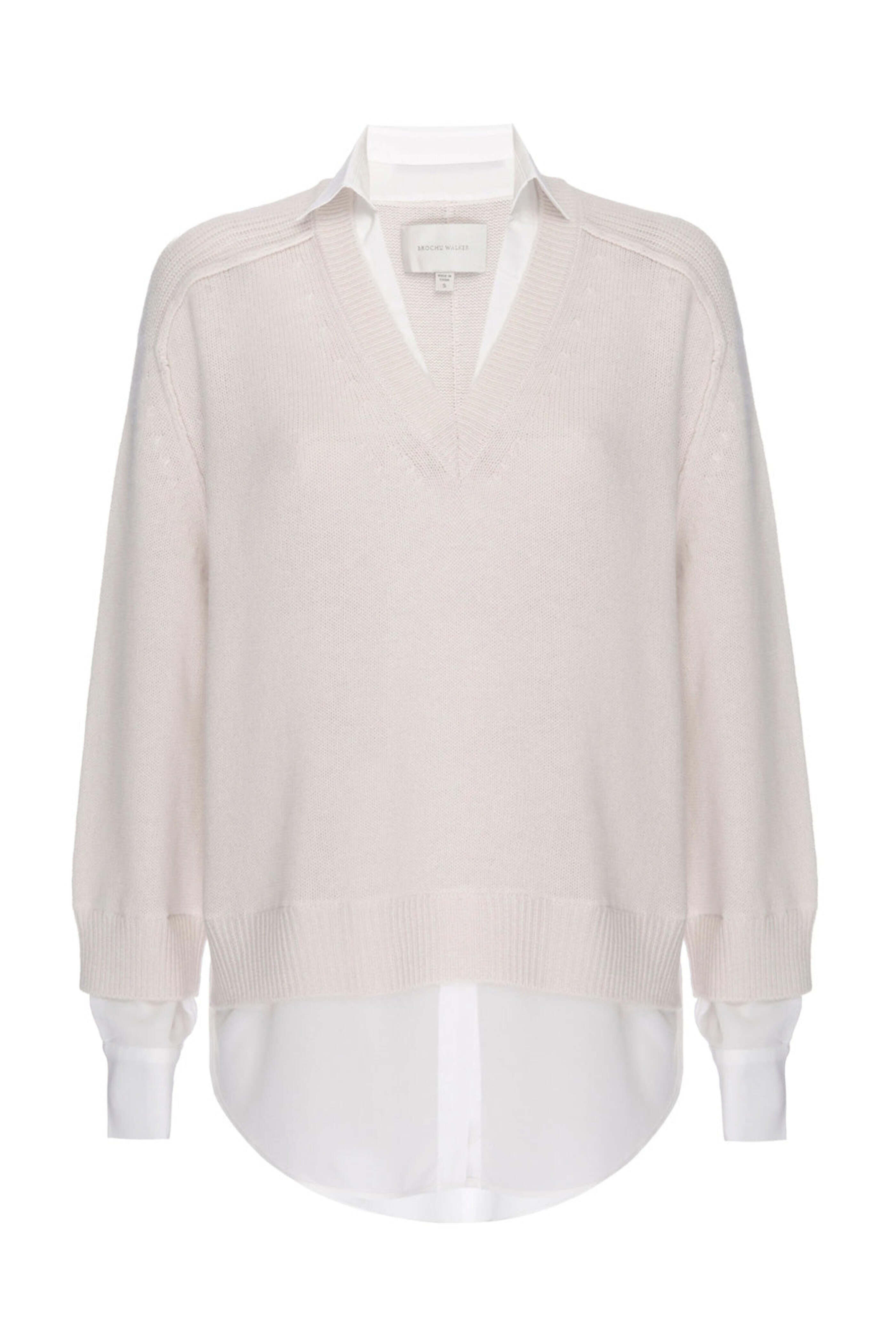 Brochu Walker Almond and White V Neck Layered Pullover. Collar. V neck. Drop shoulders. Long sleeves; button cuff under layer. Oversized fit. Rounded shirttail hem underlayer. 70% wool, 30% cashmere outer 1, 100% polyester georgette.
