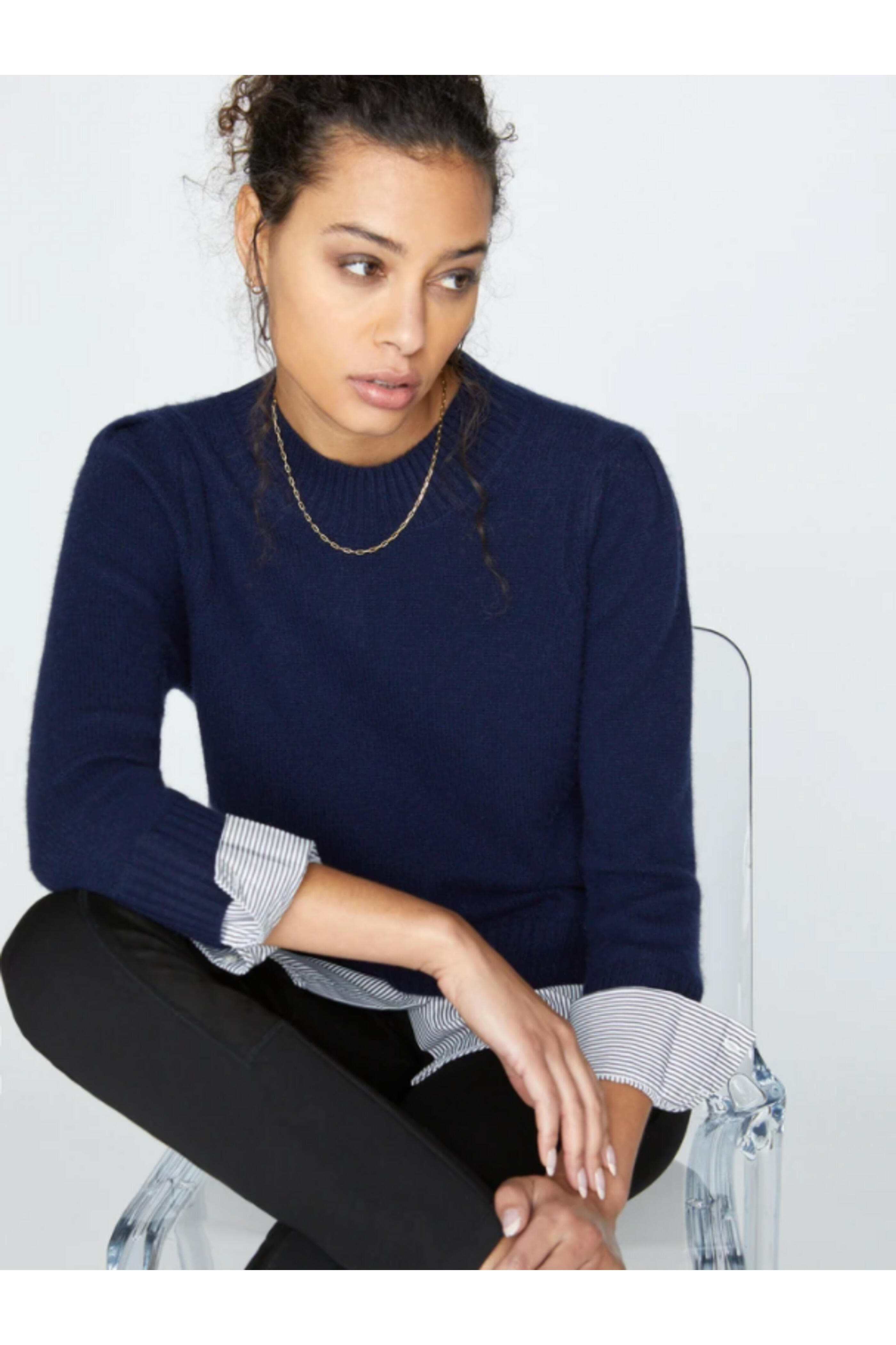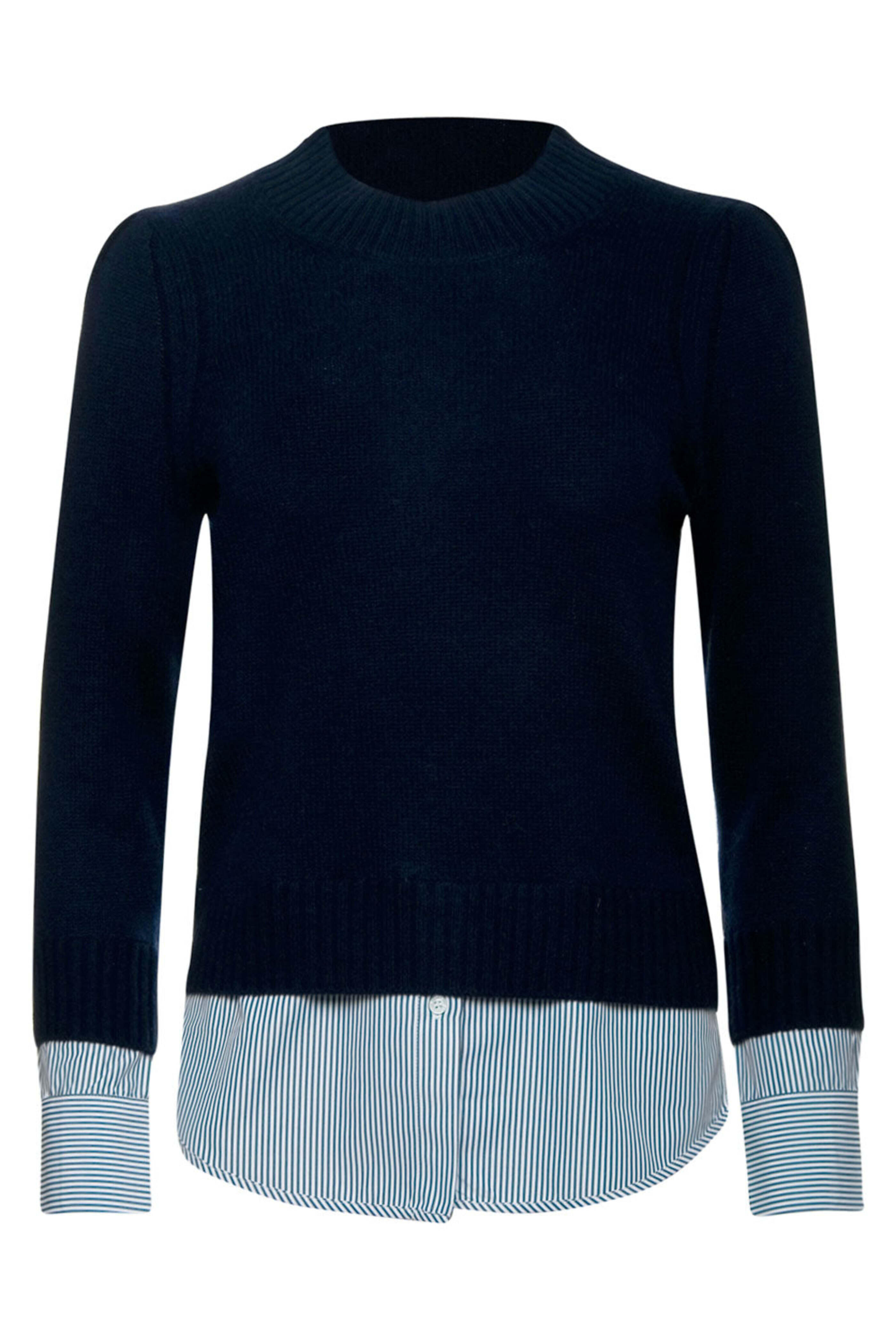 Brochu Walker Navy Stripe Eton Looker Sweater. Crew neck. Long sleeves; faux layer button cuffs. Ribbed collar, cuffs, and hem. Faux layered stirttail hem. Relaxed fit. 70% wool, 30% cashmere outer, 100% cotton underlayer.