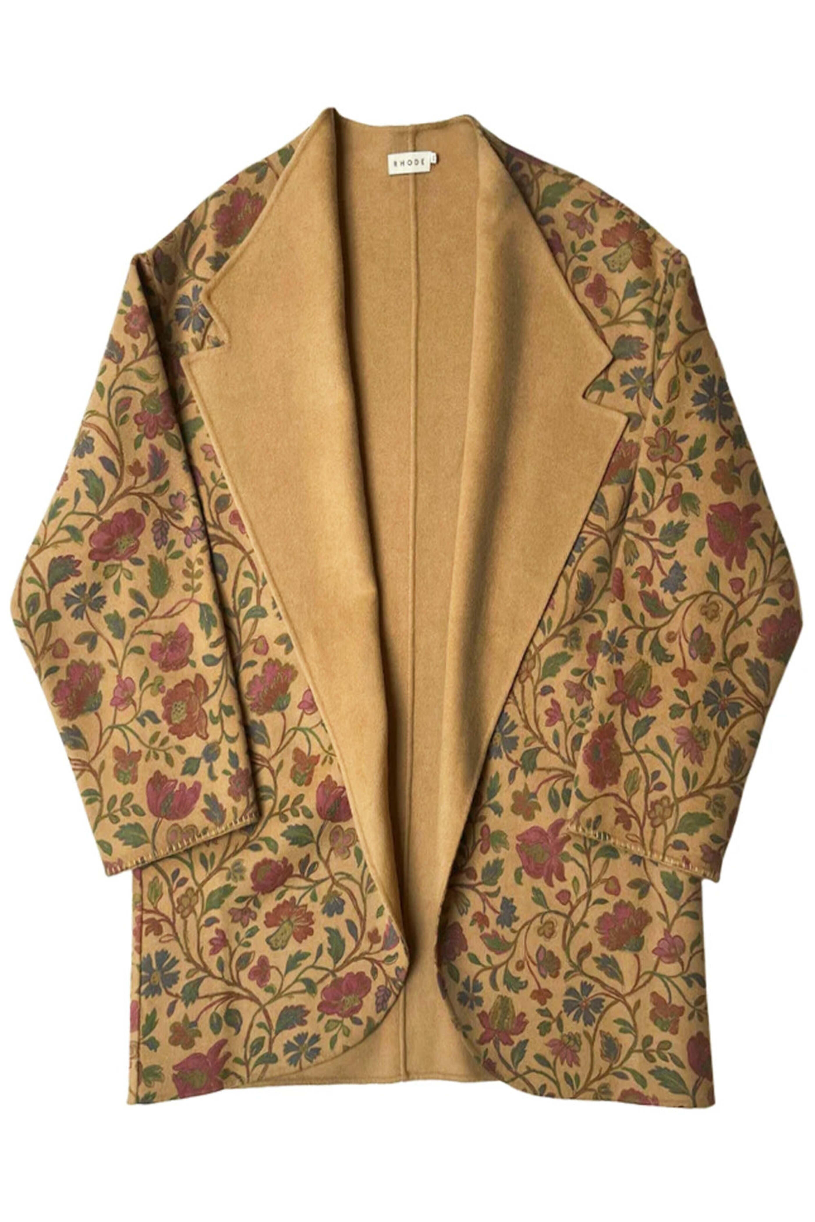 Rhode Cream Vichy Rose Stevie Coat. Notch lapel. Drop shoulders. Long sleeves. Closureless. Relaxed fit. Long length. Reversible style. 89% cotton, 11% flex.