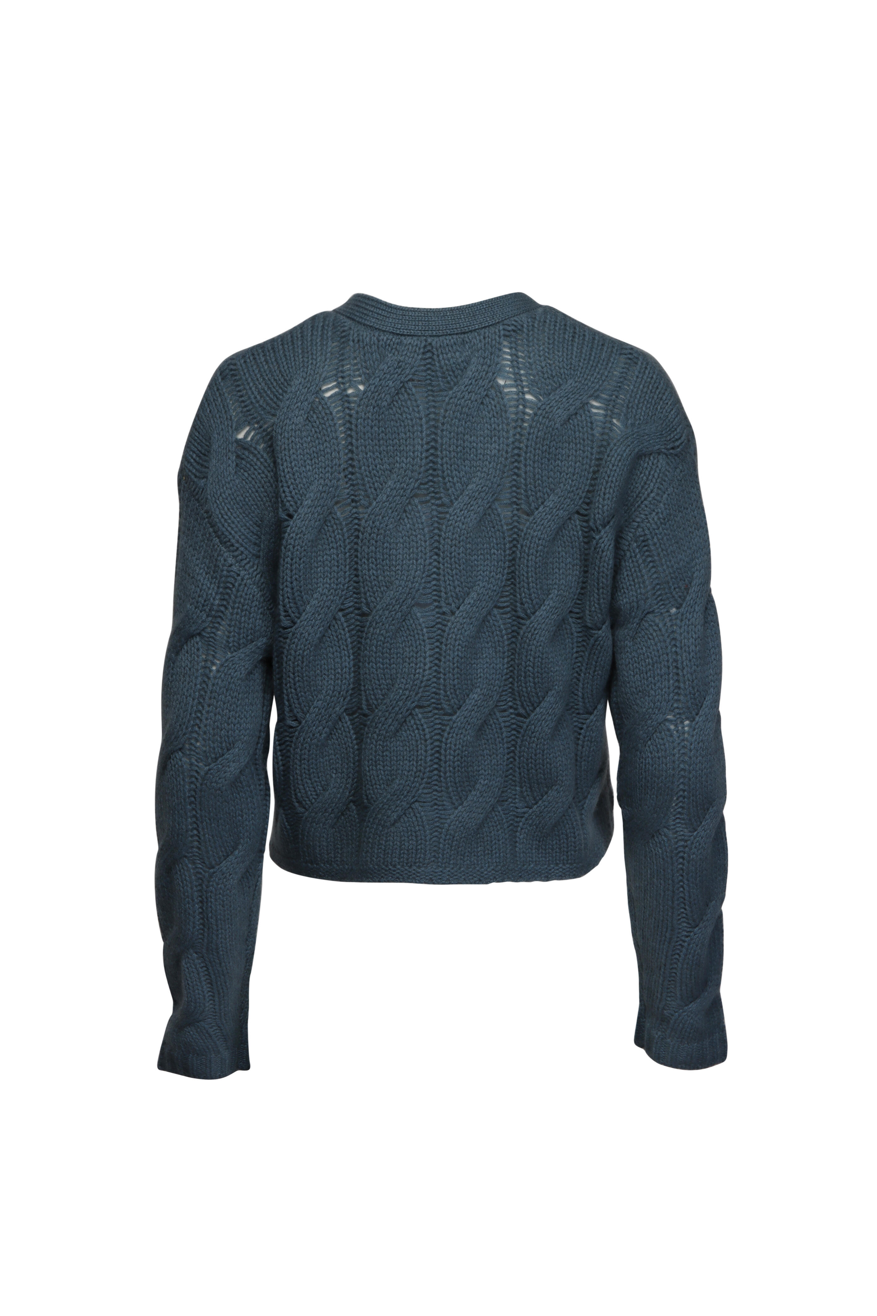 V neck. Drop shoulders. Long sleeves. Button up front closure. Cableknit fabrication. Imported. Cropped length. 100% cashmere. Dry clean.