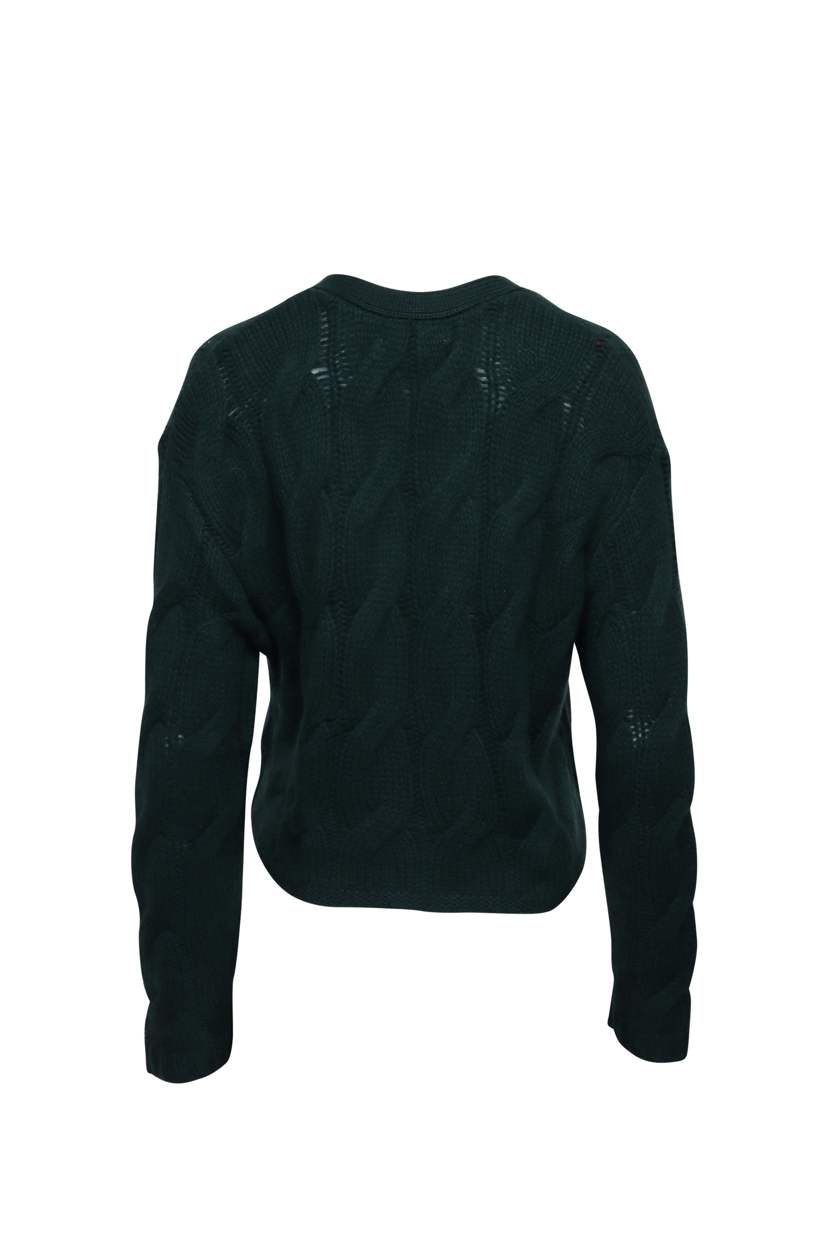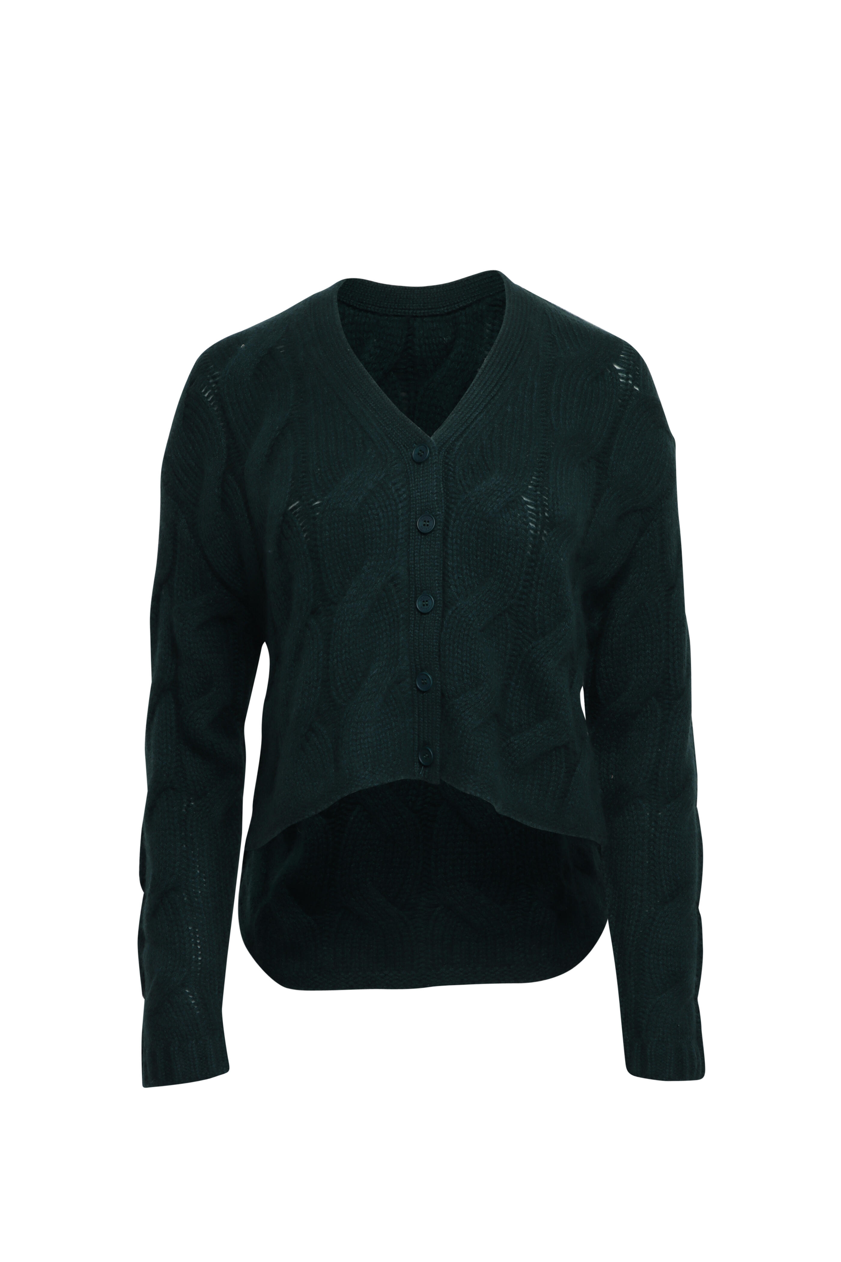 V neck. Drop shoulders. Long sleeves. Button up front closure. Boxy fit. Cableknit fabrication. Imported. Bust 40.5” (Size S). Sleeve 20.5” (Size S). Cropped length. 100% cashmere. Dry clean.