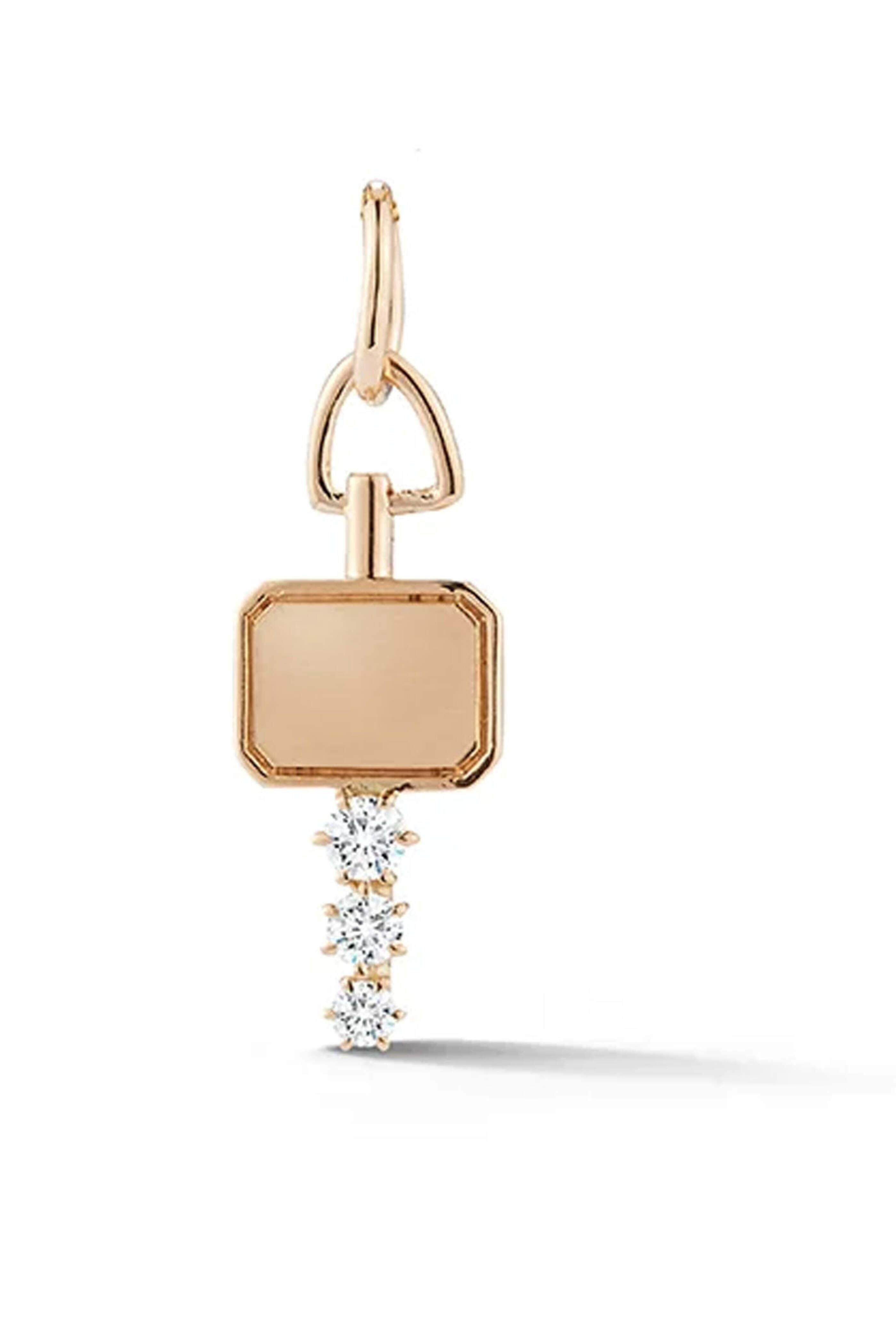 Jade Trau Mini Catherine Key Charm. 18k rose gold. Diamond 0.15 total carat weight. Three round, brilliant-cut diamonds. Key design. 0.59 L x 0.34 W. Gold bail. Made in New York City.