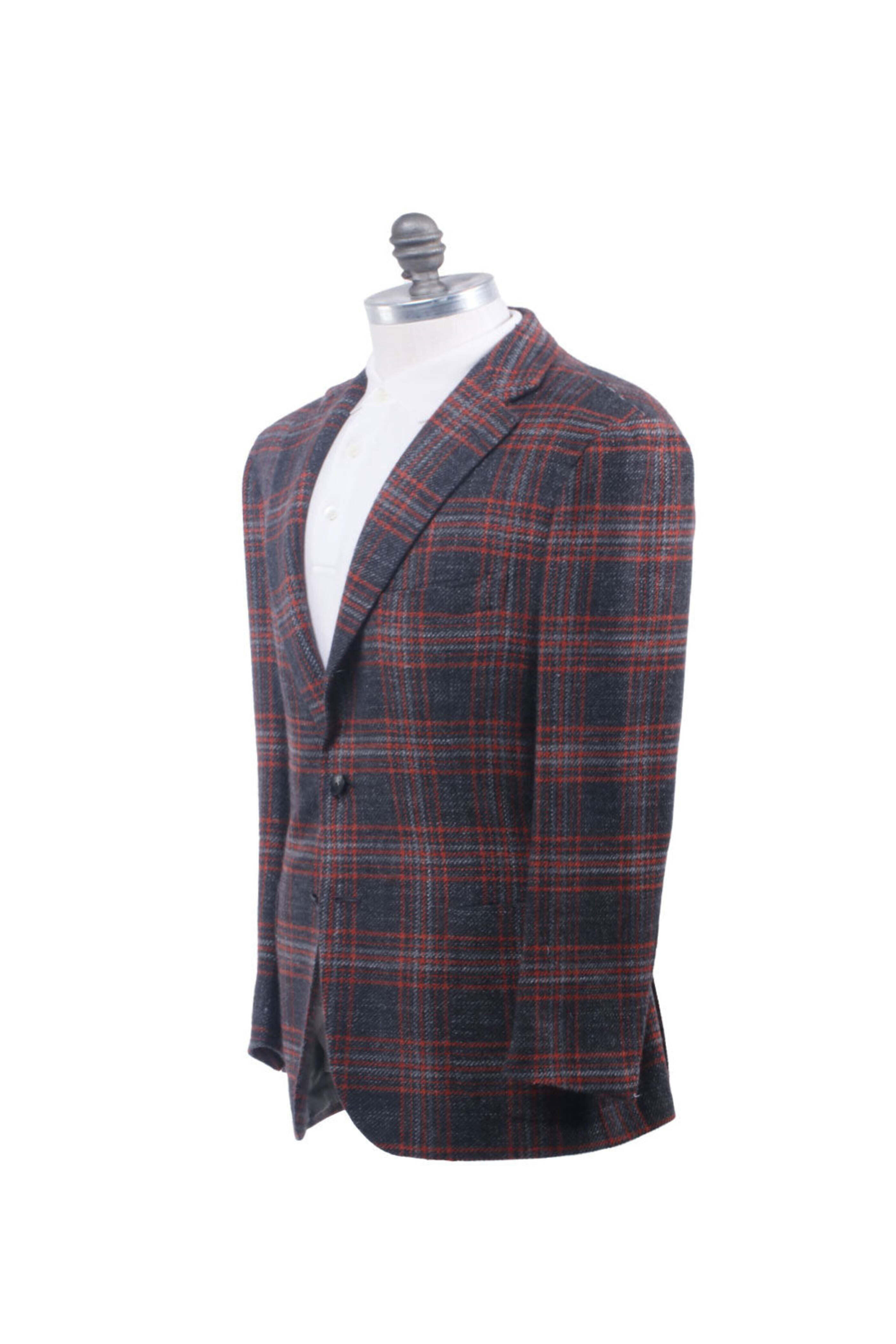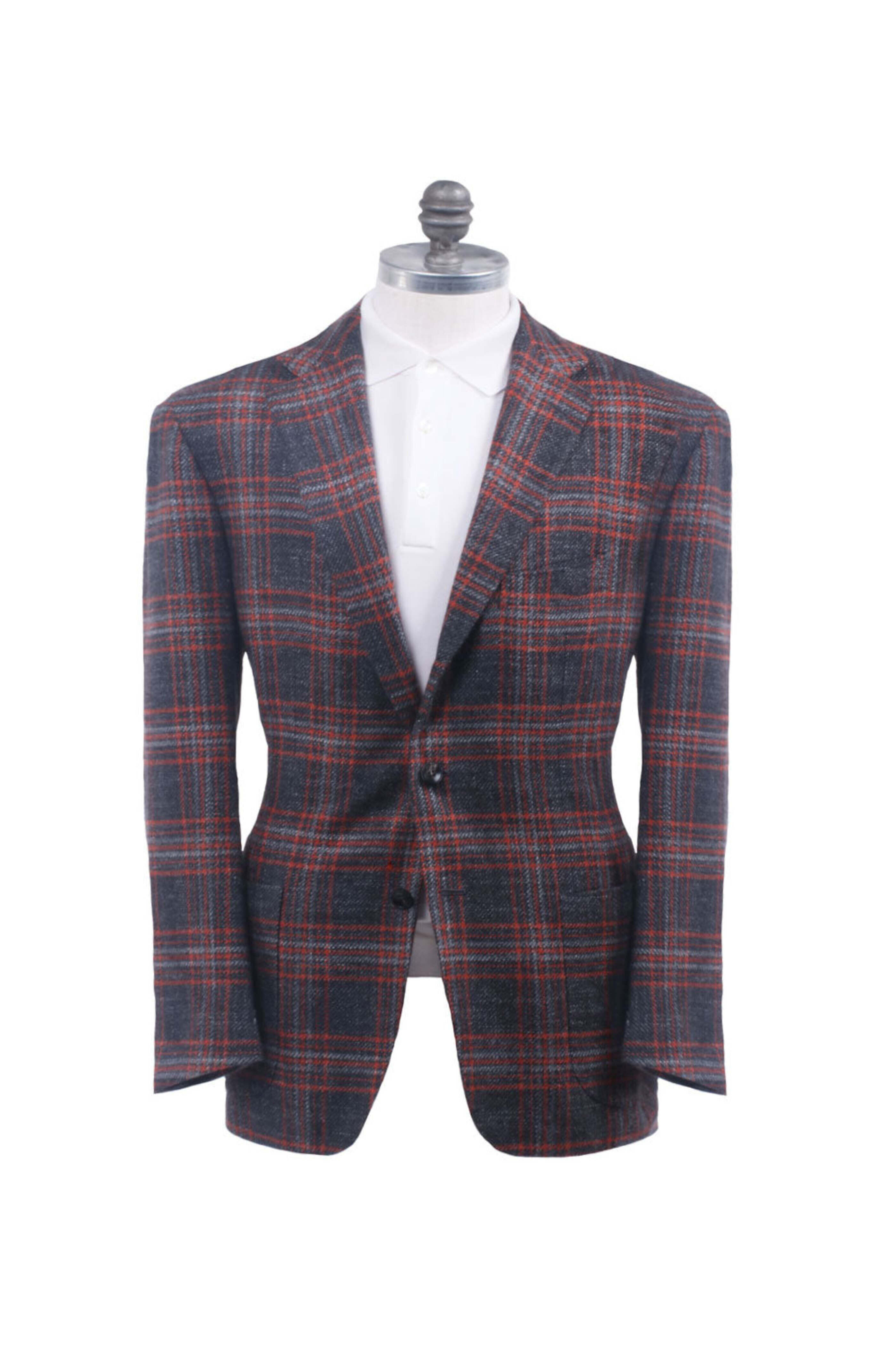 Kiton Orange Plaid Sportcoat. Two button jacket. Front left welt pocket. Waist patch pockets. Double back vents. Unfinished buttonholes. Fully lined. Made in Italy . 56% Cashmere, 22% wool, 13% silk, 9% linen.