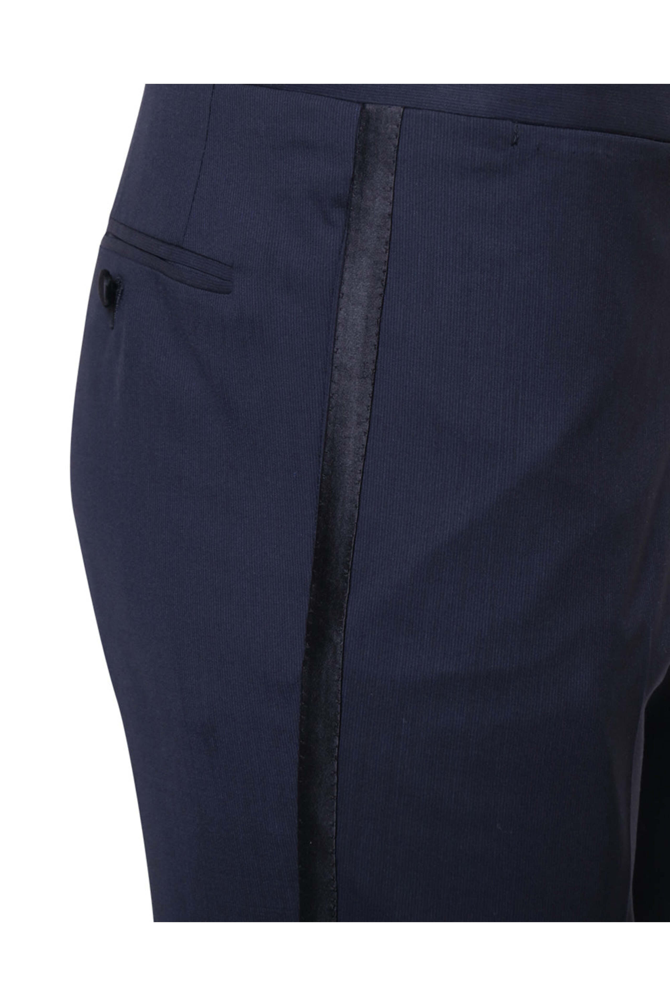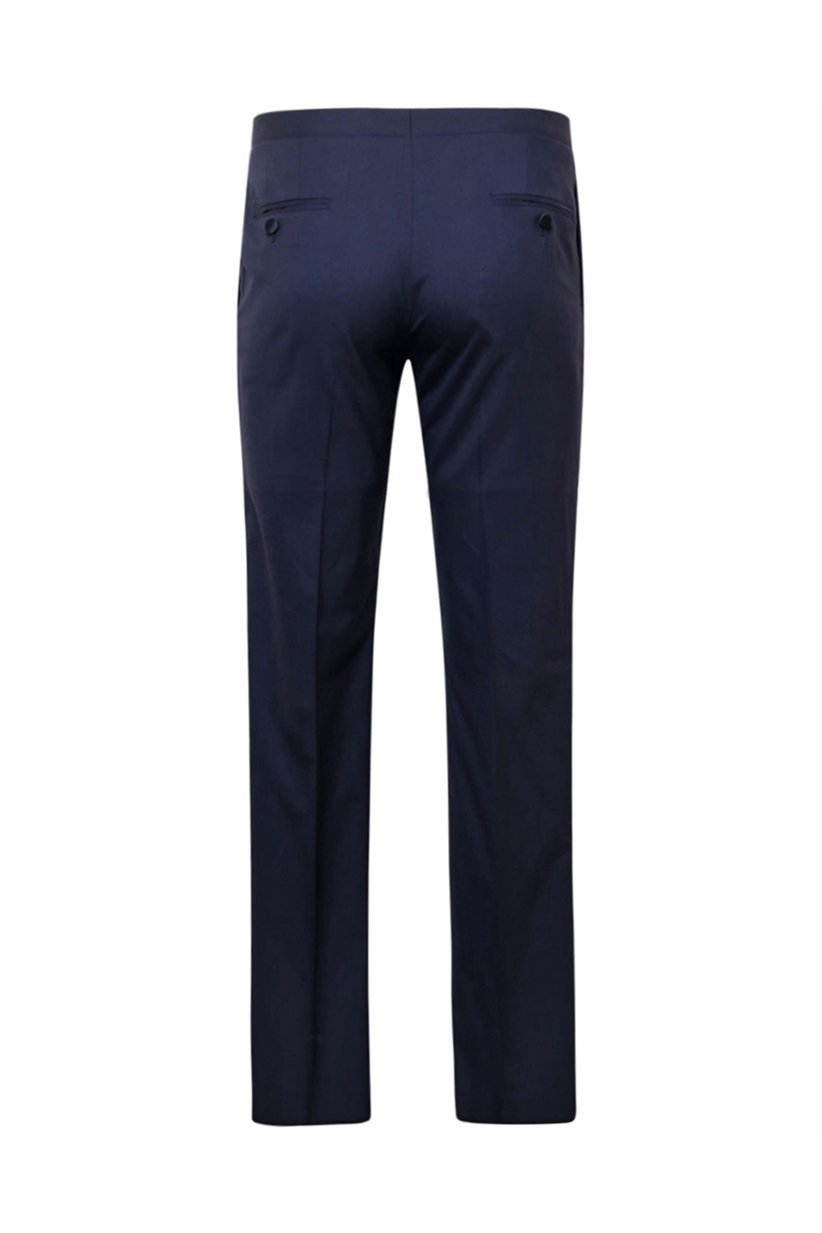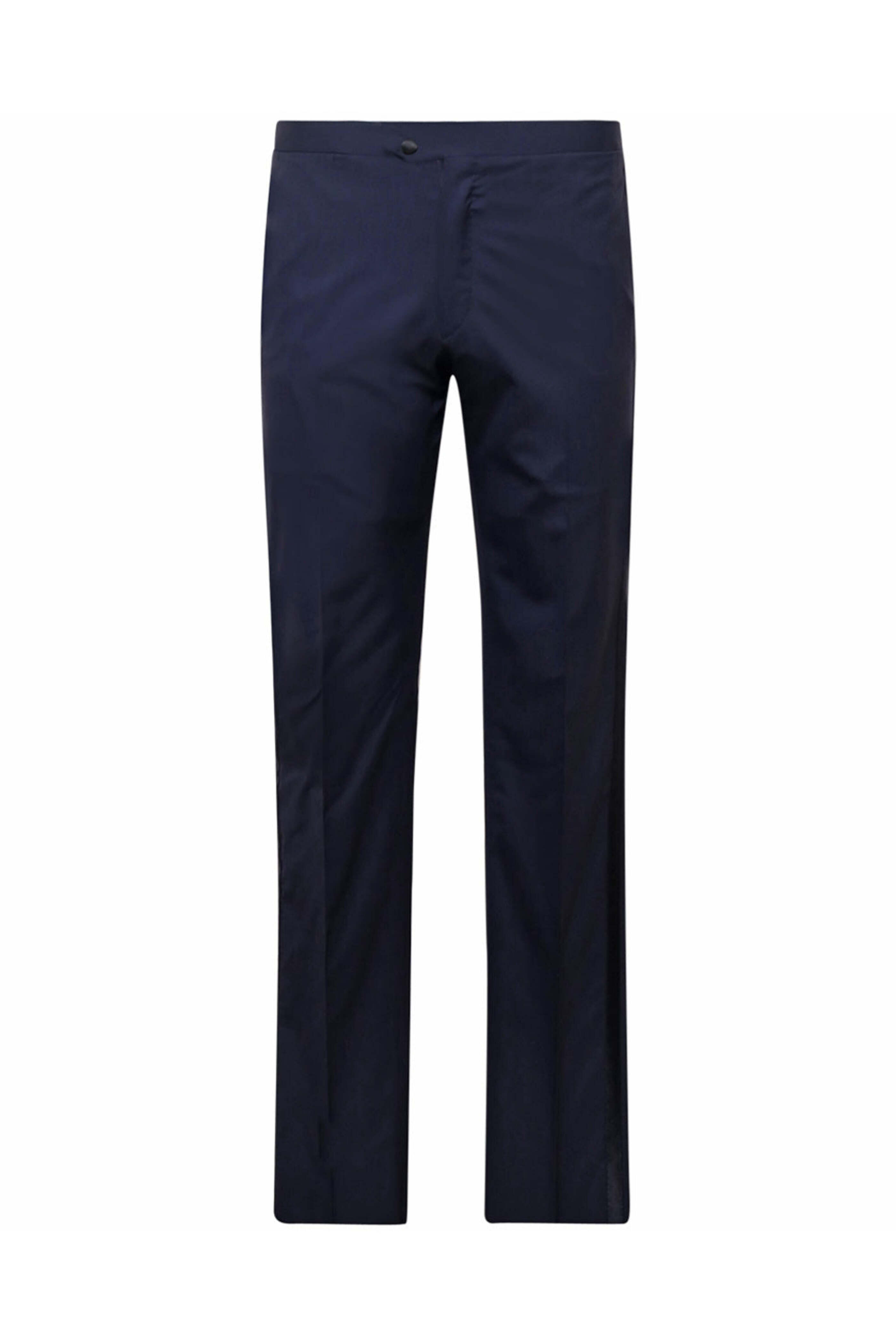 Kiton Dark Navy Formal Trouser. Flat front. Three button closure. Zip fly. Adjustable side-fasteners. On seam waist pockets. Back button welt pockets. Side taping. Unfinished hem. Made in Italy. 100% virgin wool.