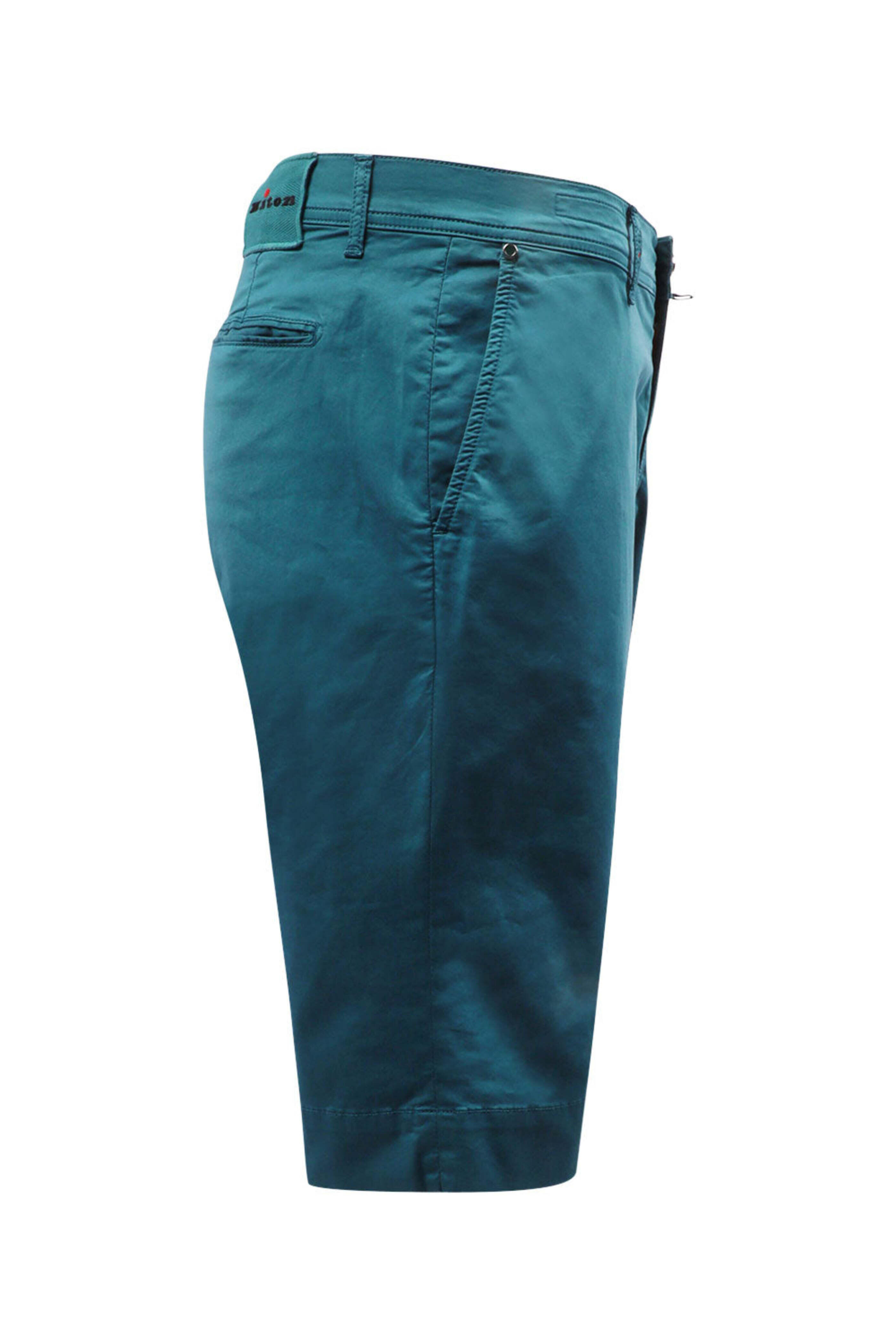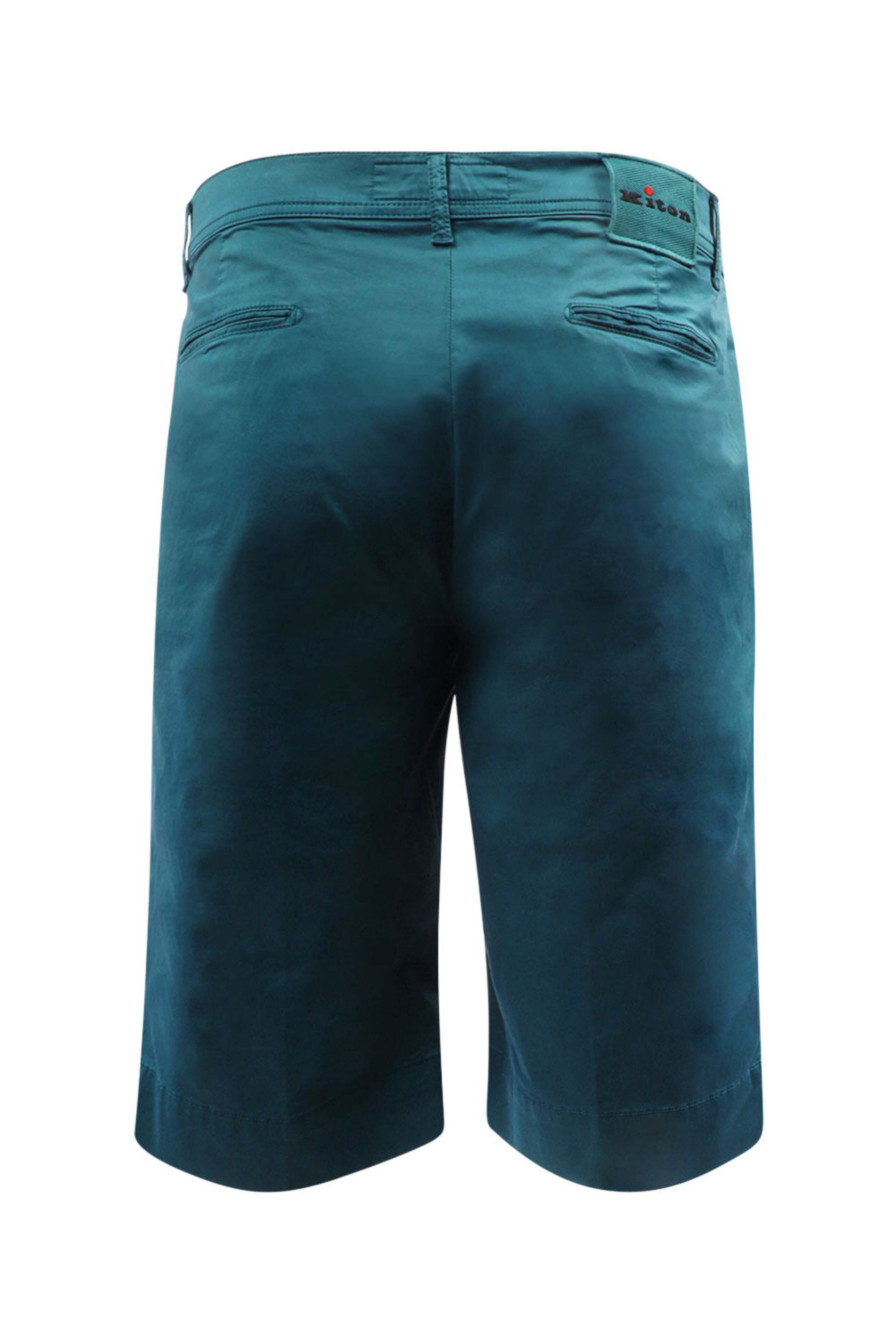 Kiton Bottle Green Cotton Shorts. Flat front. Zip fly. Single button closure. Side pockets. Belt loops. Logo back patch . Inseam 13". Rise: 10.5". Cotton lined. Made in Italy . 97% cotton, 3% elastane.