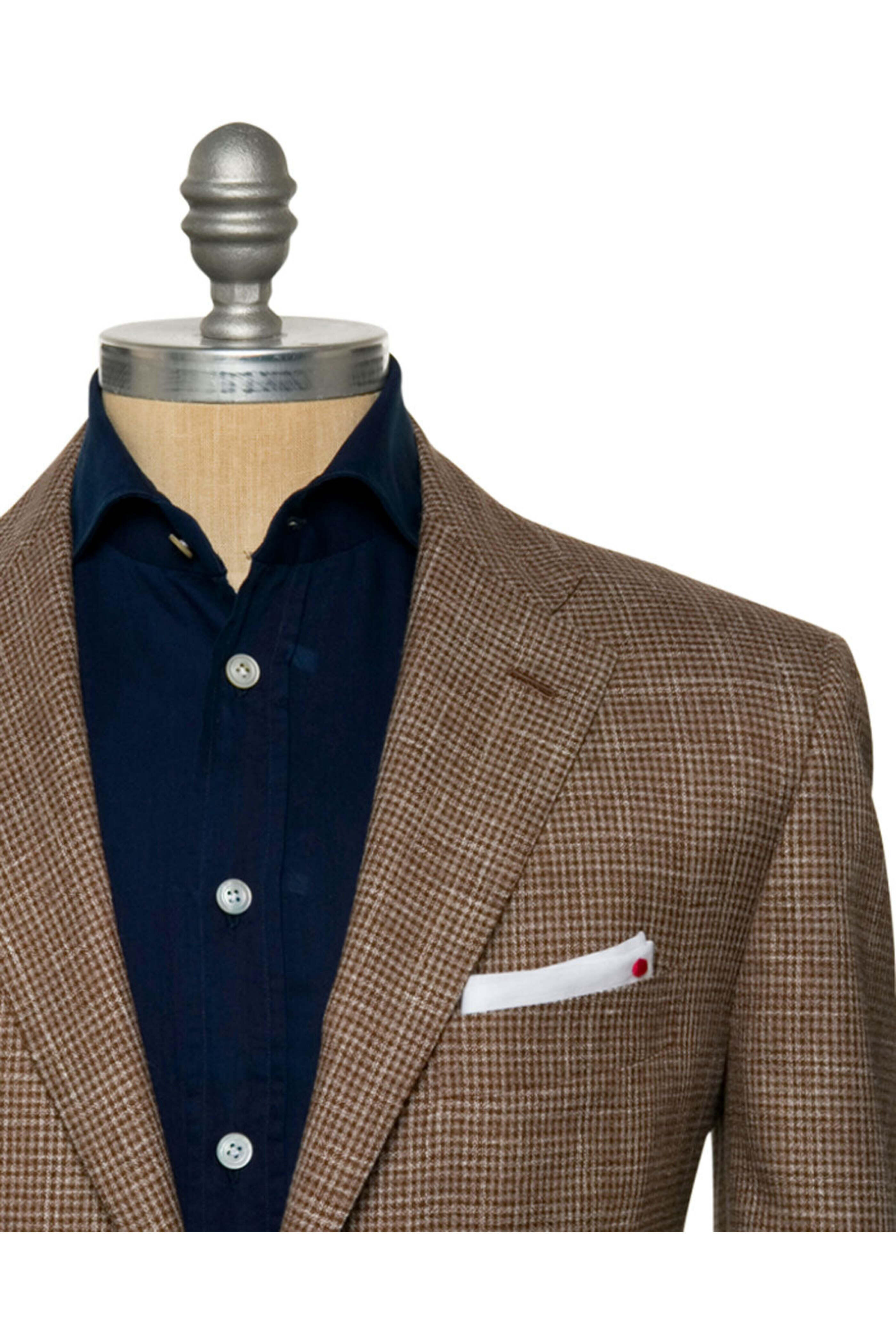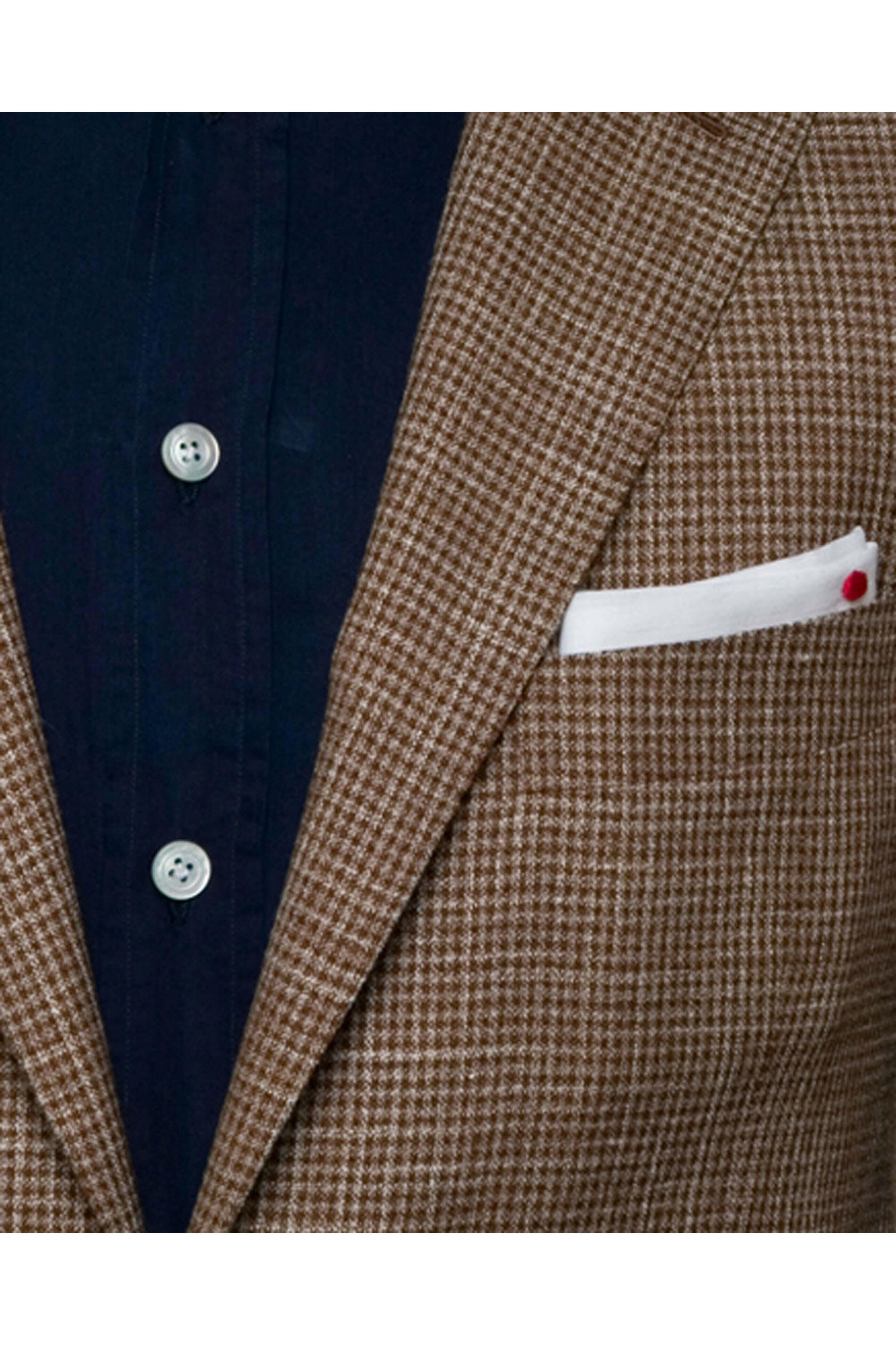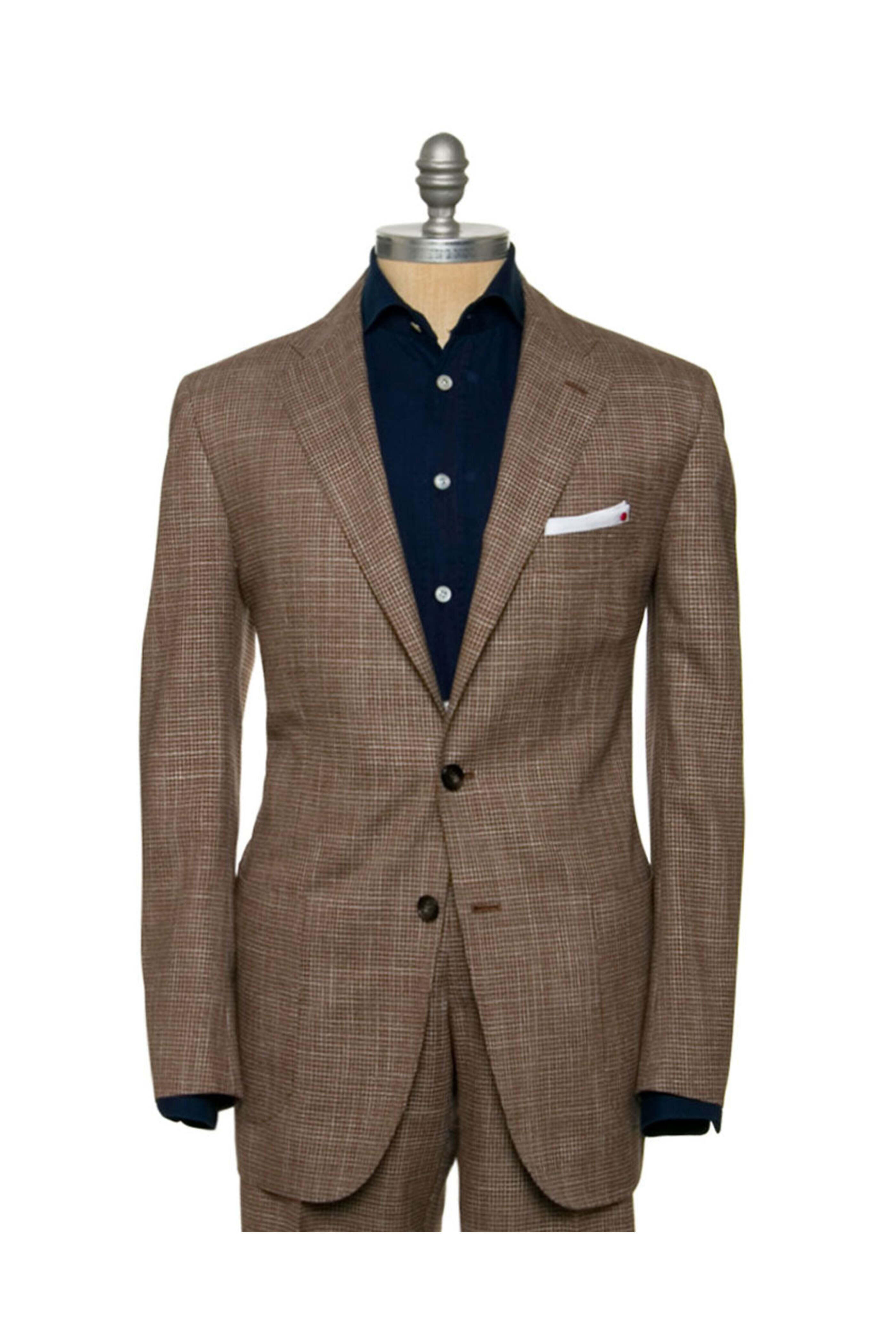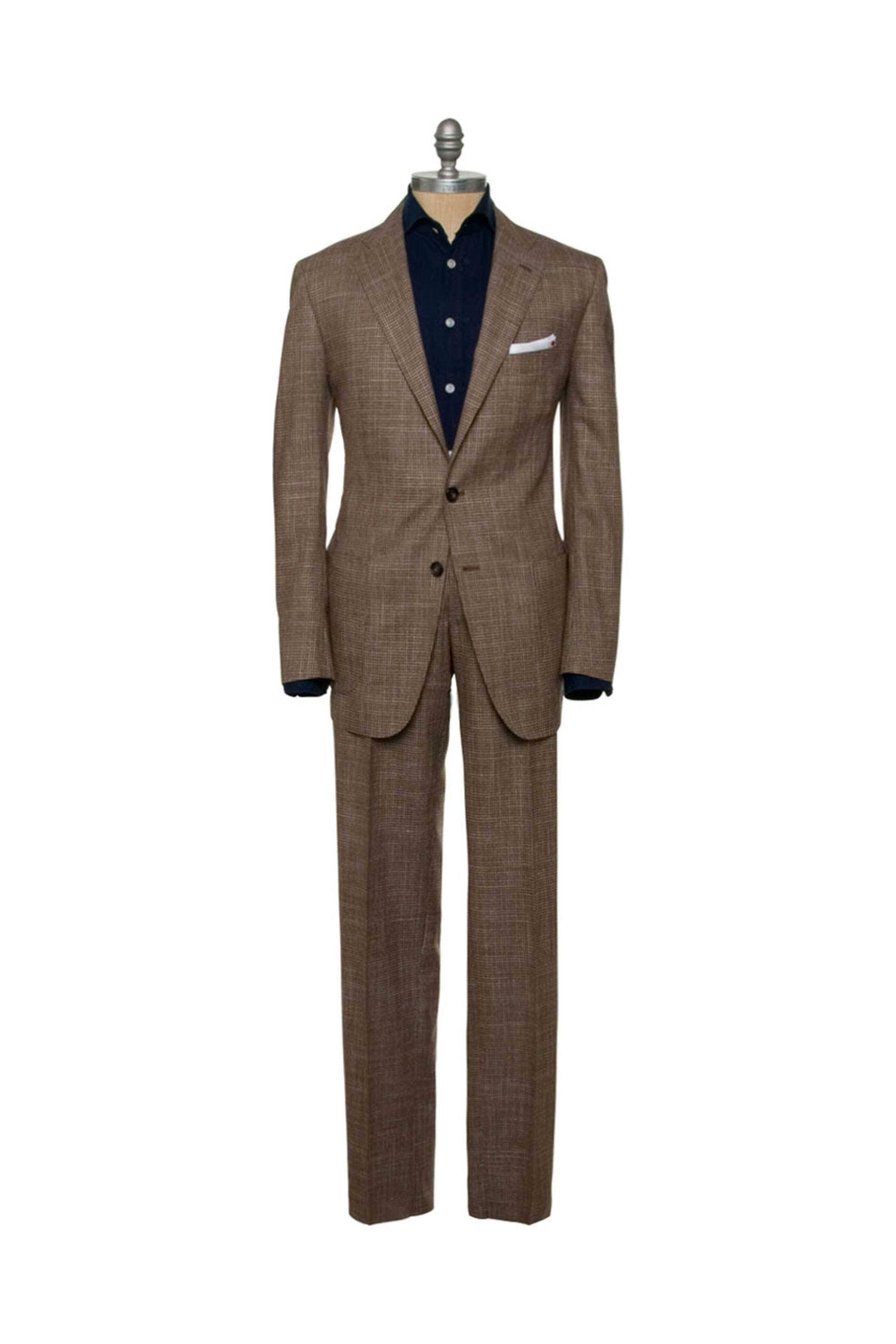 Kiton Moro Cashmere Wool Suit. Three button jacket. Notch lapel. Tonal melton. Pick stitch detailing. Front left chest pocket. Patch waist pockets. Partially lined. Tonal lining. Double back vents. Flat front pant: Zip fly. Coin packet. Double welt button back pockets. 10.5" rise. 7.5" opening. Drop: 7". Handmade in Italy.