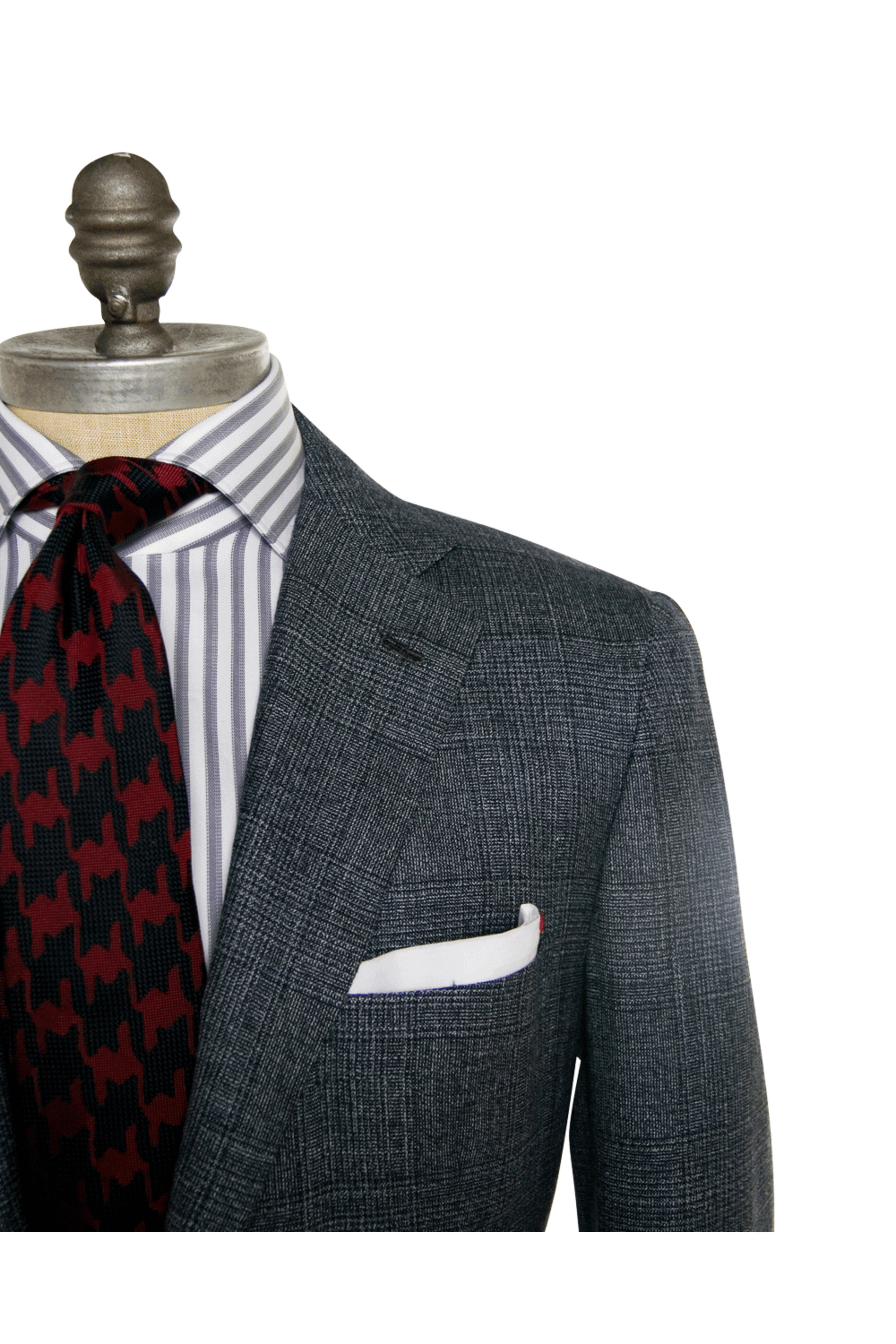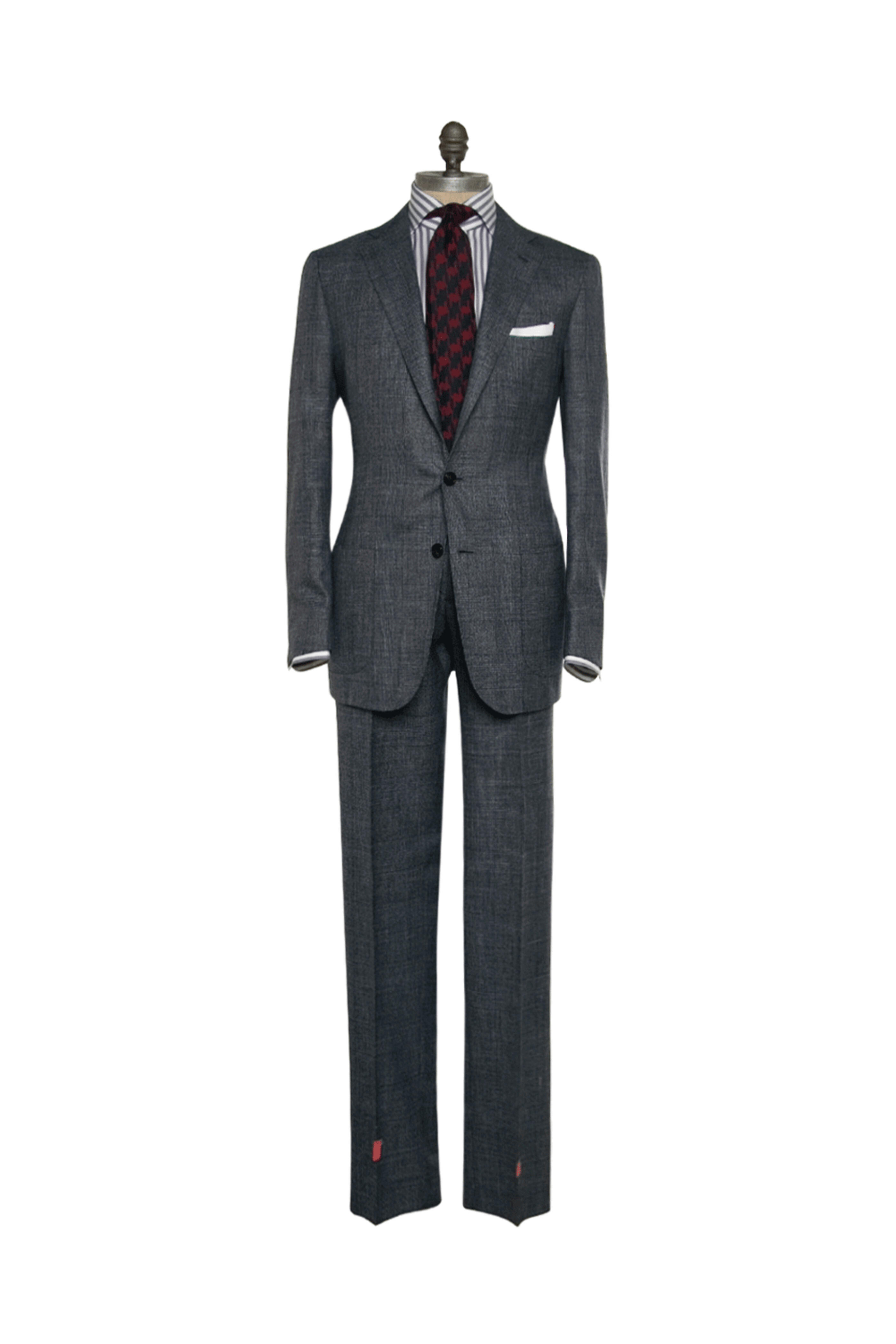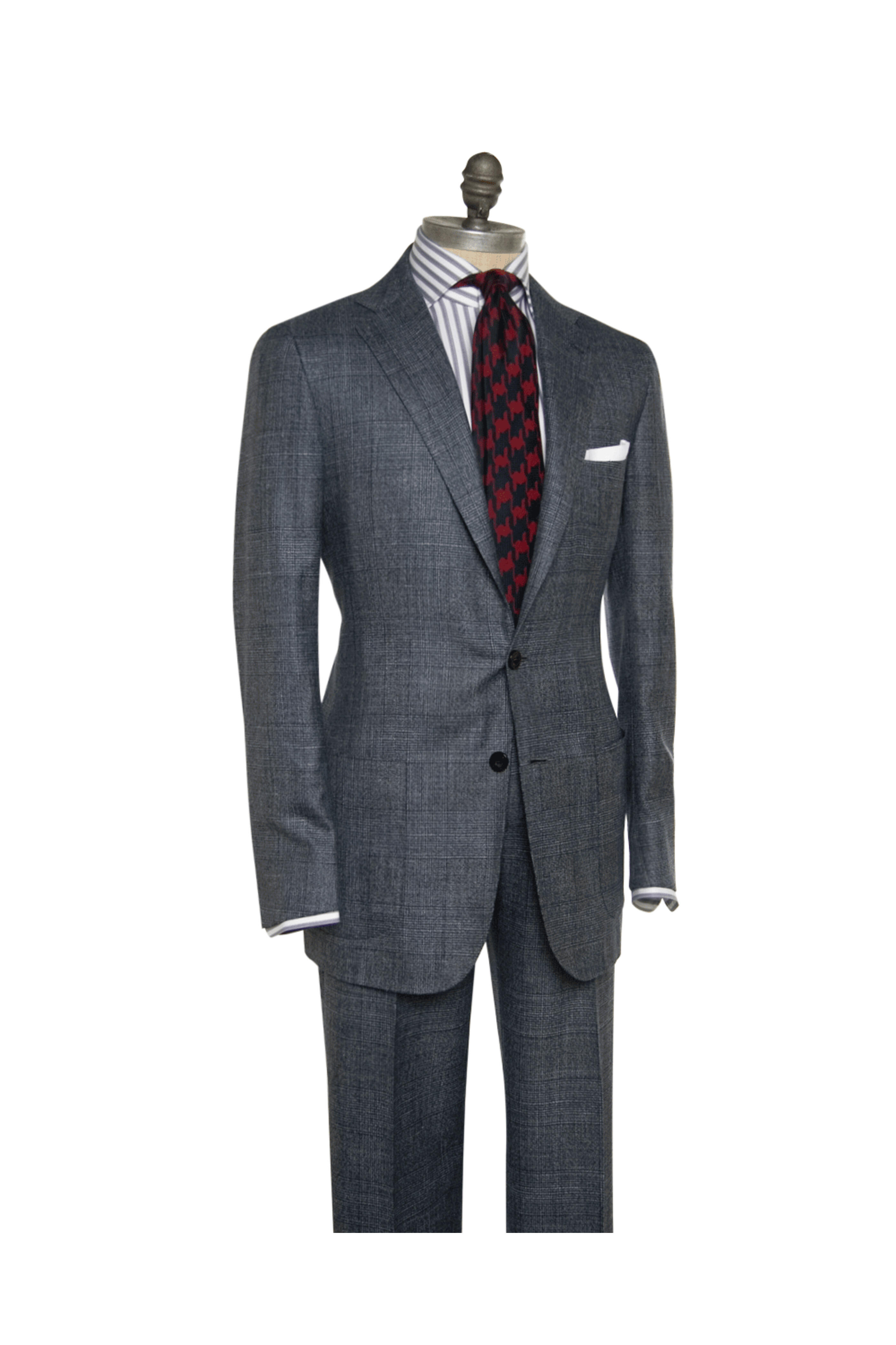 Kiton Blue Tonal Glen Plaid Suit. Notch lapels. Two button jacket. Front left chest welt pocket. Waist patch pockets. Double back vents. Unfinished buttonholes. Pick stich detailing. Quarter-lined. Drop: 7. Cupro lining. Flat front pant: Zip fly. Three button closure. Belt loops. Side pockets. Coin pocket. Single button back welt pockets. Unfinished hem. Measurements based on size 50: Inseam: 36. Rise: 10.5. Hem opening: 7.5. Made in Italy. 75% cashmere 15% linen 10% silk.